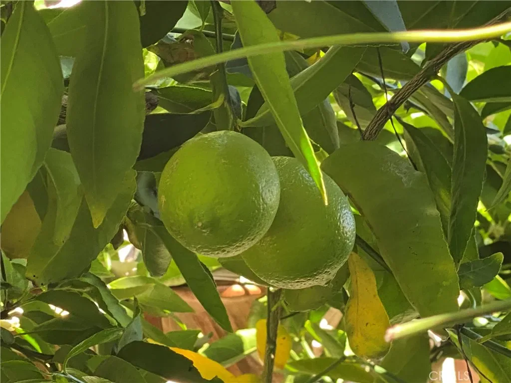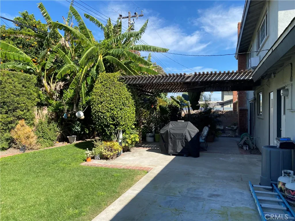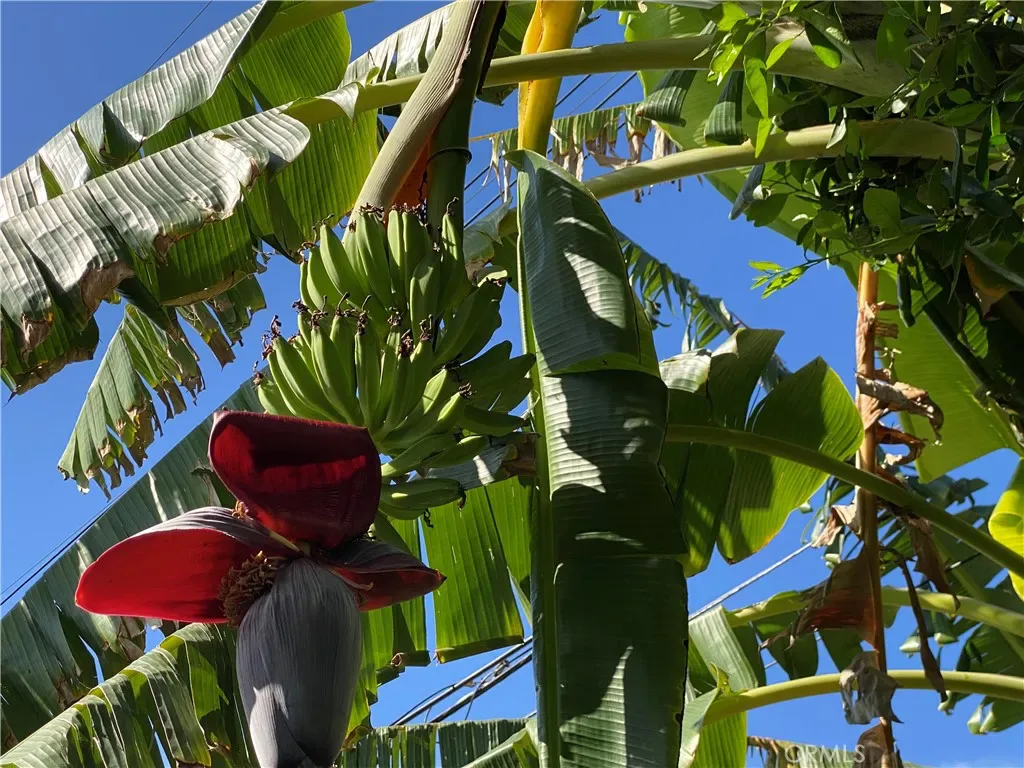 The backyard features a covered patio, and fruit trees including banana, lemon and avocado!