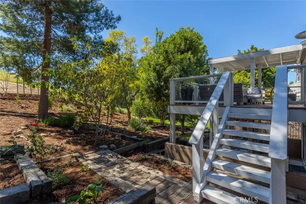 The backyard is truly a garden retreat, featuring a diverse collection of fruit trees and plants, including two peach trees, apple, lemon, lime, orange, and tangerine trees, along with raspberries, grapes, blackberries, and even a macadamia nut tree—offering a unique farm-to-table lifestyle right at home.