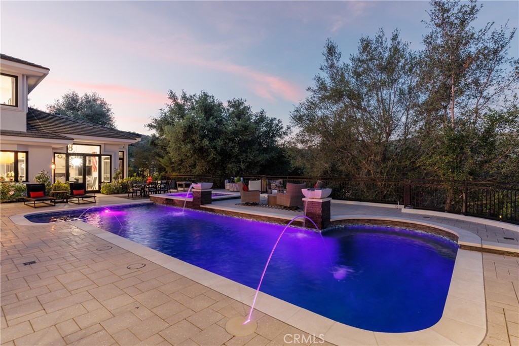 Welcome to 8 Palomino, a custom estate rich in architectural detail located in the prestigious guard gated community of Coto de Caza, within the highly sought-after Woods neighborhood. Set on nearly 1.2 acres, it offers approx 7,100 sqft of thoughtfully designed living space, with 7 beds/6.5 baths, & stunning views of the Saddleback Mountains from both the front & rear of the home. A private gated driveway sets the tone for this exceptional property. The main level showcases wide-plank white oak flooring & an expansive great room designed for both everyday living & entertaining. The kitchen is a chef’s dream boasting an oversized island with exquisite quartz countertops & stainless steel high end appliances (including a 46” Sub-Zero refrigerator & freezer and Wolf cooktop, double ovens, & warming drawer), walk-in pantry, prep sink with vegetable sprayer, coffee bar, and dual beverage drawers. The kitchen flows seamlessly into the breakfast nook and family room, highlighted by soaring ceilings, designer lighting, a fireplace, and an abundance of windows and doors that fill the space with natural light and open to the backyard. Additional main-level features include a formal dining room with coffered ceilings, a living room with fireplace and statement bar, a private office, oversized laundry room, a movie room / den, and two staircases for convenience. Two ensuite bedrooms are also conveniently located on the first floor. Designer touches and custom finishes are found throughout from the lighting to the powder room and bar area wrapped in Versace wallpaper. Upstairs, the primary suite offers a private retreat with its own balcony, fireplace, and sweeping views. The elegant spa-inspired primary bath features marble floors, oversized shower with marble surround, a freestanding soaking tub, and a stunning custom walk-in closet with center island. Completing the upstairs are 4 additional large bedrooms and 3 beautifully appointed bathrooms, along with a lounge area and two balconies. The resort-style backyard features a pool, spa, four fountains, two fire features, multiple seating areas, and a fully equipped outdoor kitchen and covered room complete with a pizza oven, smoker, BBQ, and ample counter space. The lower level of the property offers a large, flat pad—ready to be customized to suit your vision. The ideal blend of privacy, luxury, functionality, and design, 8 Palomino is a rare offering in one of Orange County’s most exclusive communities.