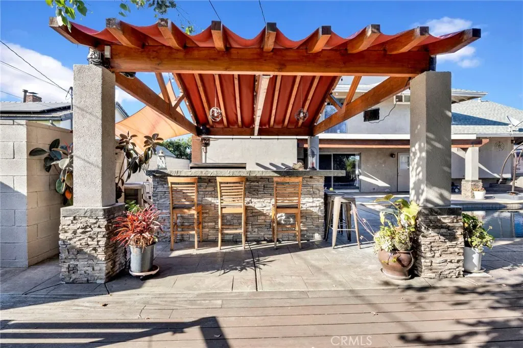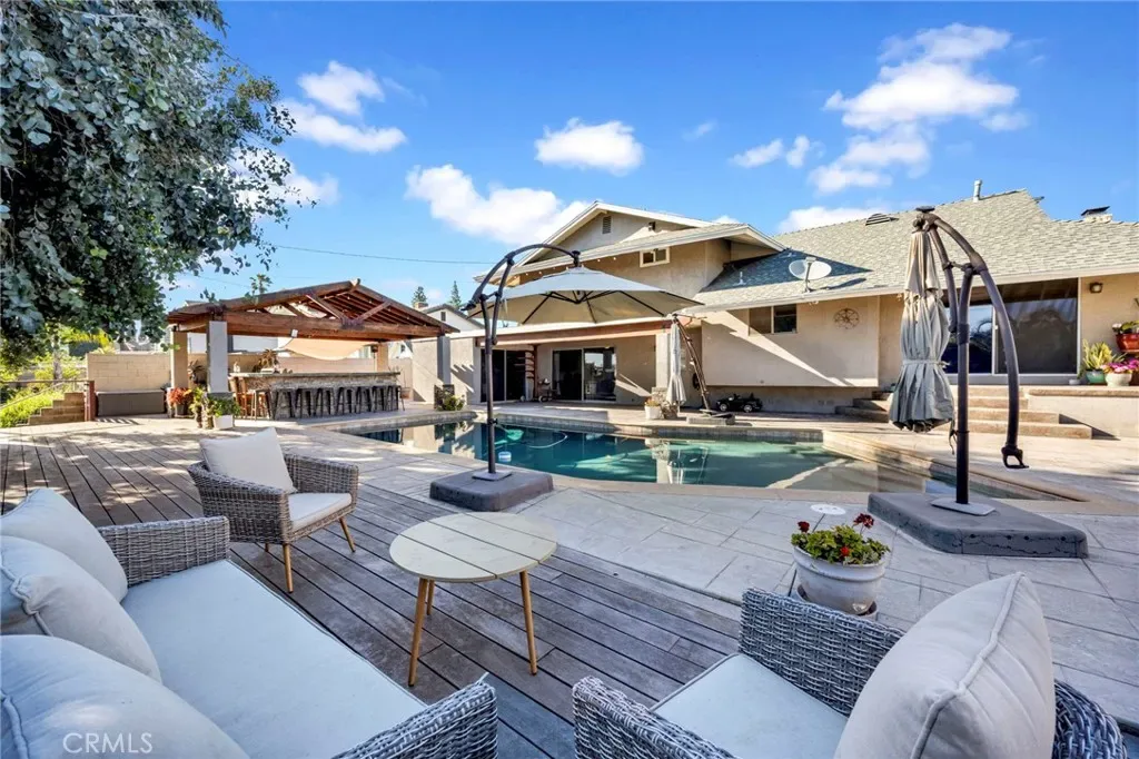 Outdoor living shines here: the expansive backyard includes a raised deck nestled among mature eucalyptus trees, a built-in natural gas grill, and a stone trellis beside the PebbleTec pool. These well-designed outdoor amenities create a true resort-style atmosphere perfect for hosting guests or unwinding at home.