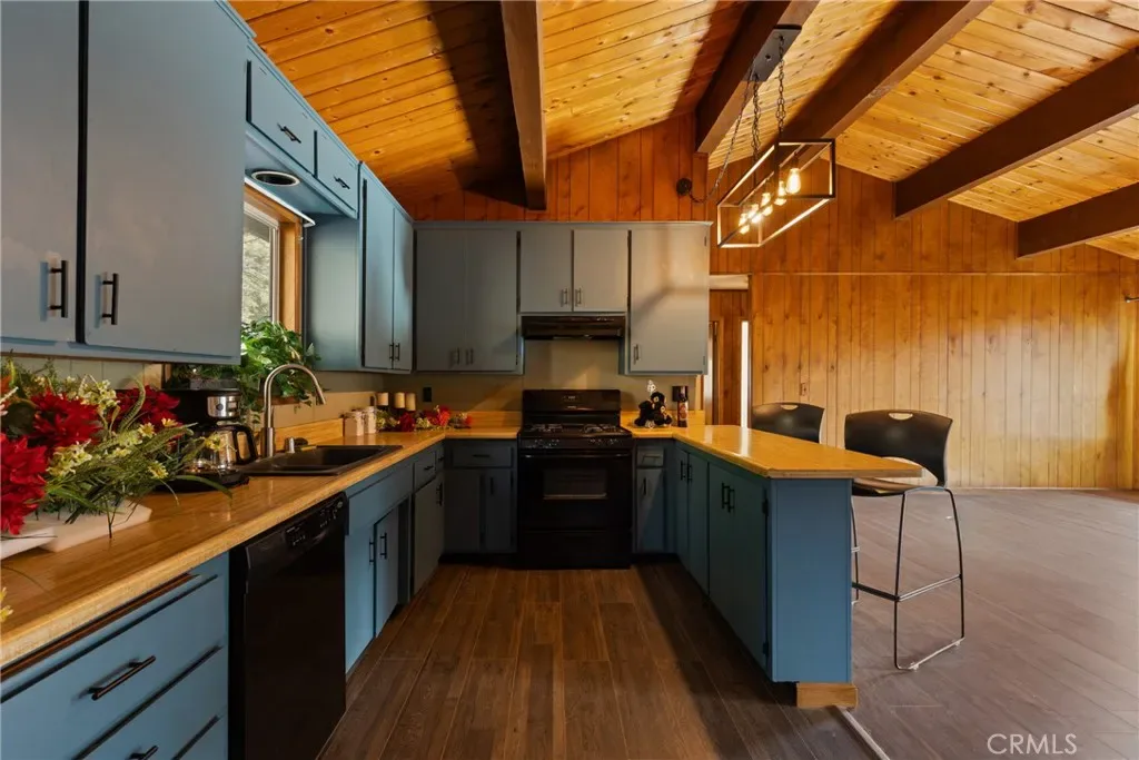 Step inside to a spacious family room where soaring wood-beamed ceilings, tongue and groove wood paneling, and a stunning rock cladded center fireplace create a warm mountain ambiance. Just off the main living area, double doors open to a covered upper patio…perfect for relaxing or entertaining. The kitchen offers ample cabinetry, updated lighting, and included appliances.