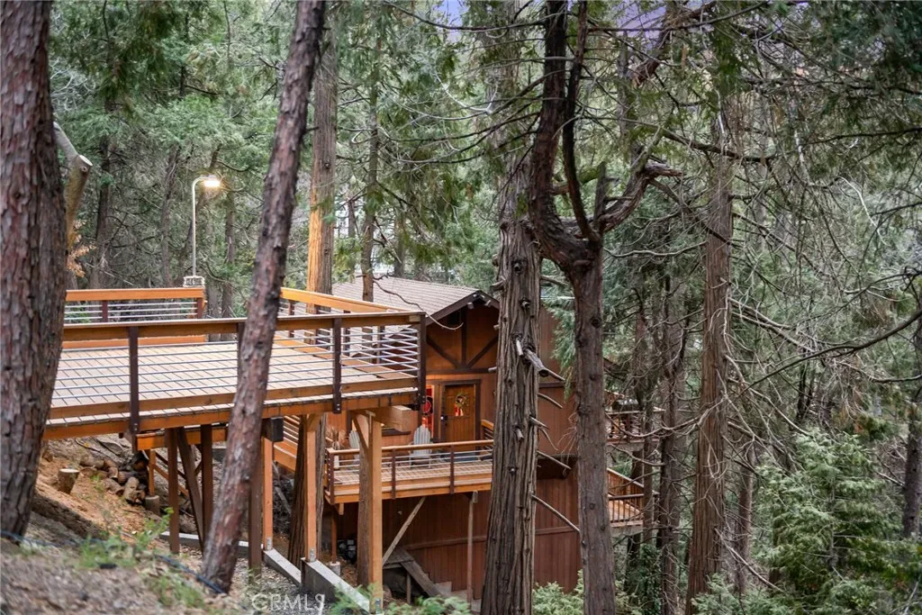 Forest retreat minutes from Lake Gregory with fireplace, game room, and dual decks.