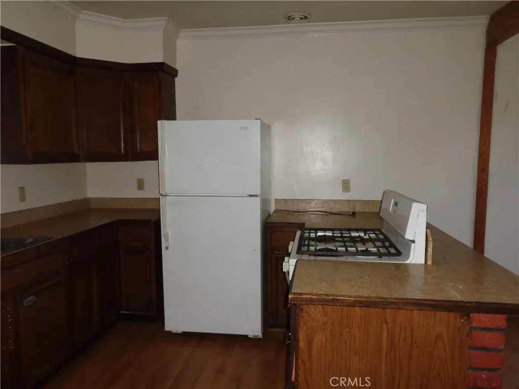 Great opportunity to own a home in Crestline. House includes 3 bedrooms on the second floor with a half bath on this floor. Carpeting in all bedrooms and living room. Laminate flooring in kitchen. Lots of counter space in kitchen and includes a walk in pantry and large eating area. Rock fireplace in living room is wood burning. Full bathroom on 1st floor with laundry hook ups. Small deck at rear of house off living room. Build up has lots of space for storage with a concrete floor. Property goes street to street from Coulter Pine to Crestforest. Check it out today.