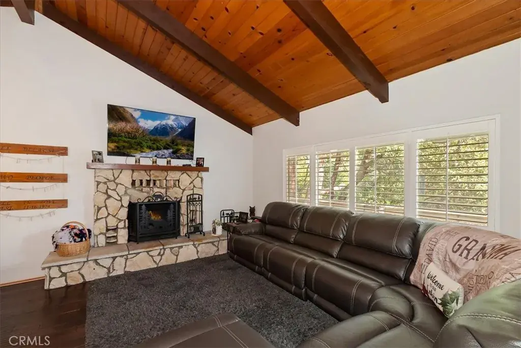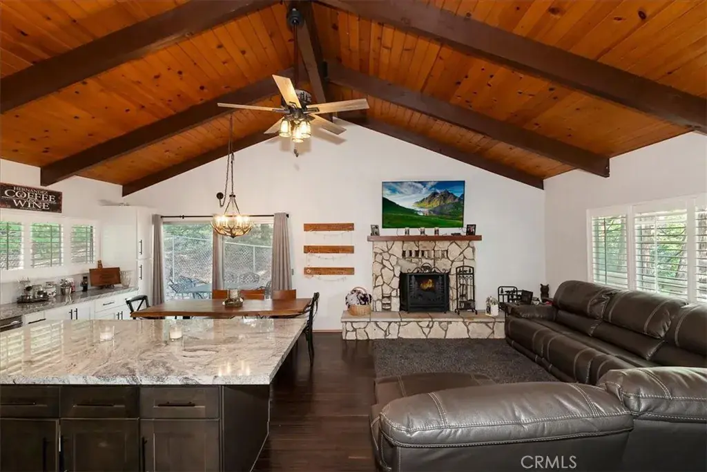 This home showcases a kitchen where no expense was spared. Whether your client dreams of a chef-inspired space or simply values generous counter space, this kitchen delivers. It features fully updated appliances, including a six-burner stove and a convenient two-drawer beverage refrigerator. A beautiful center island stands as a striking centerpiece. The kitchen flows seamlessly into the spacious living room, which boasts soaring vaulted ceilings and a cozy fireplace—ideal for cold winter nights. Updated laminate flooring runs throughout the home, adding both style and functionality. A dedicated laundry area in the hallway includes cabinets above the washer and dryer for added storage. The hall bathroom offers a sleek walk-in shower. The primary bedroom is generously sized, featuring a large closet and a private bath with a full tub. The second bedroom also offers ample space for family or guests. Elegant plantation shutters accent every window, providing both charm and light control. A sliding glass door off the dining area opens to a perfectly level, fenced yard—ideal for children, pets, or relaxed outdoor living. This mountain home reflects true pride of ownership and is ideal as either a full-time residence or a serene vacation getaway.