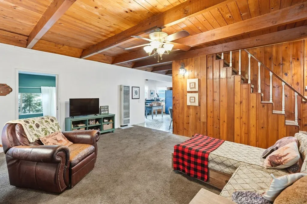 Just a few easy steps lead to the front door. Inside, you’ll find a spacious kitchen filled with natural light from large windows, plus a dining area that’s great for family meals. The living room features beautiful tongue-and-groove wood accents that create a true mountain feel, along with a cozy fireplace for those chilly nights.
