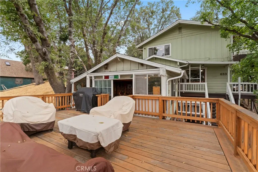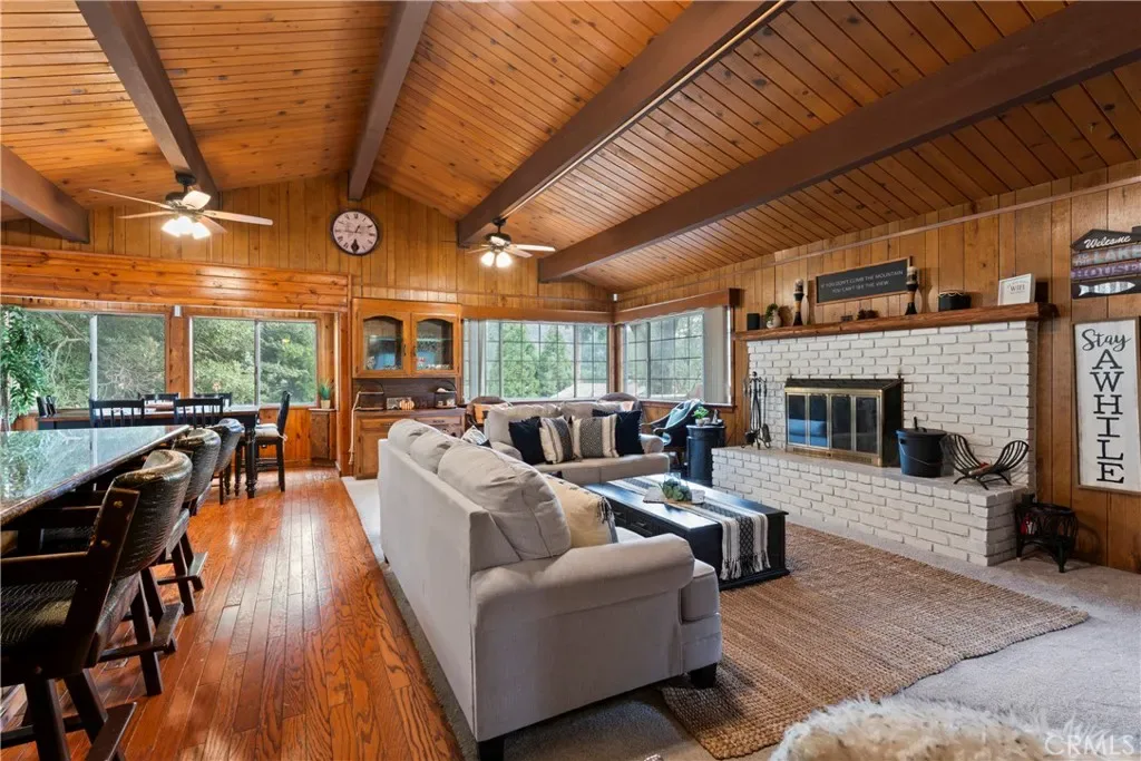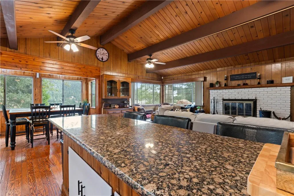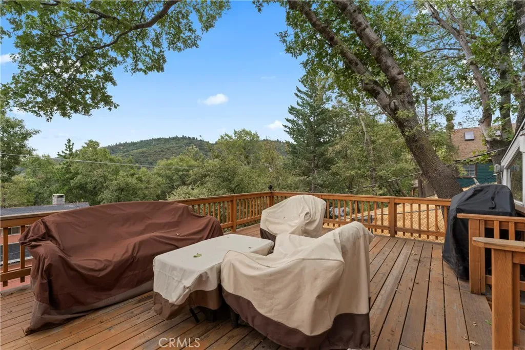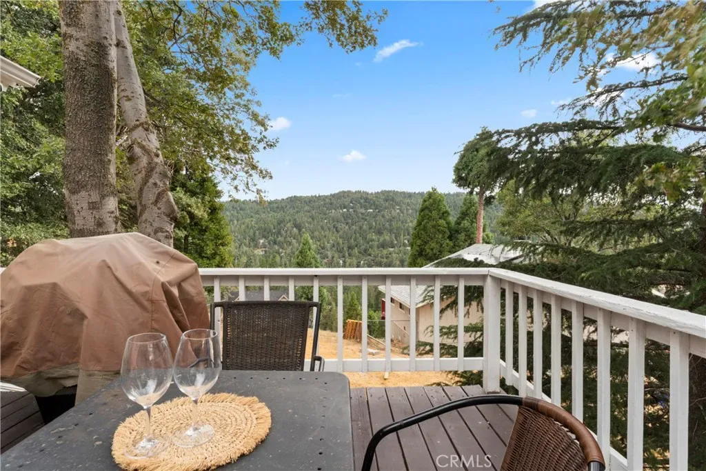 Your Mountain Retreat Awaits. Dreaming of a peaceful mountain getaway with room for everyone? This inviting home blends warmth, comfort, and breathtaking views. Step inside and unwind by the cozy brick fireplace, the perfect spot for winter evenings after a day outdoors. The main level offers a spacious game room, three bedrooms, one and a half baths, and brand new laminate flooring – ideal for family gatherings or weekend guests. Upstairs, light floods into the expansive living and dining area, designed with sweeping vistas to frame your every day. The master suite opens onto a private deck, where you can sip your morning coffee while soaking in the mountain air. A guest room and additional full bath add even more flexibility for family and friends. The heart of the home, the kitchen, features freshly painted cabinets, granite countertops, and a generously sized eating island, perfect for both casual meals and entertaining. Recent upgrades include a new deck, roof and paint. Outdoor living truly shines here with a large entertainment area complete with an outdoor kitchen, bar, and multiple balconies – your own private setting for unforgettable summer evenings under the stars. Centrally located near Lake Gregory, Lake Arrowhead, and popular mountain attractions, this home delivers the serene mountain lifestyle you’ve dreamed of, with convenience never far away.