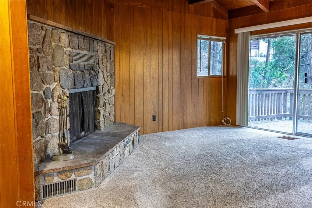 The main level features an open-concept kitchen with generous storage, dishwasher, and microwave, flowing into a nicely sized living room with a cozy fireplace and sliding glass doors that open to the deck—perfect for relaxing or entertaining. Down the hallway you’ll find a full bathroom and two comfortable bedrooms.