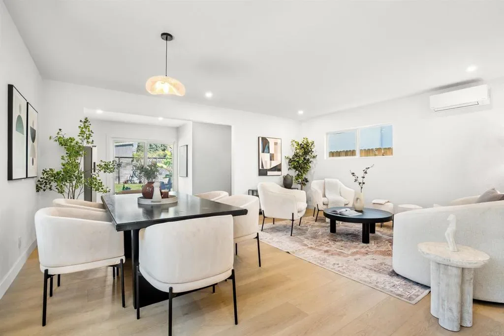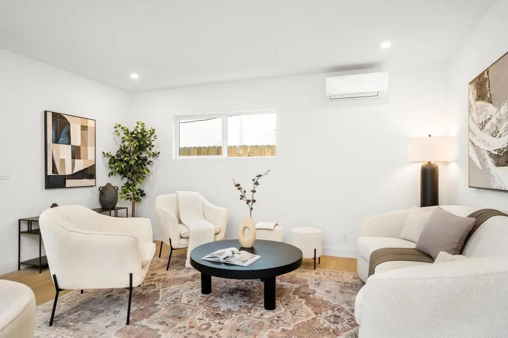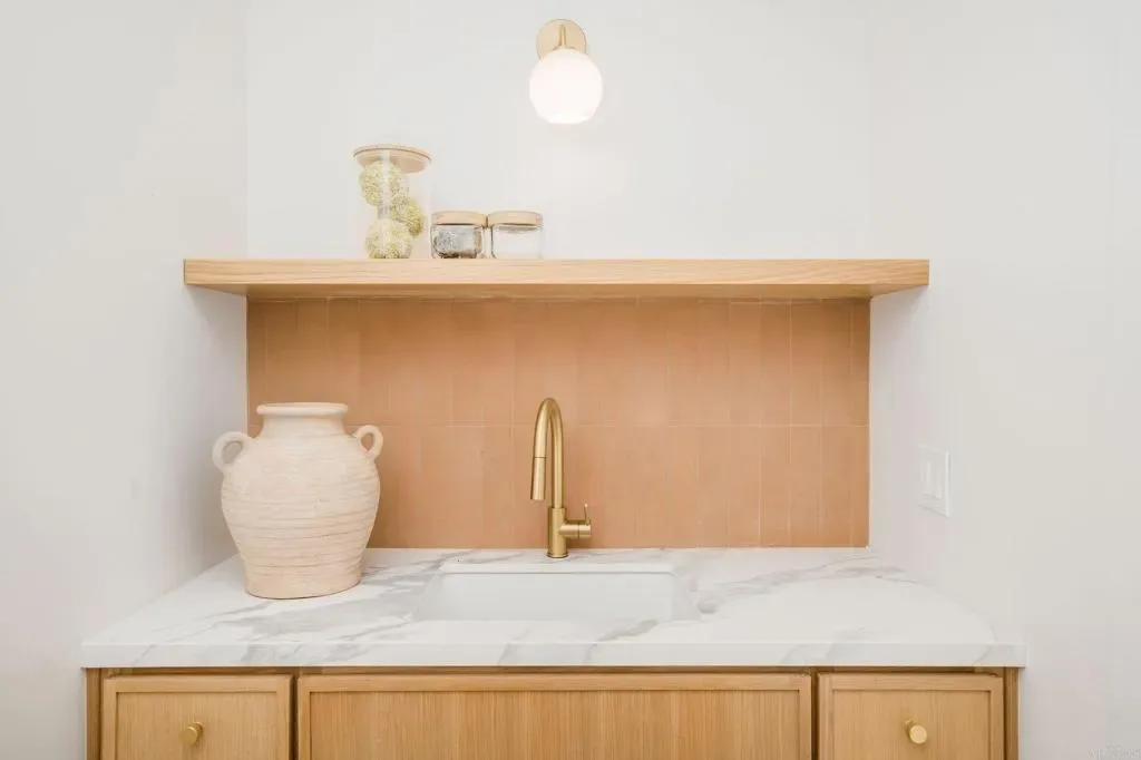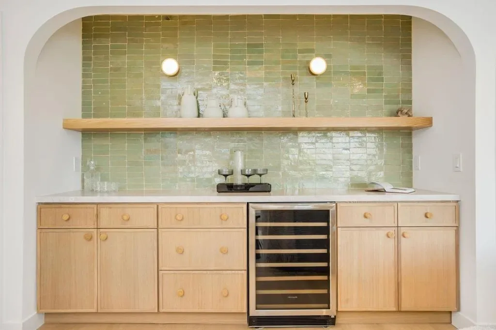 Masterfully remodeled from the inside out, this Culver City residence delivers designer-level finishes at every turn — from the main house to a fully self-contained ADU. A modern stucco exterior framed by new horizontal-slat metal fencing and a gated driveway sets a confident tone at the curb. Inside, wide-plank blonde hardwood floors carry through light-filled, open-concept living spaces anchored by a wood-mantled fireplace. An arched dry bar niche clad in sage zellige-style glossy tile — complete with a floating oak shelf, gold sconces, and wine fridge — adds a moment of drama off the main living area. The kitchen brings the design energy forward with two-tone slim shaker cabinetry in white and white oak, a quartz waterfall island with counter seating, a glossy zellige mosaic backsplash, and gold-tone hardware throughout. The primary suite is generous and serene, opening to the backyard via a slider. Its spa-caliber en suite features a floating white oak vanity with marble-look countertop, wall-mount gold faucets, patterned wallpaper, and a frameless glass shower with honed porcelain shower walls, pebble mosaic floor. Each additional bath carries its own design identity — from the bold terracotta checker tub surround to a third bath with a sculptural wavy-framed mirror and refined porcelain shower. A generous grassy yard with concrete patio and tropical plantings connects to the fully equipped ADU — white oak cabinetry, gas cooktop, porcelain shower tile with gold fixtures, and a cane-front vanity with arched mirror and gold sconces. Private alley entrance. All-new windows, doors, and HVAC throughout. Minutes from Downtown Culver City’s dining and nightlife, Ivy Station, and the tech and creative campuses that define the city’s modern identity, with easy freeway and Metro access.