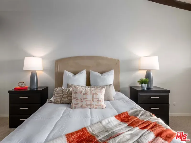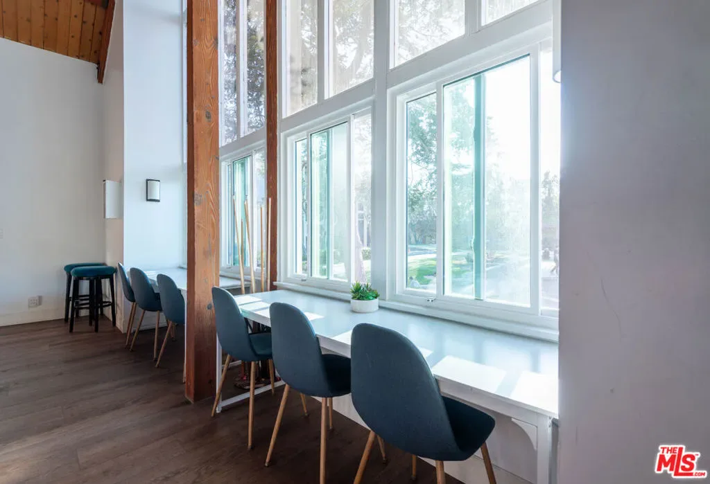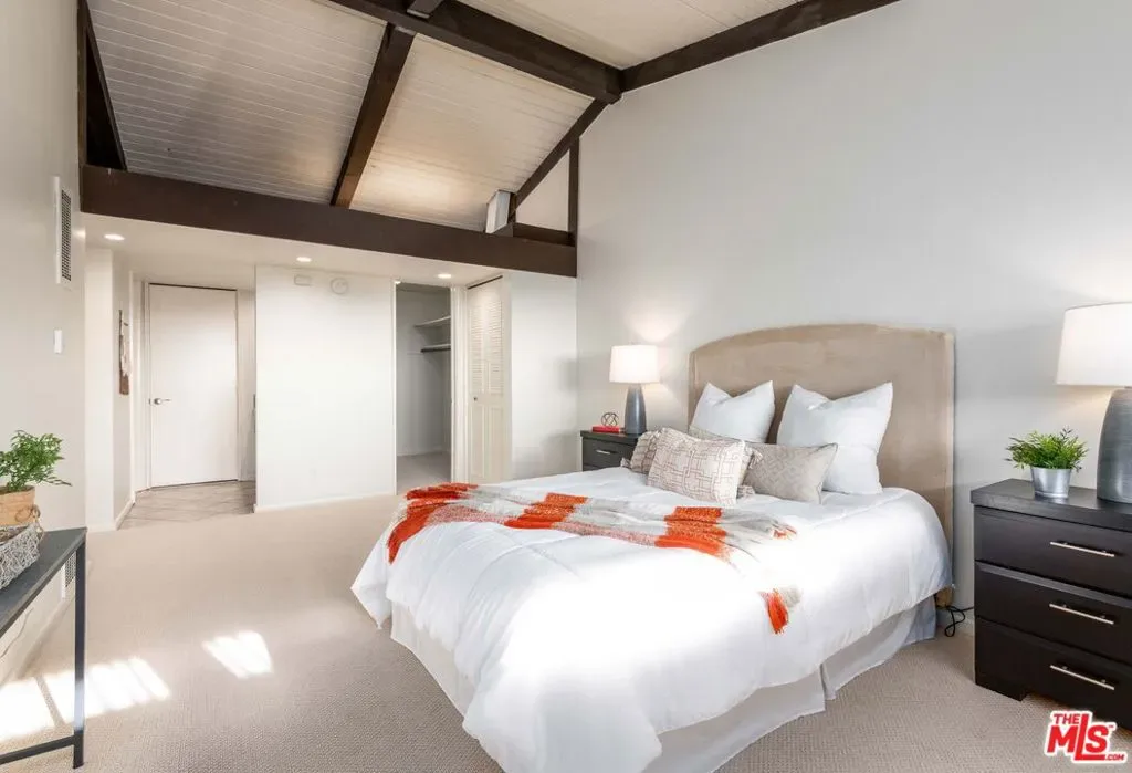 Sprawling top floor corner end unit located in the heart of the community with outstanding southwestern views of the interior grounds, trees, and skyline. Upon entry, take in the open and airy space featuring high-beamed ceilings throughout, fireplace, double glass sliders, and 22ft long covered balcony that is perfect for relaxing and enjoying the outdoors. The contemporary kitchen is outfitted with stainless steel appliances including a brand new microwave and refrigerator, granite counters, and breakfast nook. Both bedrooms are generous-sized with abundant closet space. The primary suite features a separate vanity area, 3 closets including a walk-in, and loft storage for all of your belongings. Tremendous storage throughout the home and there’s even a cool bar area for entertaining. Resort-style Heather Village features controlled access, onsite staff, patrolled security, clubhouse, EV charging station, fitness center, playground, sports courts, spas, saunas, and pools. Homeowners dues include gas, water, trash, high-speed Internet, and cable with HBO Max, Disney+, and Hulu. 2 gated parking spaces included. Tree-lined neighborhood with park and numerous dining and retail establishments close by.