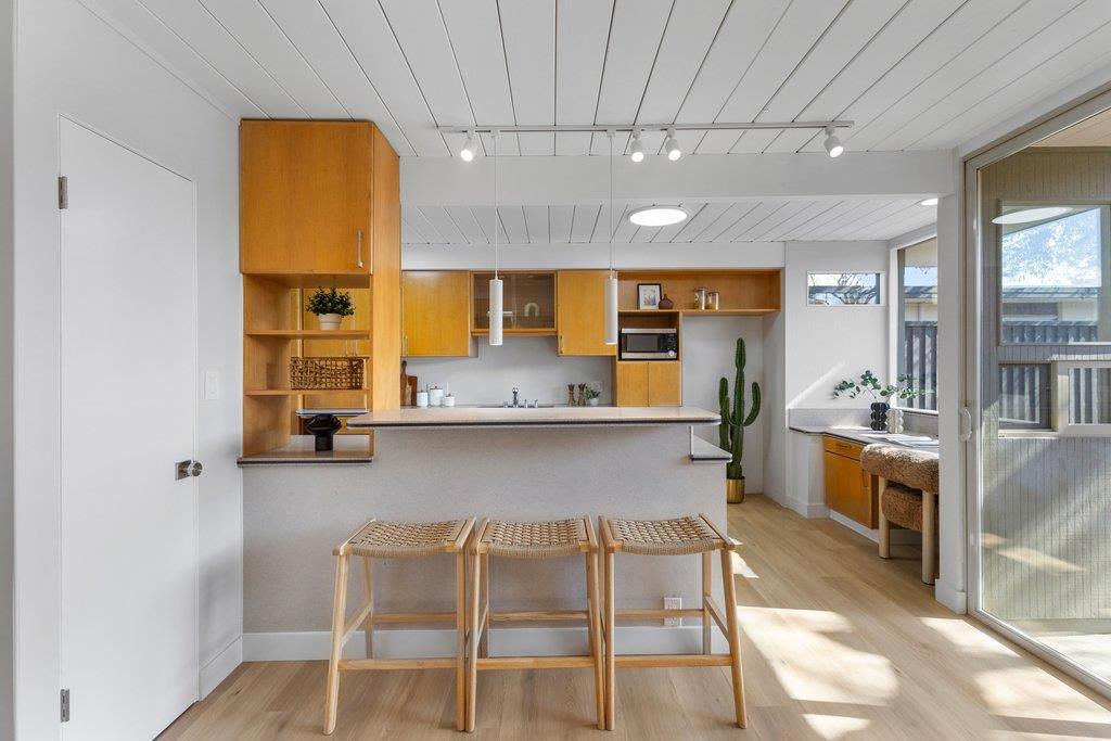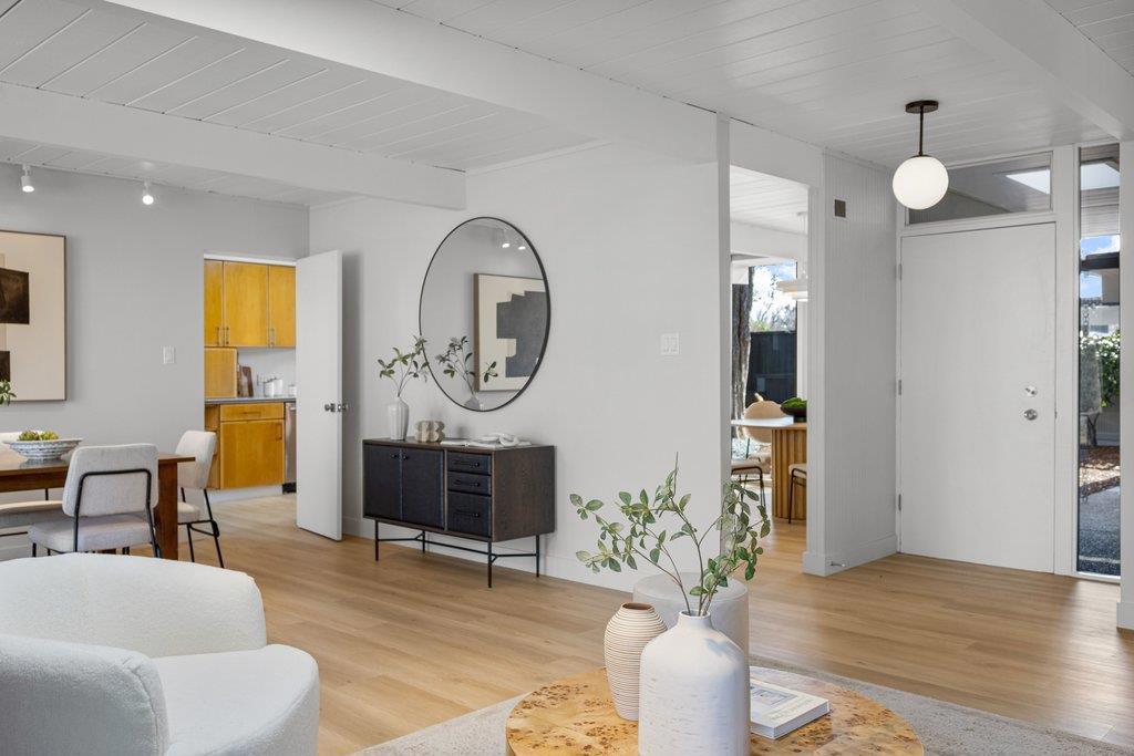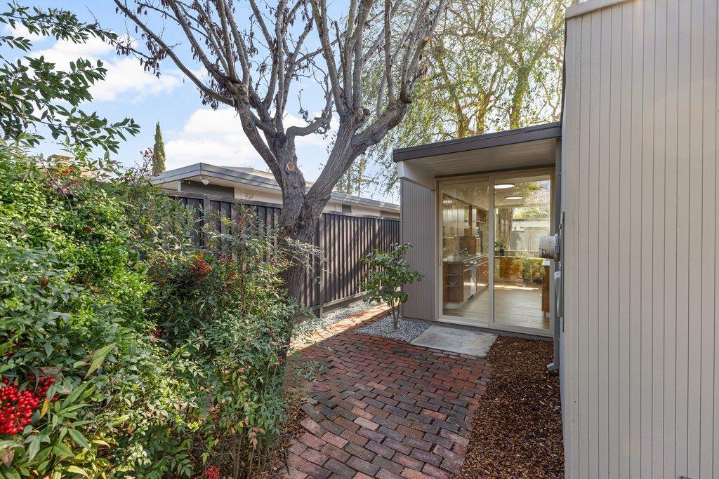 Beautifully updated courtyard Eichler in the desirable Fairgrove/Cupertino neighborhood. This home offers a serene, sophisticated feel with a seamless blend of indoor/outdoor living and iconic Eichler features, including courtyard entry, floor-to-ceiling glass, radiant heat, exposed wood beams, and tongue-and-groove ceilings. The beautifully remodeled kitchen features custom cabinetry, Corian countertops, and newer appliances, including an electric cooktop, built-in oven, opening to a spacious dining and family room. The stunning living room showcases a large brick fireplace flanked by walls of glass and a slider to the patio. The primary suite offers a tastefully updated bath. Additional highlights include fresh exterior/interior paint, LVT flooring, an updated boiler, a foam roof, skylights, updated light fixtures, an indoor laundry area, and more. Enjoy the spacious, low-maintenance backyard with a concrete patio and mature plants and shrubs, perfect for relaxing or entertaining. Large attached 2-car garage with ample storage. Centrally located near major tech campuses with easy access to Highways 85/280. Tight-knit Fairgrove community with a short walk to schools, parks, shops, restaurants, and easy commuting. Top Cupertino schools: DJ Sedgwick, Hyde Middle & Cupertino High.