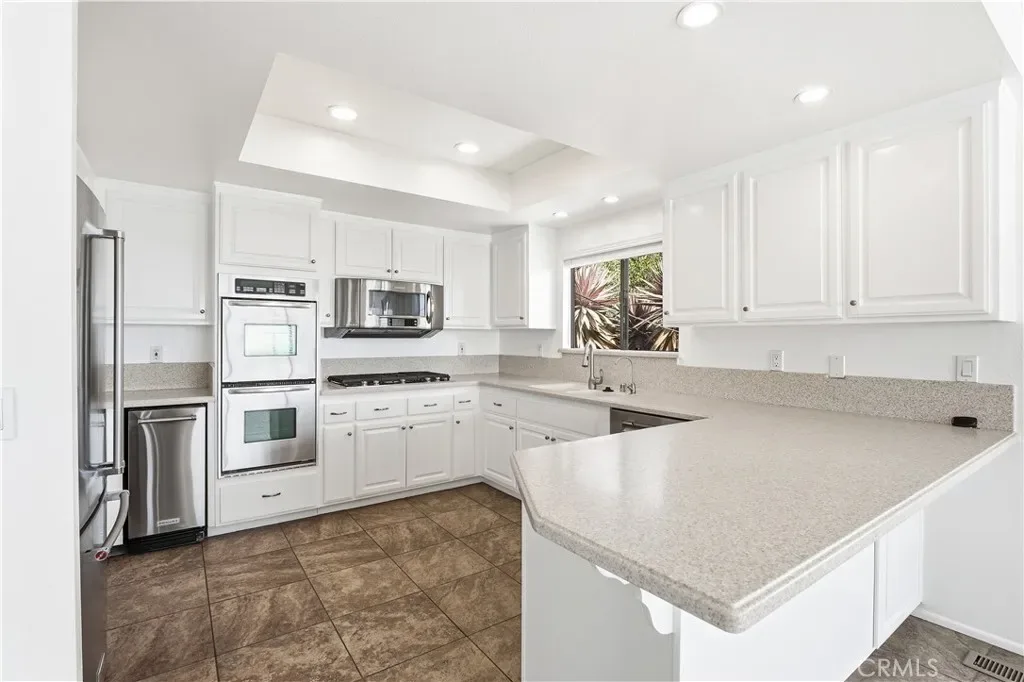 The kitchen is thoughtfully appointed with newer stainless steel appliances, including a built in refrigerator, double ovens, and a five burner gas cooktop, making it both functional and ideal for entertaining.