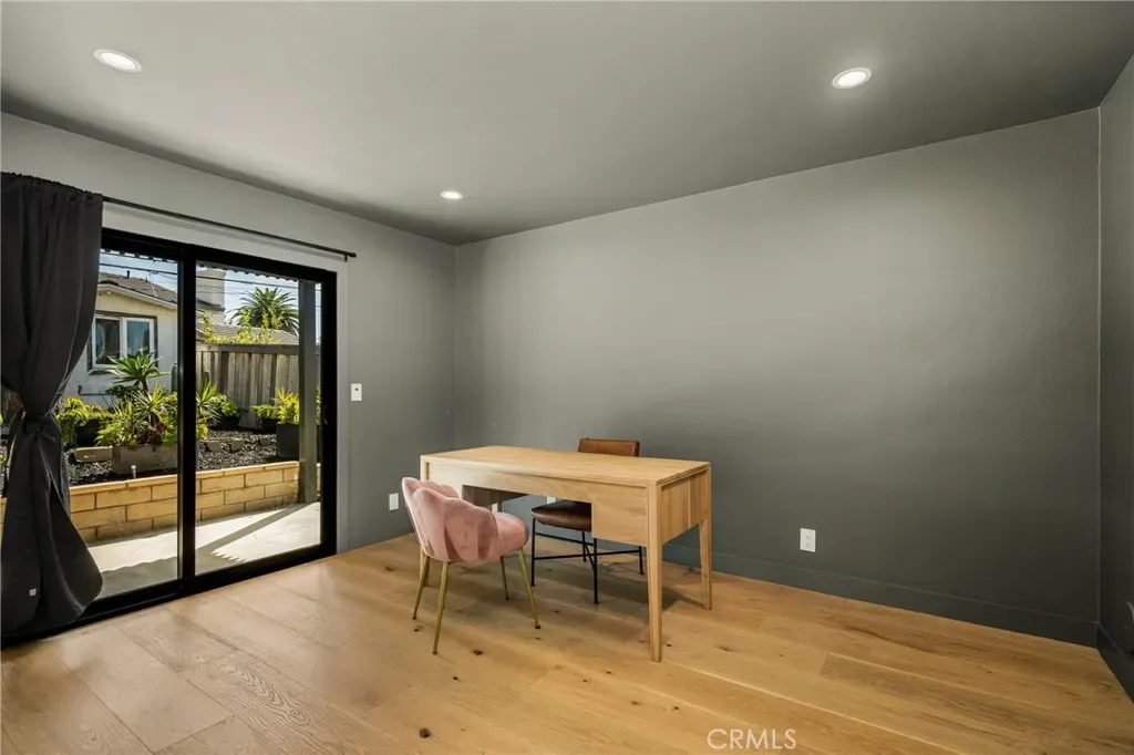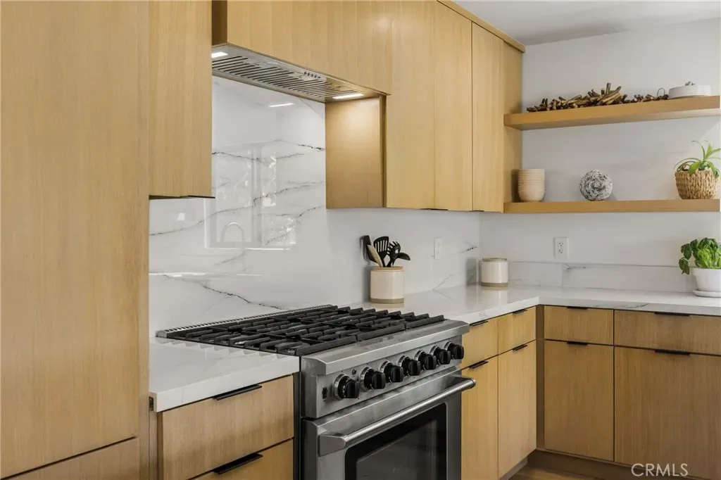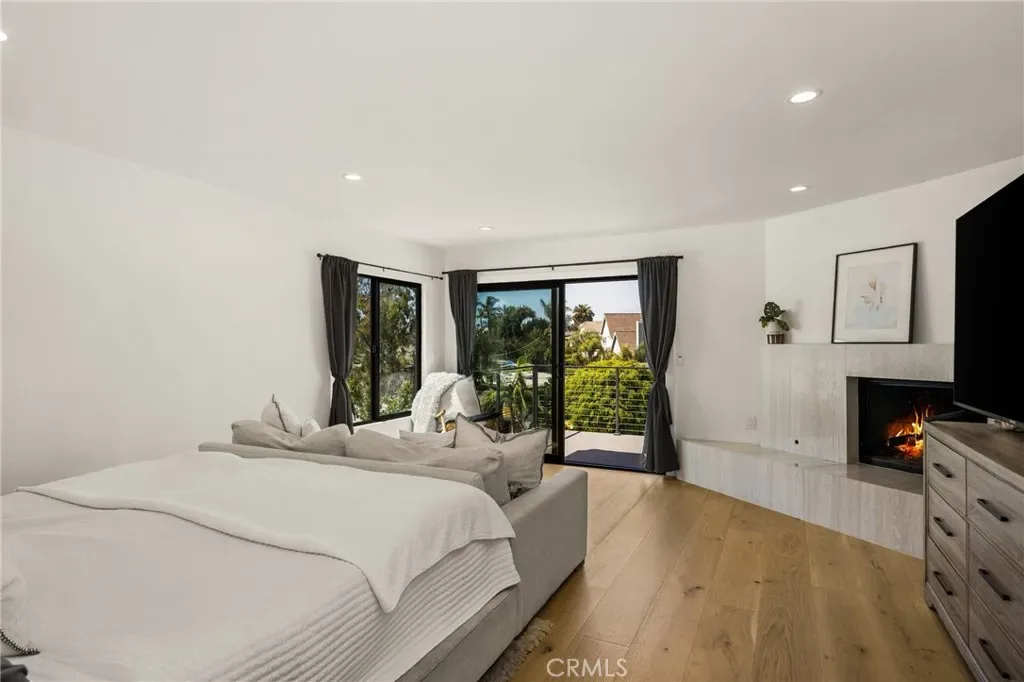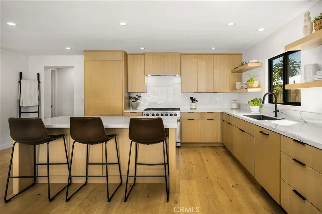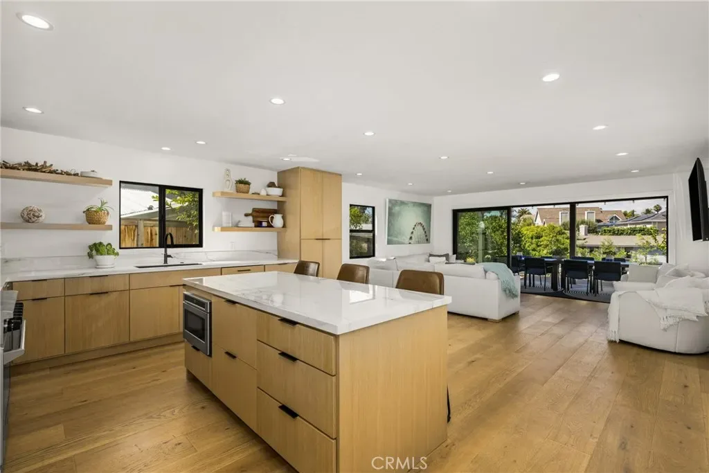 Welcome to this stunning 4 bedroom, 3.5 bath home showcasing a complete down-to-the-studs remodel finished in 2024. Every detail has been thoughtfully designed with high-end upgrades, including a recently updated roof, windows and doors, full HVAC system and ducting, tankless water heater, custom cabinetry, and French oak hardwood flooring. The spacious floor plan offers two bedrooms upstairs and two downstairs, with three bedrooms featuring en-suite baths for ultimate comfort and flexibility. The chef’s kitchen is a true centerpiece, with custom white oak cabinetry, built-in Miele refrigerator and freezer, Bosch dishwasher, Thor 36” gas range, a 7-foot island, and striking porcelain countertops and backsplash. Upstairs, the primary suite is a private retreat with a balcony offering ocean views, a spa-like bath with freestanding tub, and a 200 sq. ft. walk-in closet with custom built-ins. The upstairs laundry adds convenience, while outside you’ll enjoy mature olive trees along with lemon, lime, fig, guava, and orange trees for a touch of charm. This move-in ready home blends timeless design with modern luxury, offering a rare opportunity to own a turnkey property with every upgrade less than a year old.