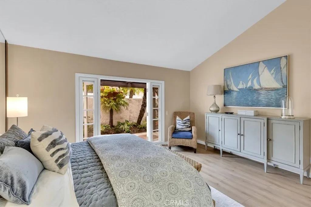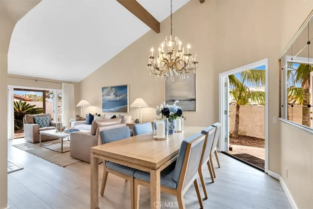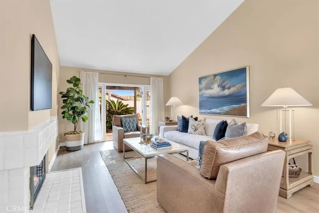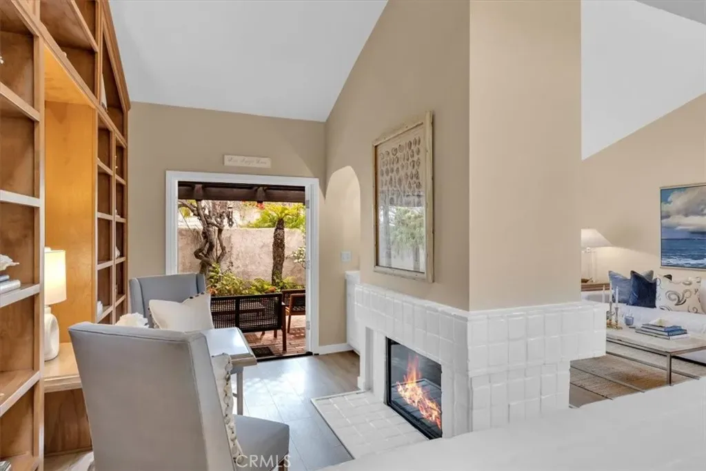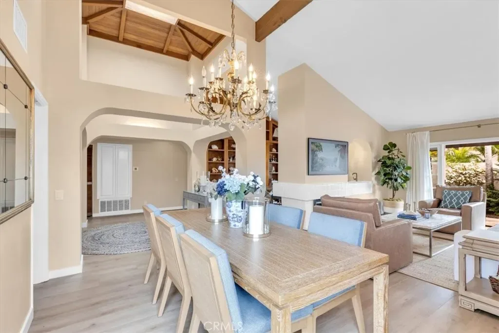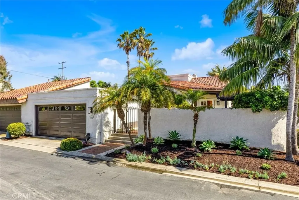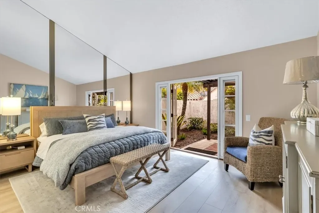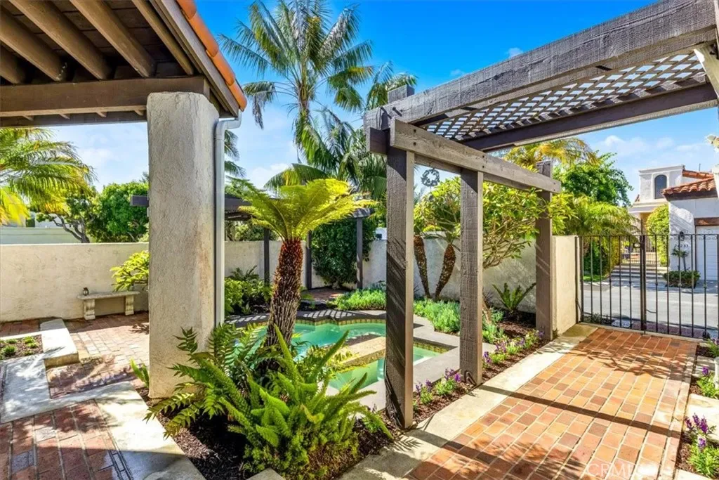 Enter through a charming wrought iron gate into a lush, private courtyard adorned with tropical landscaping and a brick patio. At its heart, a clover-shaped spool with a pergola offering shaded seating, ideal for relaxing or entertaining.A grand wooden door opens into a spacious foyer with blonde wood floors and cathedral ceilings with a skylight flooding the entry with natural light. To the right, a gourmet kitchen boasts granite countertops, built-in refrigerator, dishwasher, oven, and a generous island with electric cooktop and storage. French doors connect the kitchen to the courtyard and spool—perfect for indoor-outdoor living.Through a pocket door, is the formal dining room featuring a chandelier and French doors opening to a secluded side yard. Adjacent, the elegant living room centers around a sleek gas fireplace with white tile surround creating a warm and relaxing gathering space. French doors open to the back patio, where tropical landscaping, covered deck, and a gas fire pit enhance the coastal ambiance.A partial wall divides the living room from a cozy inglenook with a two-sided fireplace, built-in chestnut shelving. There are additional french doors in the nook to the outdoors, inviting in the ocean breeze.Down the hall, the secondary bedroom includes mirrored closet doors, private entry from the courtyard, and continuous blonde wood flooring. The adjacent guest bath features a tub/shower combo, long counter, and dedicated vanity space.At the end of the hall, the primary suite impresses with a dramatic mirrored accent wall and French doors to the patio. A sliding barn door reveals the ensuite bath with dual sinks, vanity area, and three mirrored closets. A separate door leads to a large soaking tub/shower.Situated on a desirable corner lot, this home enjoys the resort-style amenities of Niguel Shores, including a private ocean bluff with beach access, pickleball and tennis courts, bocce ball, pool and spa, playgrounds, and clubhouse.Steps outside the community are two 5 star resorts within walking distance, Salt Creek Beach, and Downtown Dana Point and Harbor.