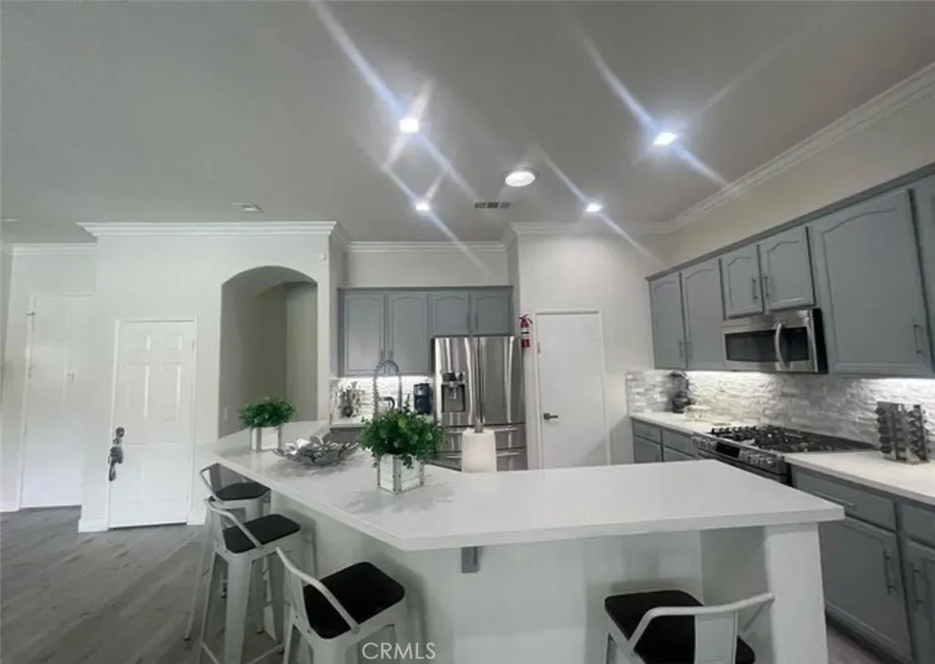 The home features recessed lighting and high ceilings throughout, and crown moulding for that added touch of luxury. Kitchen has been fully updated with stainless steel appliances, quartz countertop for easy cleaning.