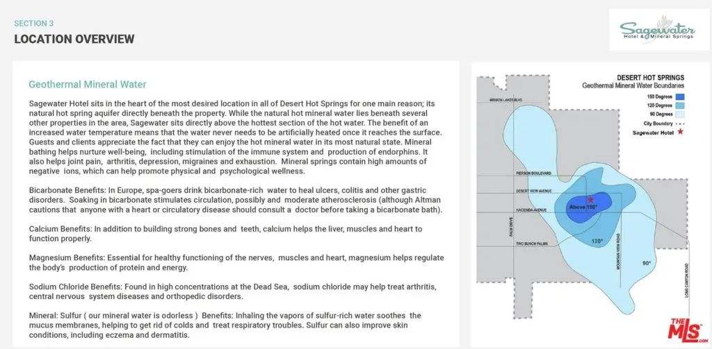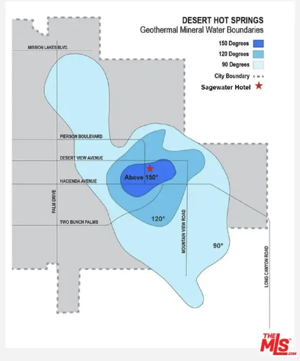Sagewater Hotel and Mineral Springs is a 5-star rated wellness retreat on Google and the #1 ranked hotel on TripAdvisor in Desert Hot Springs – California’s renowned Spa City. This award-winning mid-century modern boutique hotel, originally built in 1955, has been thoughtfully renovated to honor its iconic design. Sagewater is one of the last remaining mid-century modern hotels in the area, prime for development, featuring five surrounding vacant lots Zoned Visitor-Mixed Use that offer a rare opportunity to expand into a larger wellness destination. Eight guest rooms plus Office and Laundry Room surround the geothermal pool, offering sweeping desert and San Jacinto Mountain views, with in-room kitchens and refined amenities. One of the rooms is currently operated as a highly successful on-site spa which has validated strong demand for expansion of additional wellness rooms on vacant lots. At the heart of the property is a rare ~160 geothermal mineral water well, supplying a 80-90 degree mineral pool and 102-104 degree spa renowned for their therapeutic benefits. Set atop Miracle Hill, the hotel enjoys panoramic views across the Coachella Valley and is proximal to Greater Palm Springs, Palm Springs International Airport, and Joshua Tree National Park. Exceptional, one-of-a-kind asset with significant development upside. This property is not just an investment; it’s an opportunity to own a piece of the desert’s heart and history. Sale includes 6 lots (1.15 acres), Mineral Well, All FF&E, Website, Social Media and systems in place. Please contact listing agent for Offering Memorandum with more information.