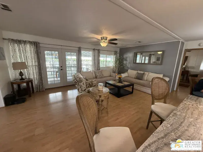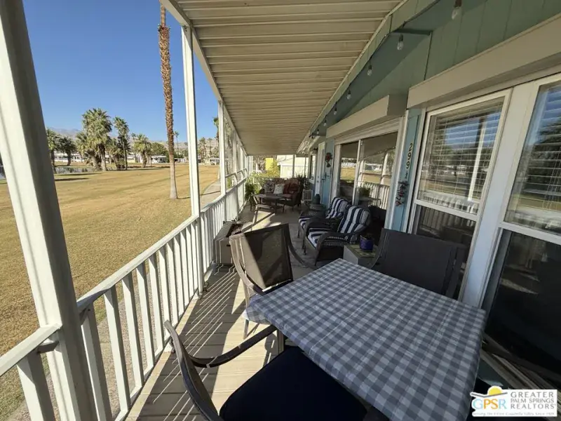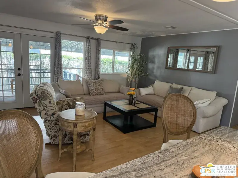 Pristine perfection! Enjoy resort living in this gorgeous home located on the first hole in Hidden Springs Country Club, an active 55+ community located in Desert Hot Springs. Enjoy morning coffee and evening cocktails from the covered deck as you marvel at the amazing mountain, golf course, and lake views. This partially furnished 2 bedroom, 2 bath home also features an additional 200 sq. ft which was previously an Arizona room, now finished and currently acts as a third bedroom and office. The modern kitchen boasts stainless appliances, granite countertops, shaker cabinets, and a large center island that opens up to a dining area and living space. This makes for a fabulous great room perfect for entertaining friends and family. There is a separate family room that highlights archways and beamed ceilings, as well as the awesome outdoor vista and provides easy deck access. Every part of this light and airy home exudes a tranquil sense of relaxation. Separate laundry room, covered parking for 3 cars, outdoor security lighting, tank-less water heater, double paned windows, and large storage shed round out this awesome unit. Community amenities include tennis and pickleball courts, a sauna, a large swimming pool, two hot tubs, clubhouse complete with gym, pool table, and meeting area, and a dog park for your furry family members.Don’t pass up the chance to view your next scenic sunset from this beauty!