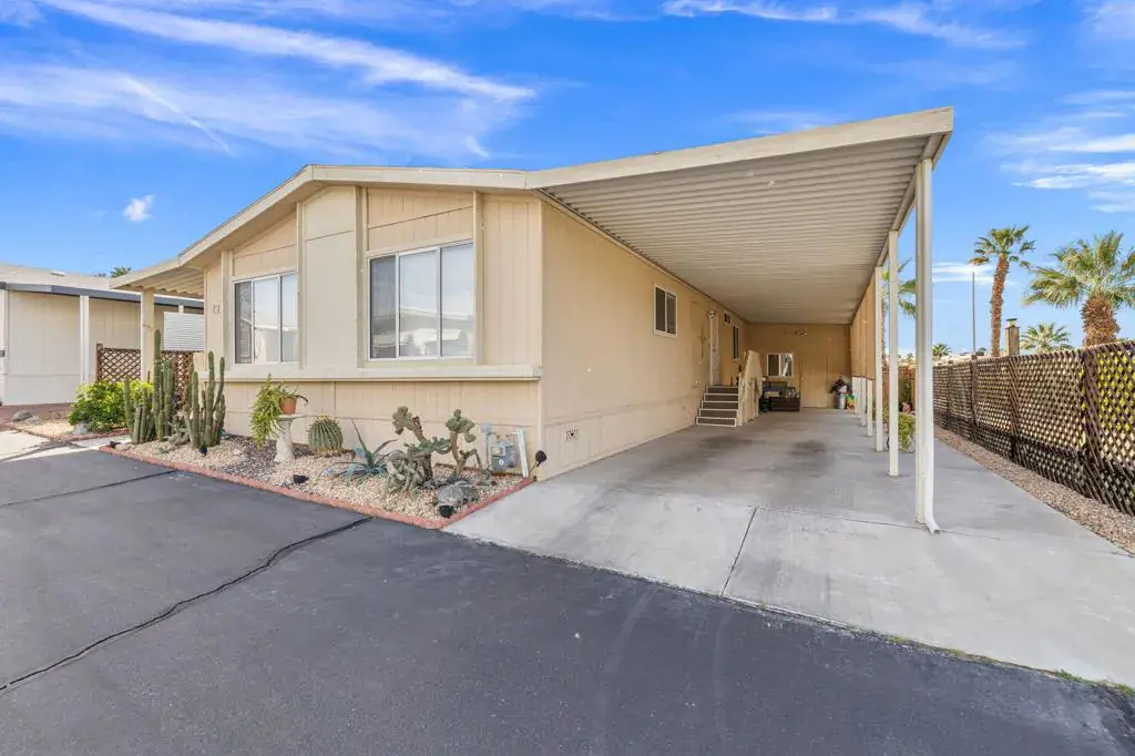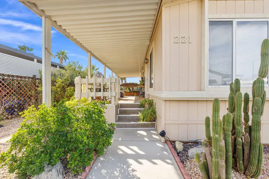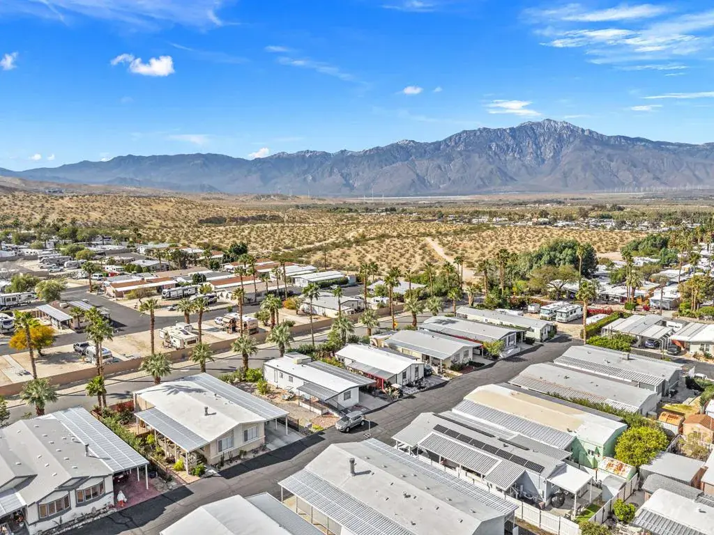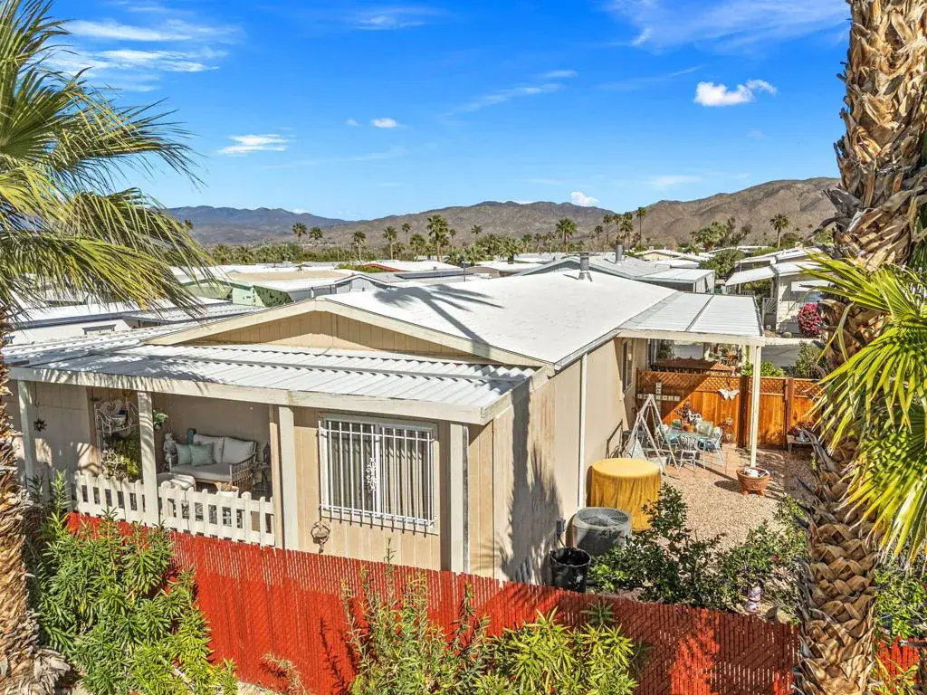 Welcome to 55+ Resident owned Joshua Springs Mobile Home Park! Truly one of the best and most affordable lifestyle in the Coachella Valley! A low monthly HOA fee of 250.00 that includes, cable, trash, land taxes, water and amenities. Enjoy the friendly people, and RARE and healing geo-thermal hot mineral water in the pool and spas! This home boasts TRUE PRIDE of OWNERSHIP and includes new laminate flooring, custom made window coverings, 2 separate living areas and an office, a huge primary bedroom and bathroom with a spacious walking closet, high ceilings, 2 raised porches with breath taking views, fruit trees, and beautiful landscaping, an individual laundry room, 2 car covered parking area, a spacious storage shed and so much more. This home is immaculate!!! Located in beautiful Sky Valley, a short drive from quaint downtown Palm Springs, fine dining and shopping on El Paseo Drive in Palm Desert, ice hockey and venues at the new Acrisure Arena, Paribas tennis in Indian Wells, PGA golf tournaments in La Quinta, Art Festivals, Stage Coach and Coachella music festivals at the Empire Polo Grounds. Perfect permanent home or a warm Winter getaway!