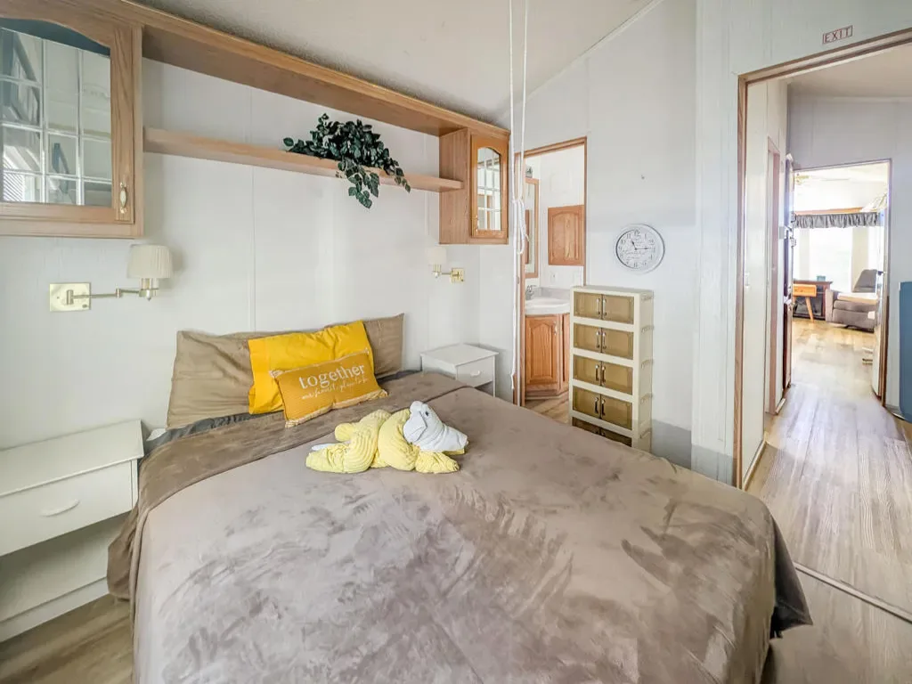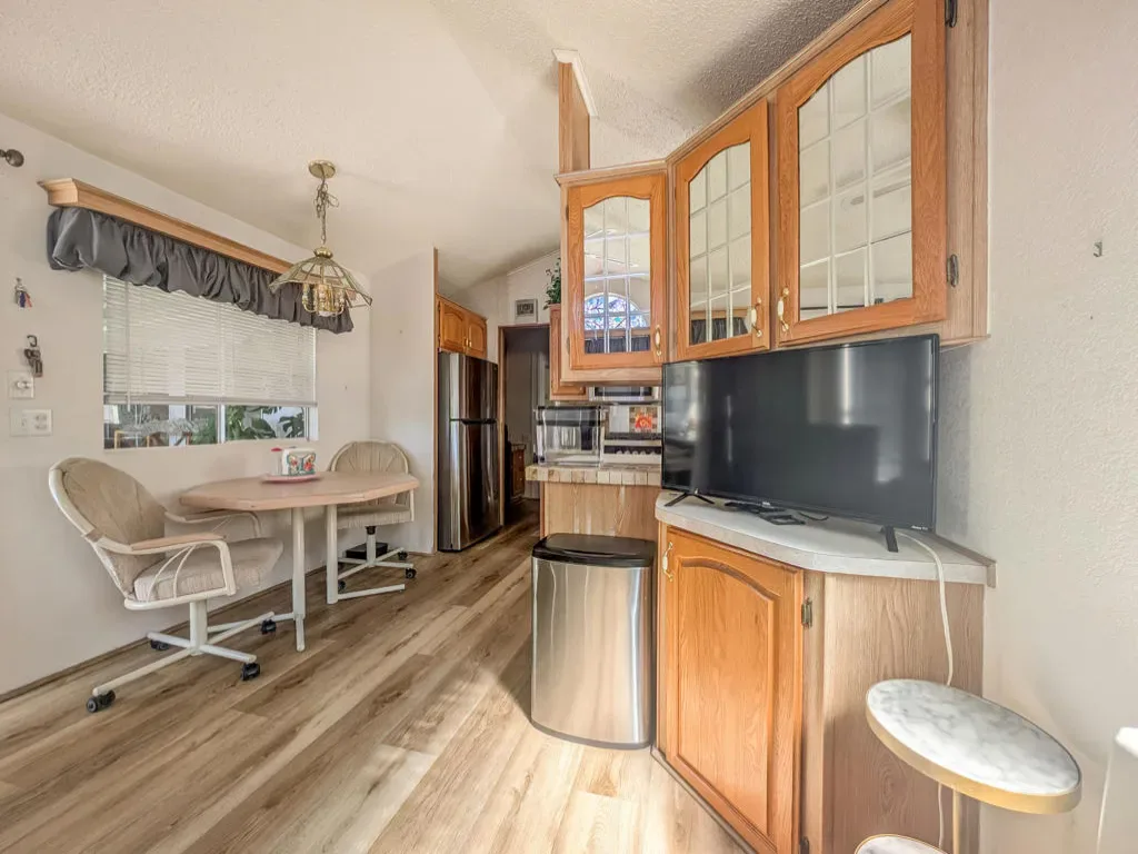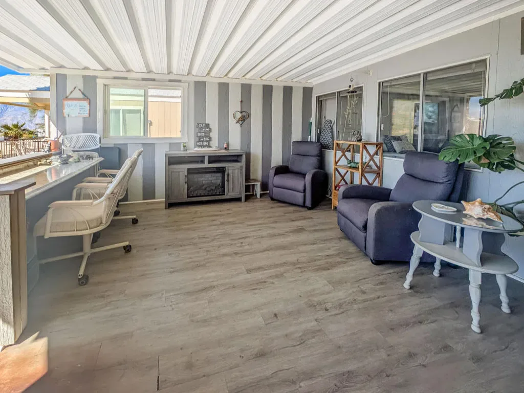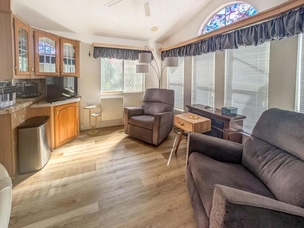 Situated just steps from the Clubhouse and conveniently located near all major amenities at Caliente Springs 55+ Resort, this property offers a Fleetwood Park Model home. The residence features a spacious covered front deck that provides panoramic views of both the mountains and desert. The interior presents a bright and welcoming two-bedroom design, an upgraded bathroom with a large tiled walk-in shower, a washer and dryer, and ample living space. Additional conveniences include a dedicated desk or computer area, a private back deck, courtyard, and a mature fruit tree for outdoor enjoyment. A paved driveway accommodates up to three vehicles. Residents have access to a 9-hole golf course, mineral hot spring pool and spas, a fitness center, and a vibrant, inclusive community. Please note: the lot is not owned; monthly space rent is $673.