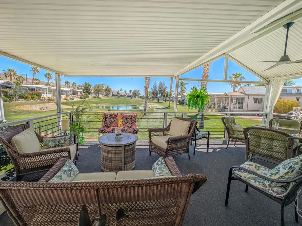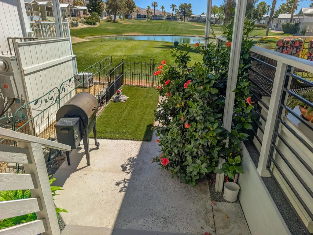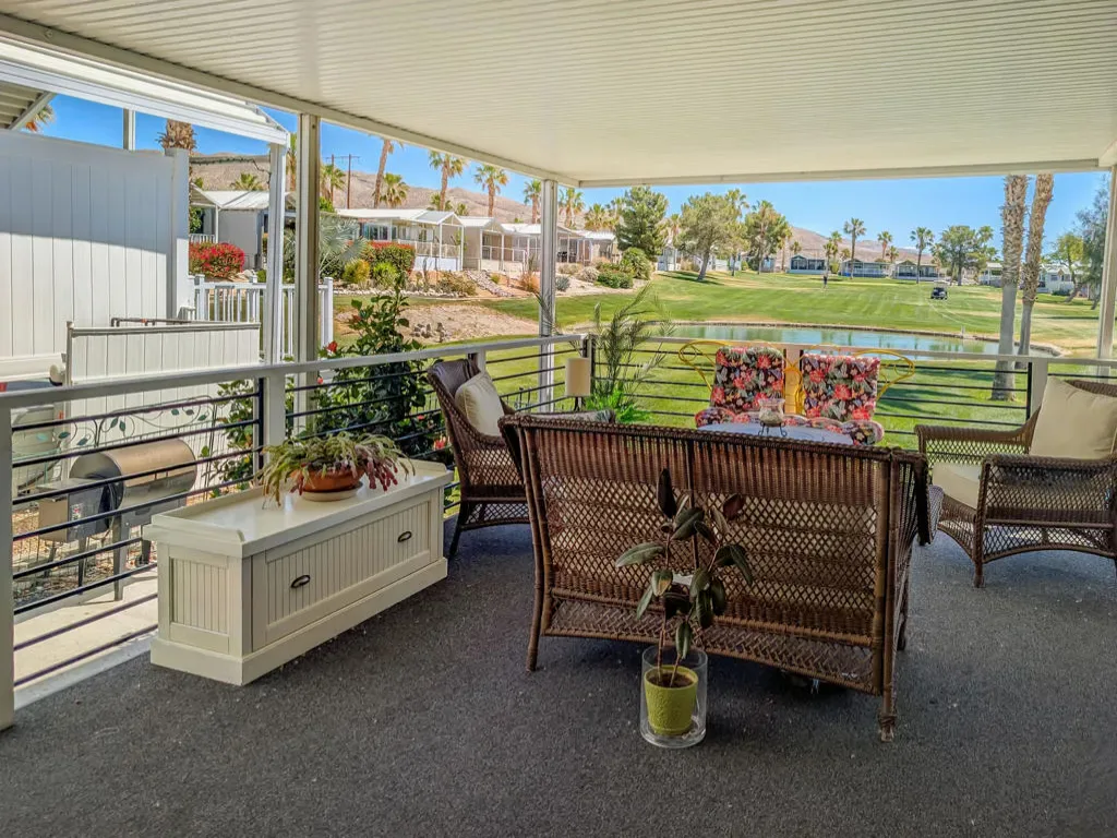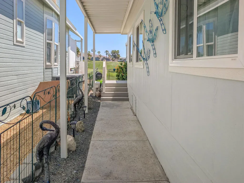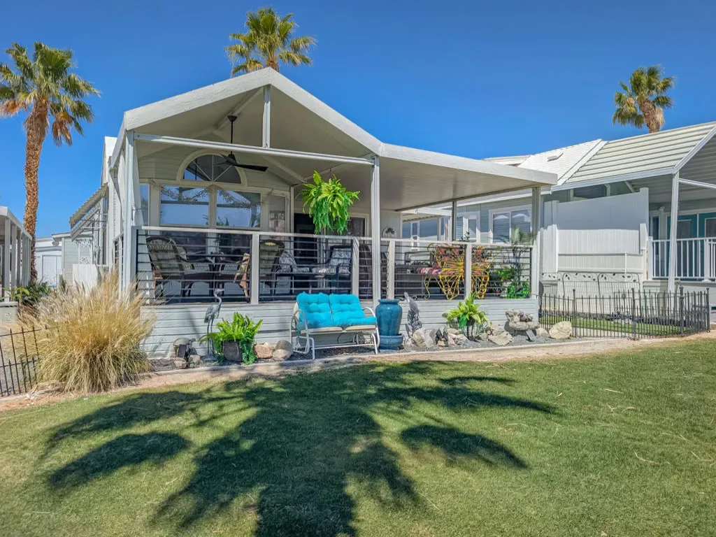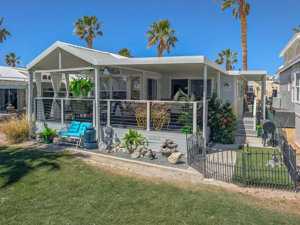 This is a truly unique gem, beautifully maintained and visually striking! The 2002 Hallmark Park Model offers about 800 sq. ft., with 2 bedrooms and 2 bathrooms, and is located on the sought-after 8th hole of the golf course. It has been custom remodeled with features designed to satisfy every need, including designer paint throughout, upgraded backsplashes in the kitchen and bathroom, luxury vinyl plank flooring, stainless-steel appliances (including an efficient dishwasher), a doggie door with a private enclosed run, a paved carport, white-coated roof, and a mini-split system in the spacious, bright California room. There’s also a stunning large deck, covered and sheltered from the wind, where you can enjoy breathtaking views and the relaxing sounds of the water feature and greens–making it perfect for entertaining year-round! Caliente Springs is a premier 55+ resort that provides amenities such as a 9-hole golf course, 8 pickleball courts, tennis courts, laundry facilities, a library, and a vibrant community full of events and friendly faces. Come see this well-appointed home and make it your vacation retreat or your permanent residence! Please note: the lot is not owned; space rent is $950.