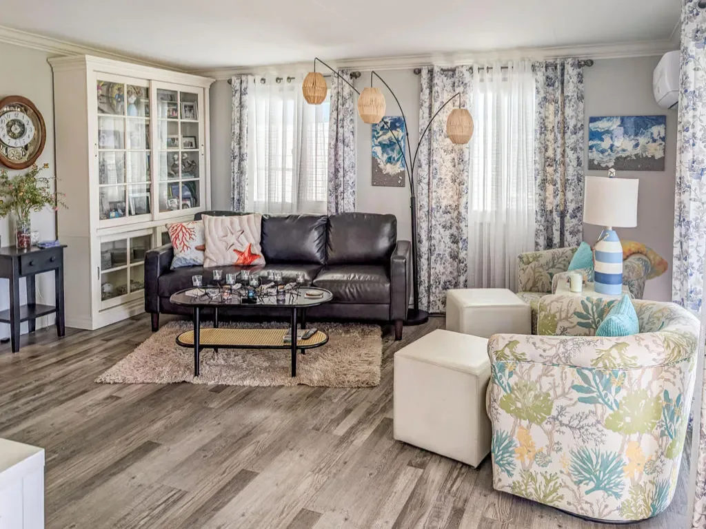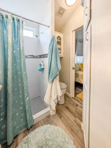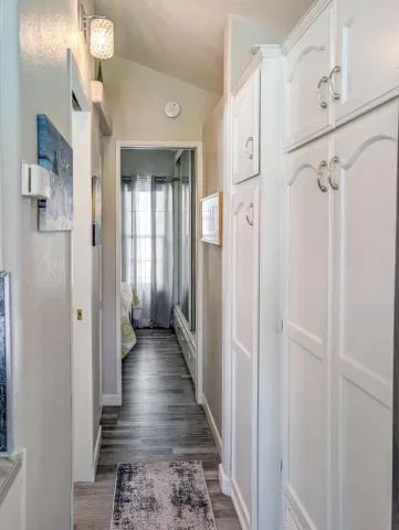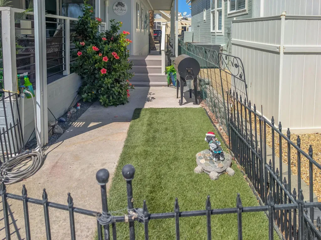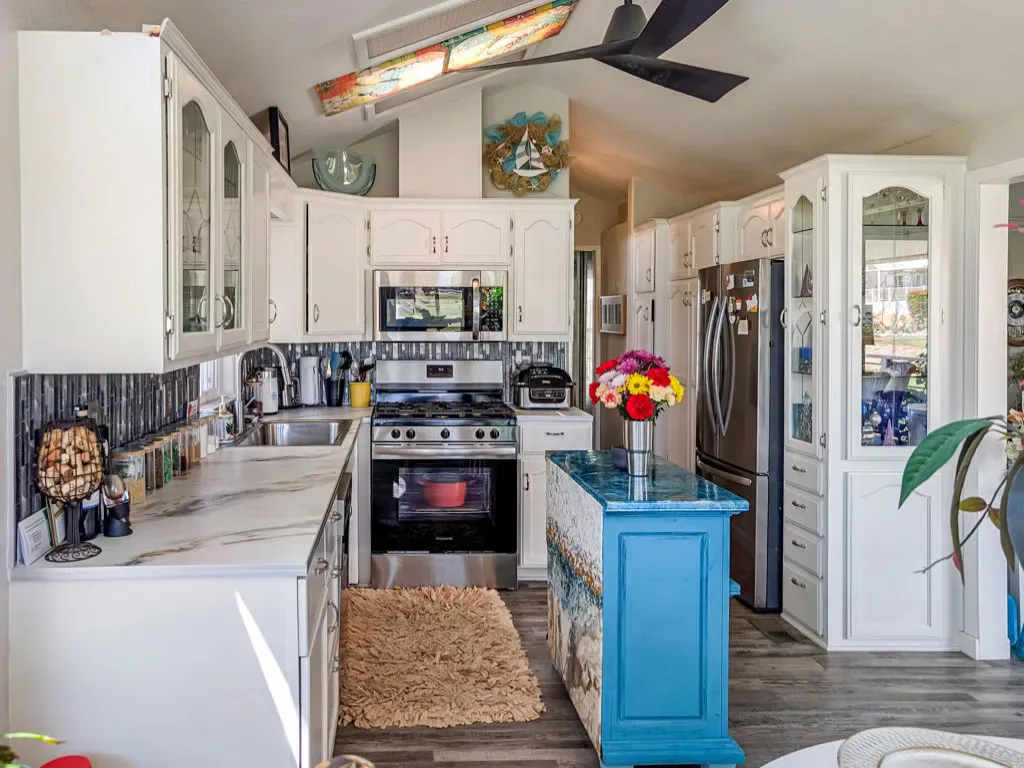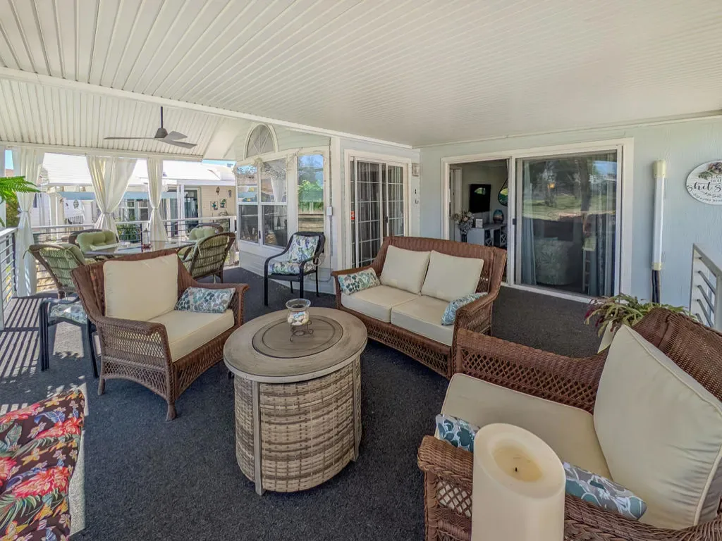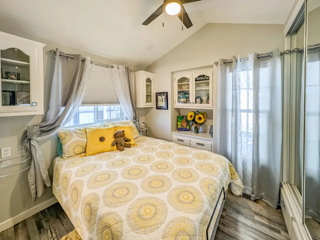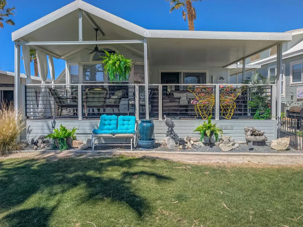 This is a truly unique gem, beautifully maintained and visually striking! The 2002 Hallmark Park Model offers about 800 sq. ft., with 2 bedrooms and 2 bathrooms, and is located on the sought-after 8th hole of the golf course. It has been custom remodeled with features designed to satisfy every need, including designer paint throughout, upgraded backsplashes in the kitchen and bathroom, luxury vinyl plank flooring, stainless-steel appliances (including an efficient dishwasher), a doggie door with a private enclosed run, a paved carport, white-coated roof, and a mini-split system in the spacious, bright California room. There’s also a stunning large deck, covered and sheltered from the wind, where you can enjoy breathtaking views and the relaxing sounds of the water feature and greens–making it perfect for entertaining year-round! Caliente Springs is a premier 55+ resort that provides amenities such as a 9-hole golf course, 8 pickleball courts, tennis courts, laundry facilities, a library, and a vibrant community full of events and friendly faces. Come see this well-appointed home and make it your vacation retreat or your permanent residence! Please note: the lot is not owned; space rent is $950.