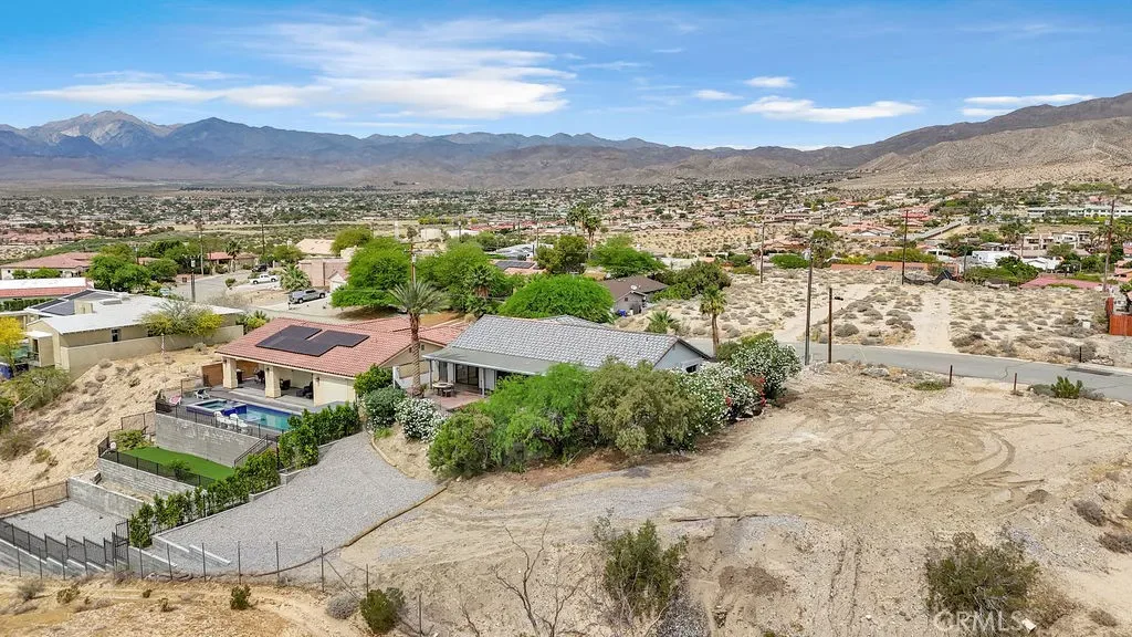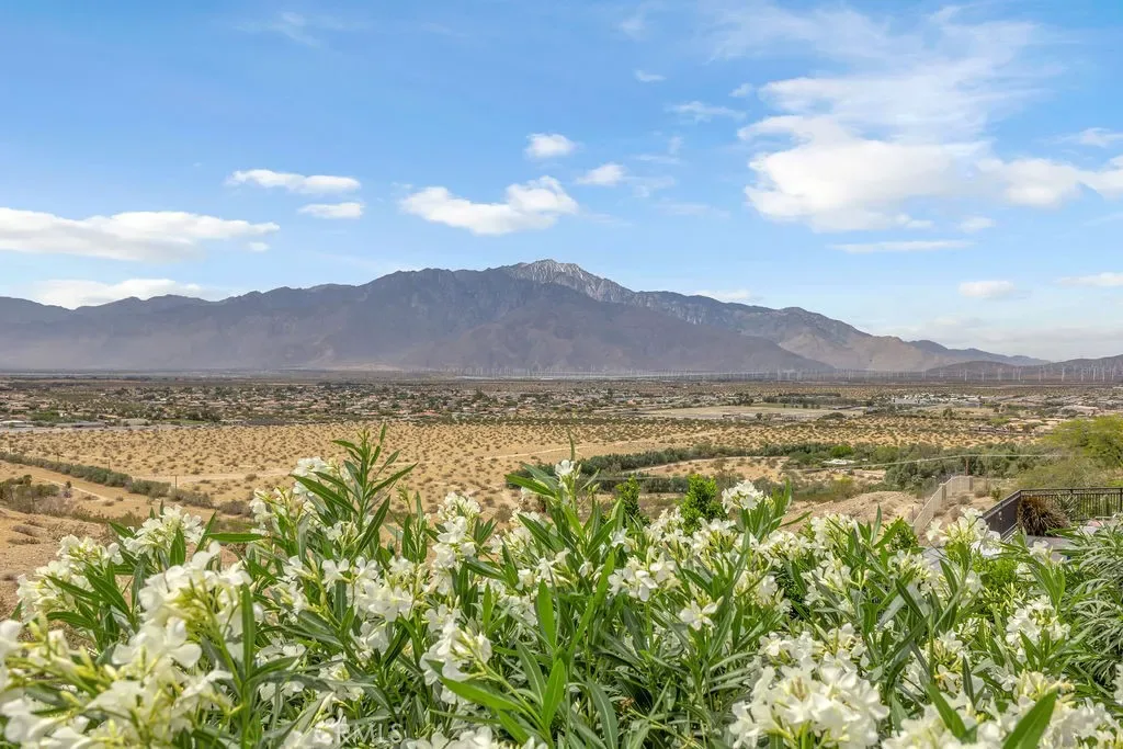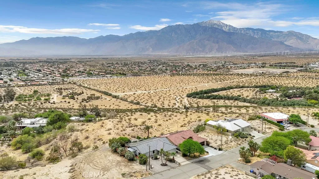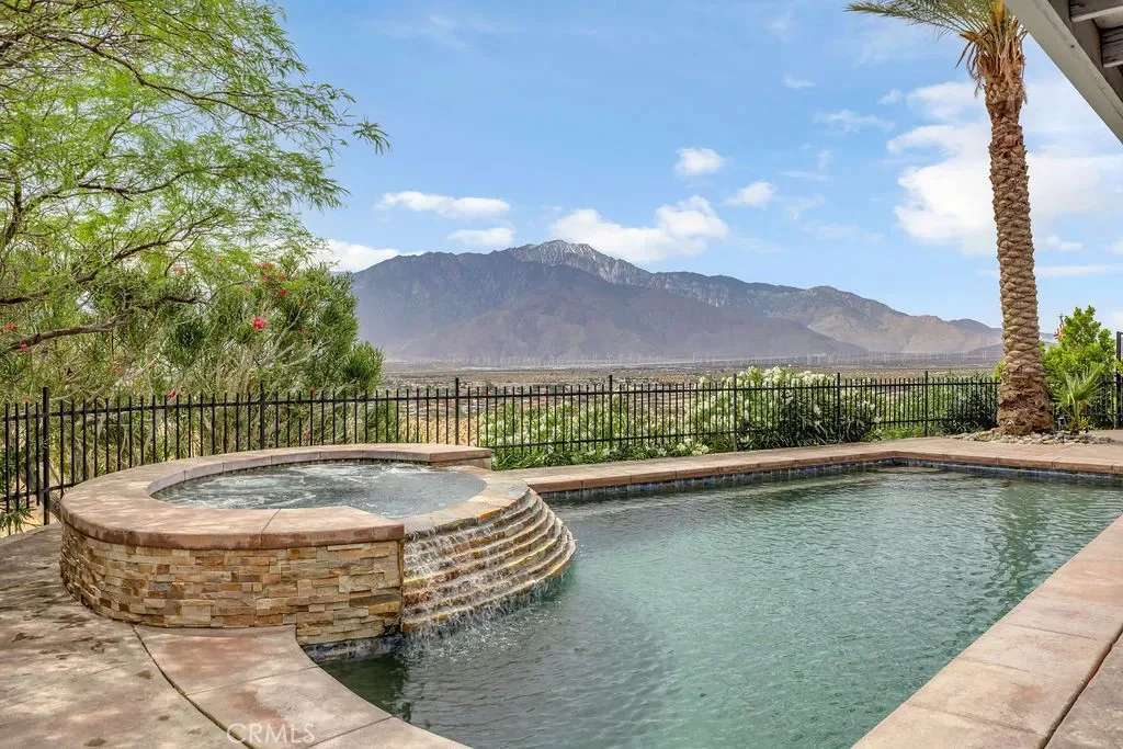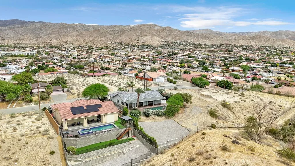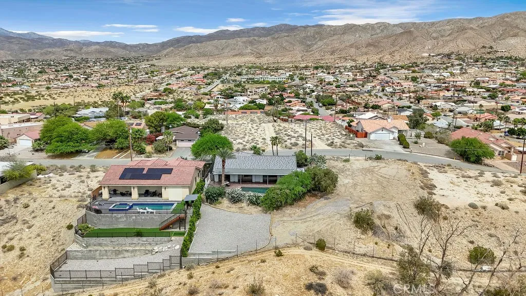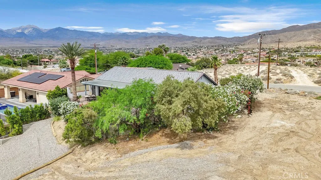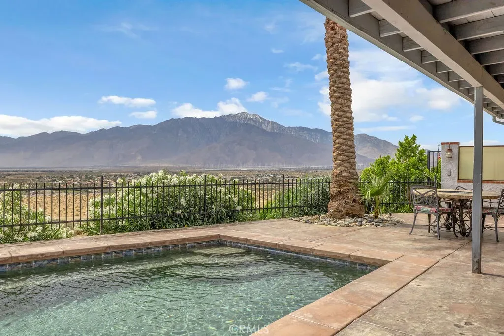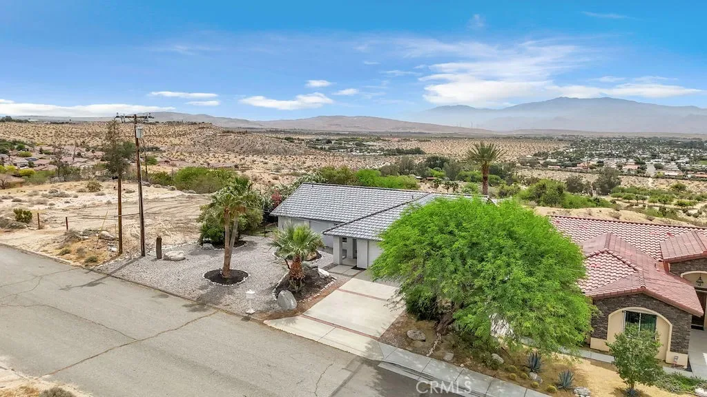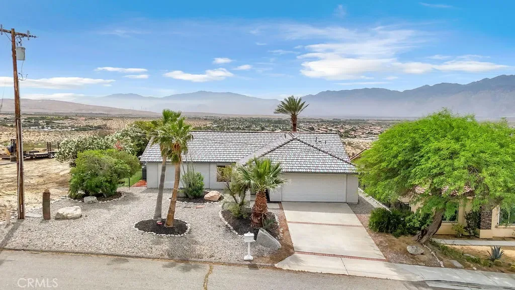 Perched atop Miracle Hill, this beautifully remodeled hilltop home offers breathtaking, unobstructed views of the San Jacinto and San Gorgonio mountain ranges. Designed for both comfort and entertaining, the backyard features a sparkling pool with spa and waterfall, extensive flatwork, stamped concrete, and a full-length covered patio—perfect for enjoying the surrounding scenery and desert sunsets. Inside, the home showcases high-gloss marble-style tile flooring, a spacious living room with vaulted ceilings, and an abundance of natural light. Sliding glass doors from the living room, dining area, and primary bedroom create a seamless indoor-outdoor flow, opening directly to the pool and panoramic views. The kitchen is thoughtfully updated with antique-style cabinetry, custom stone countertops, a designer stone backsplash, and matching Samsung stainless steel appliances, including microwave, oven, refrigerator, and dishwasher. A large pantry and direct access to the garage add convenience. All bedrooms are well-appointed, with ceiling fans and updated lighting throughout the home. The secondary bedrooms feature mirrored closet doors, with one offering private patio access. The guest bathroom includes upgraded cabinetry, granite countertops, and a full tub with custom tile surround. The primary suite enjoys stunning mountain views, a spacious walk-in closet, and an en-suite bathroom with updated finishes. This exceptional property combines elevated positioning, quality upgrades, and resort-style outdoor living in a prime Desert Hot Springs location.