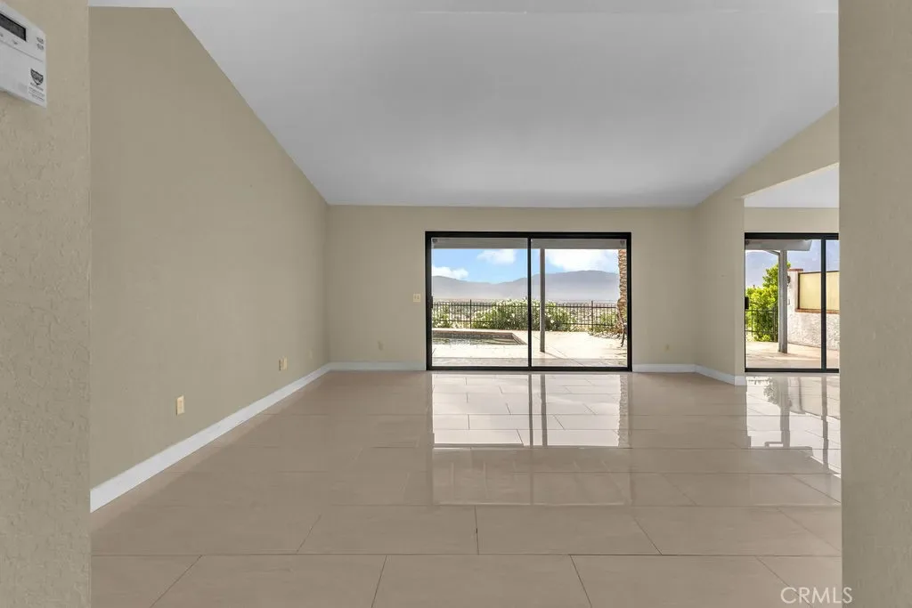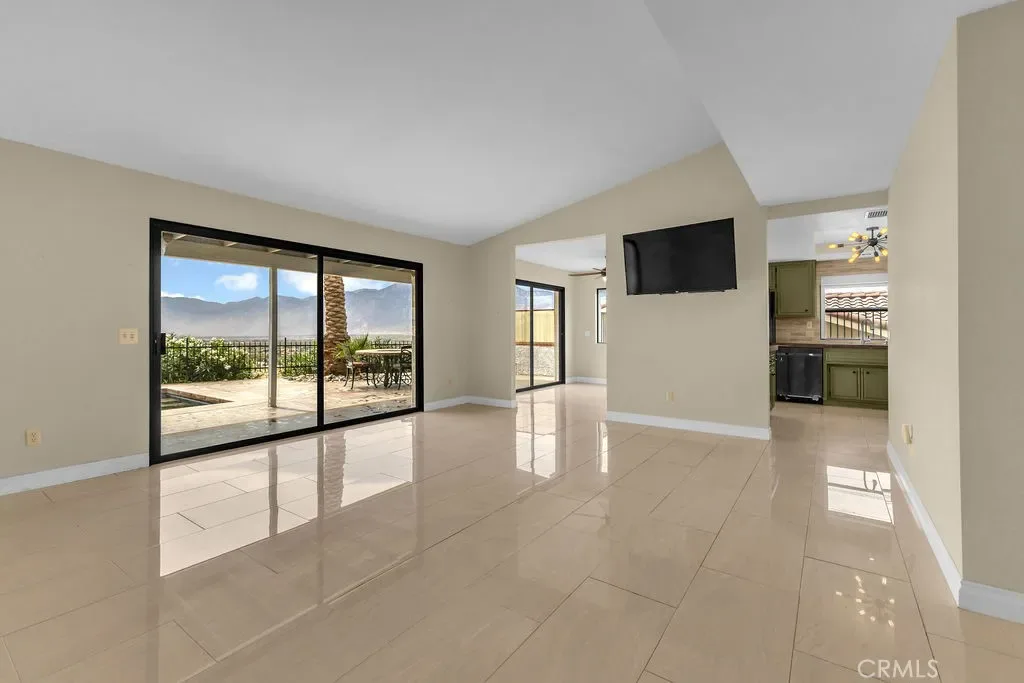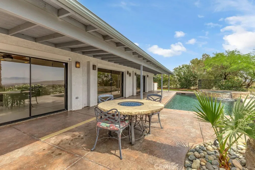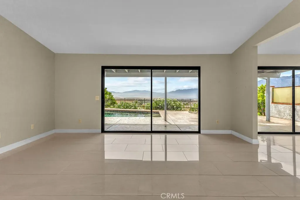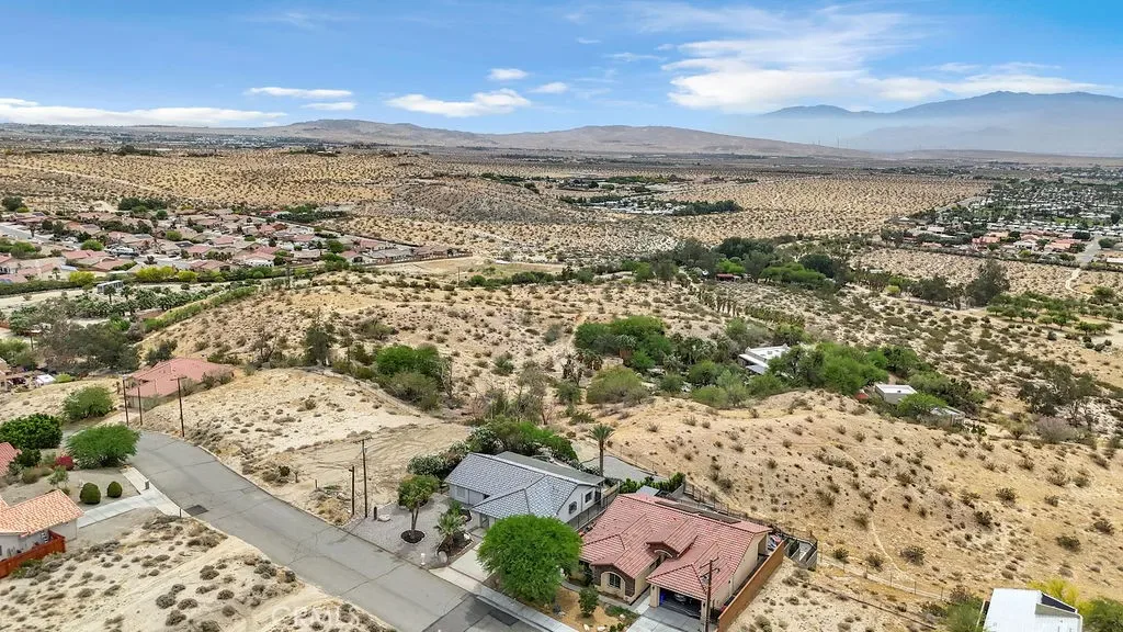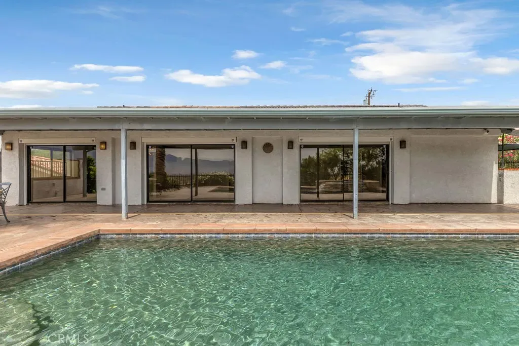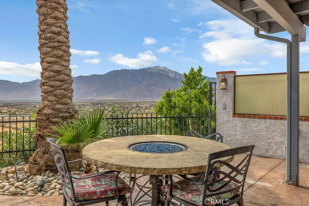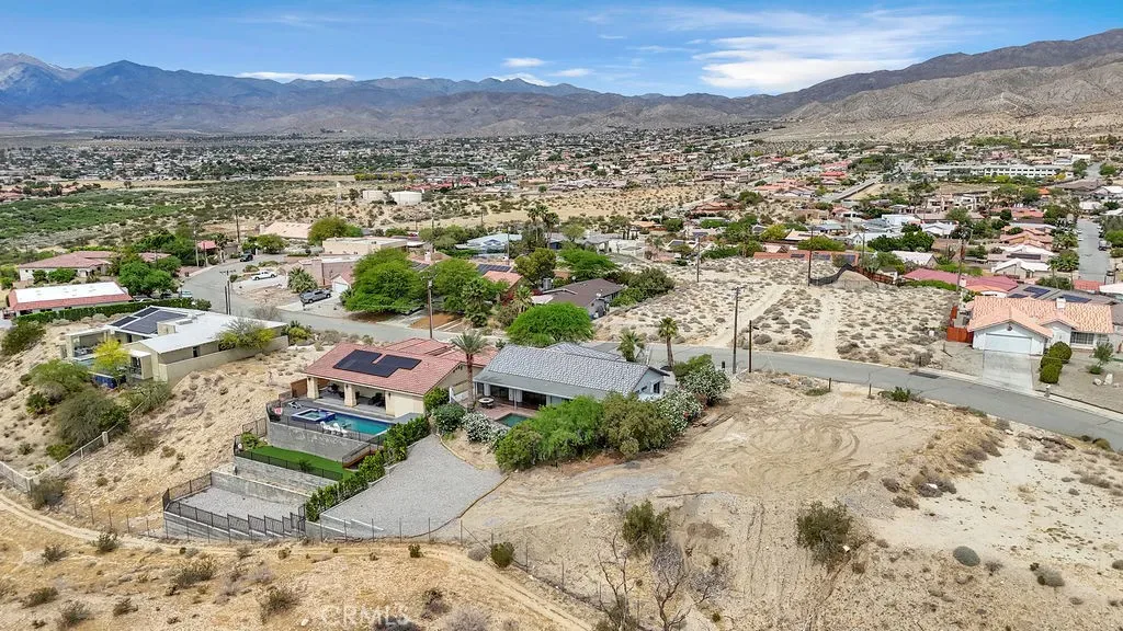 Perched atop Miracle Hill, this beautifully remodeled hilltop home offers breathtaking, unobstructed views of the San Jacinto and San Gorgonio mountain ranges. Designed for both comfort and entertaining, the backyard features a sparkling pool with spa and waterfall, extensive flatwork, stamped concrete, and a full-length covered patio—perfect for enjoying the surrounding scenery and desert sunsets. Inside, the home showcases high-gloss marble-style tile flooring, a spacious living room with vaulted ceilings, and an abundance of natural light. Sliding glass doors from the living room, dining area, and primary bedroom create a seamless indoor-outdoor flow, opening directly to the pool and panoramic views. The kitchen is thoughtfully updated with antique-style cabinetry, custom stone countertops, a designer stone backsplash, and matching Samsung stainless steel appliances, including microwave, oven, refrigerator, and dishwasher. A large pantry and direct access to the garage add convenience. All bedrooms are well-appointed, with ceiling fans and updated lighting throughout the home. The secondary bedrooms feature mirrored closet doors, with one offering private patio access. The guest bathroom includes upgraded cabinetry, granite countertops, and a full tub with custom tile surround. The primary suite enjoys stunning mountain views, a spacious walk-in closet, and an en-suite bathroom with updated finishes. This exceptional property combines elevated positioning, quality upgrades, and resort-style outdoor living in a prime Desert Hot Springs location.
