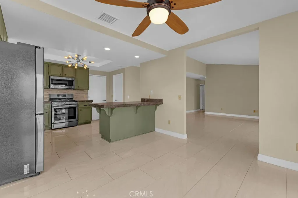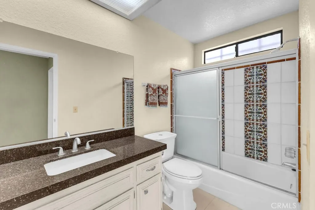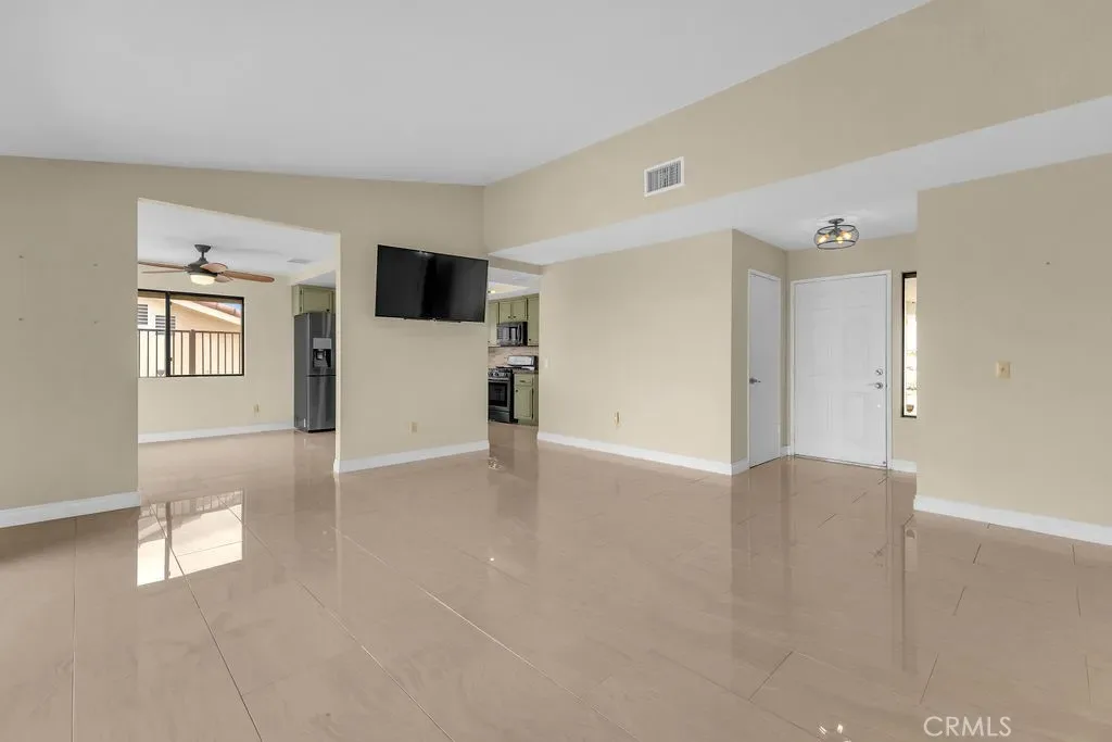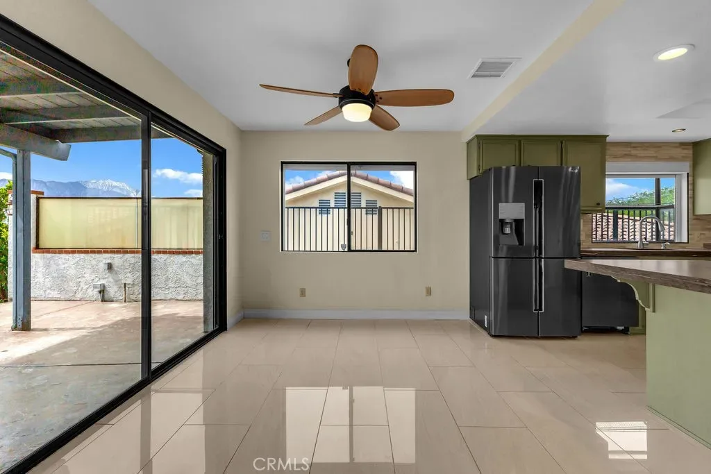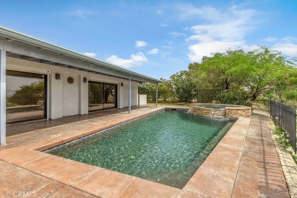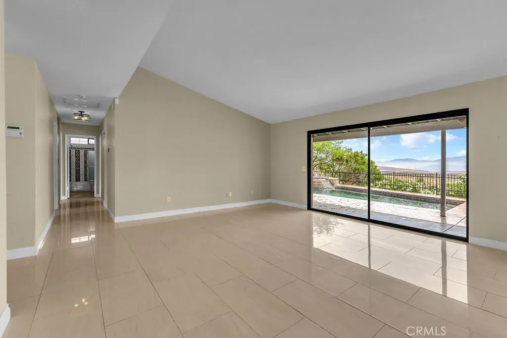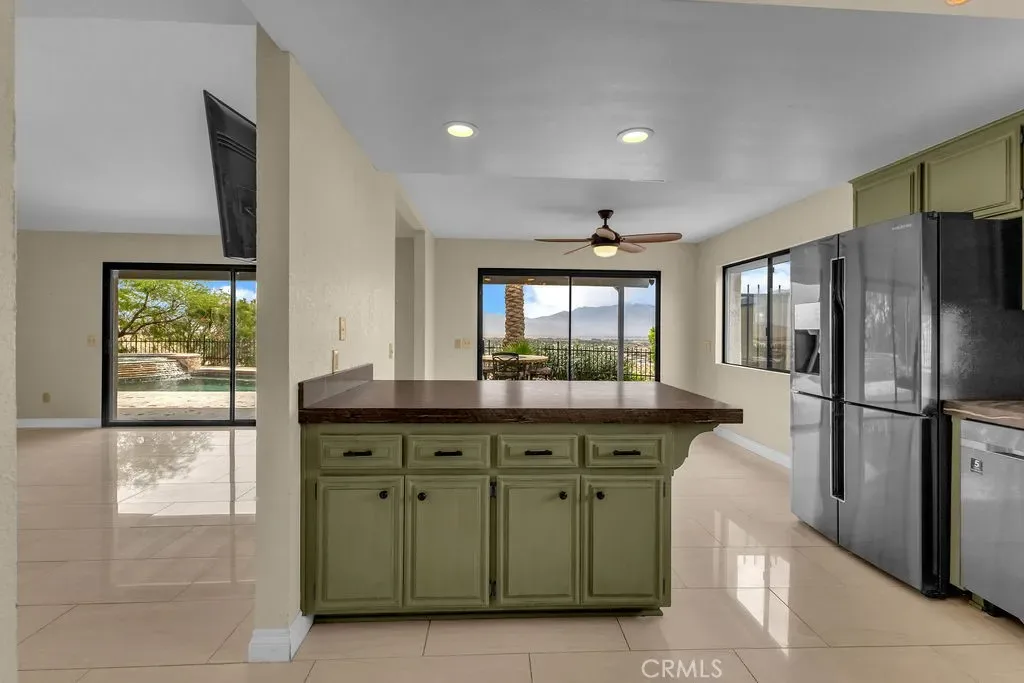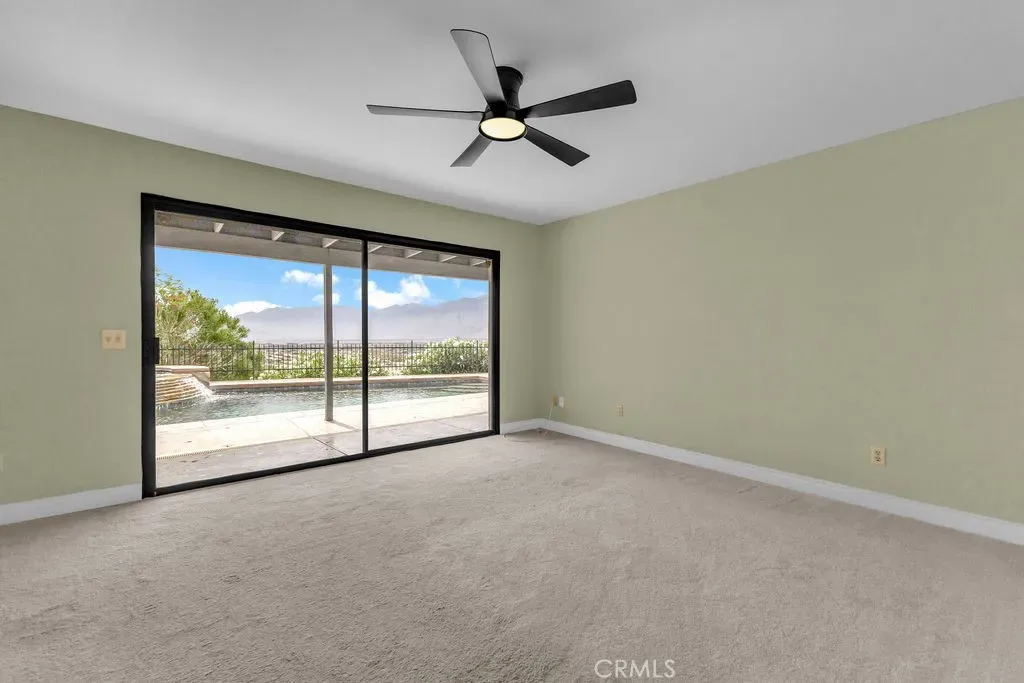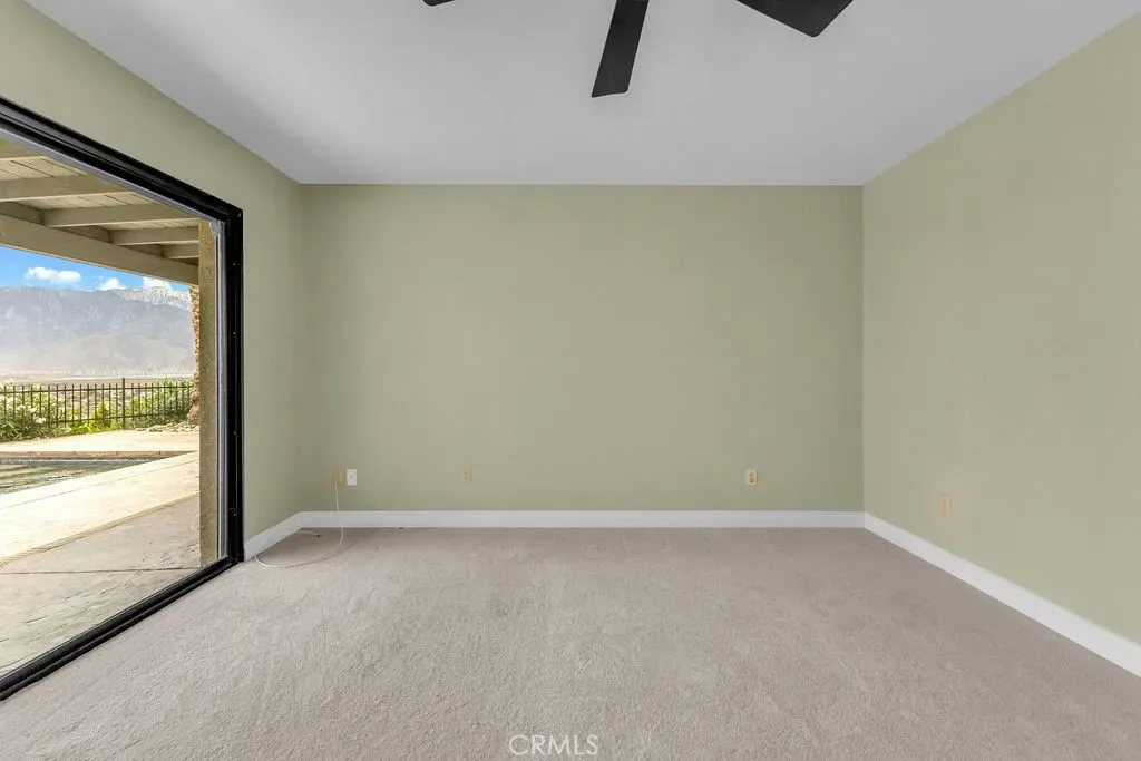 Perched atop Miracle Hill, this beautifully remodeled hilltop home offers breathtaking, unobstructed views of the San Jacinto and San Gorgonio mountain ranges. Designed for both comfort and entertaining, the backyard features a sparkling pool with spa and waterfall, extensive flatwork, stamped concrete, and a full-length covered patio—perfect for enjoying the surrounding scenery and desert sunsets. Inside, the home showcases high-gloss marble-style tile flooring, a spacious living room with vaulted ceilings, and an abundance of natural light. Sliding glass doors from the living room, dining area, and primary bedroom create a seamless indoor-outdoor flow, opening directly to the pool and panoramic views. The kitchen is thoughtfully updated with antique-style cabinetry, custom stone countertops, a designer stone backsplash, and matching Samsung stainless steel appliances, including microwave, oven, refrigerator, and dishwasher. A large pantry and direct access to the garage add convenience. All bedrooms are well-appointed, with ceiling fans and updated lighting throughout the home. The secondary bedrooms feature mirrored closet doors, with one offering private patio access. The guest bathroom includes upgraded cabinetry, granite countertops, and a full tub with custom tile surround. The primary suite enjoys stunning mountain views, a spacious walk-in closet, and an en-suite bathroom with updated finishes. This exceptional property combines elevated positioning, quality upgrades, and resort-style outdoor living in a prime Desert Hot Springs location.
