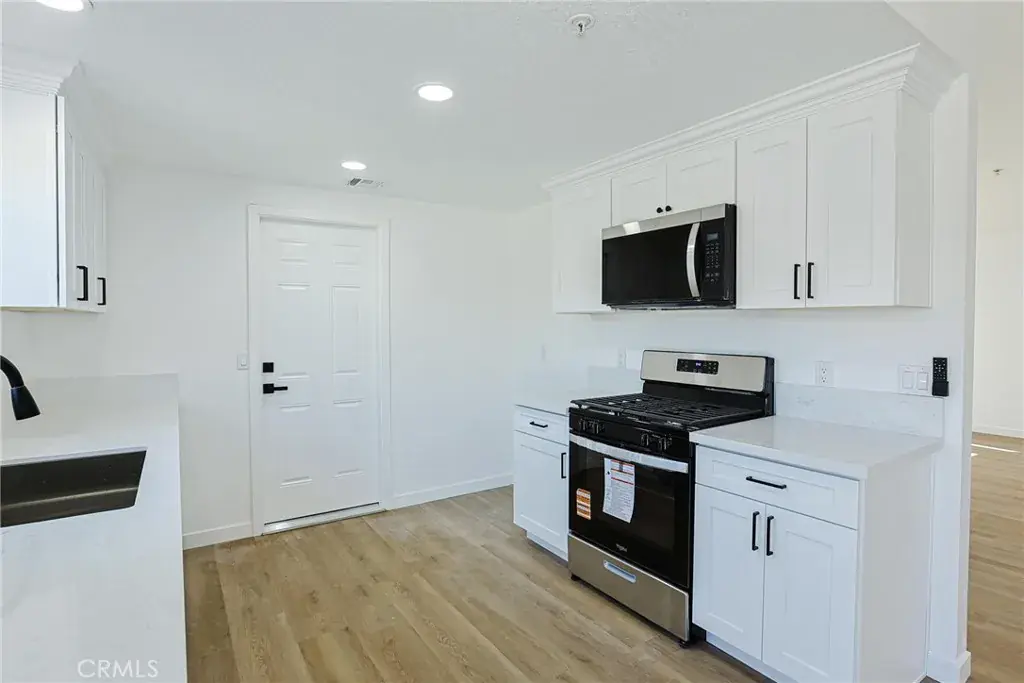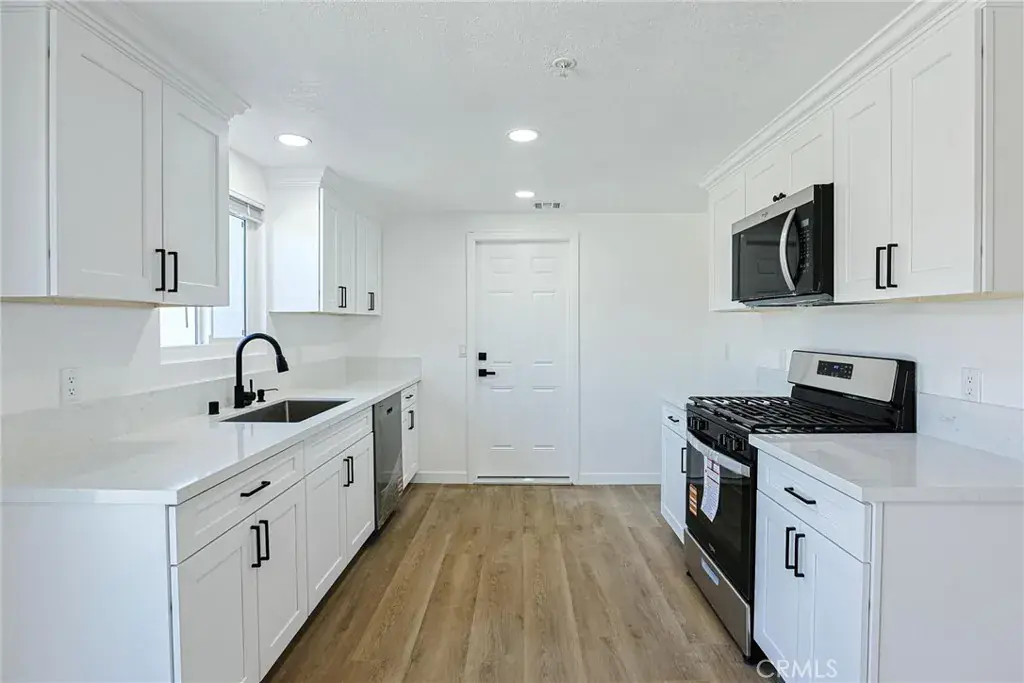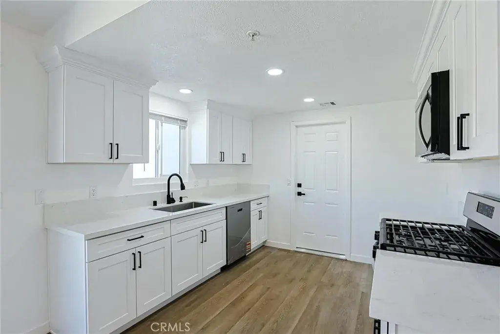 Interior highlights include newer flooring, fresh interior paint, recessed lighting, and an open living area with ample natural light. The kitchen has been updated with white shaker-style cabinetry, quartz-style countertops, stainless steel appliances, and modern black hardware, offering a clean and cohesive design. Adjacent dining and living areas provide direct access to the rear yard through a sliding glass door.