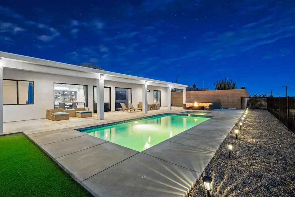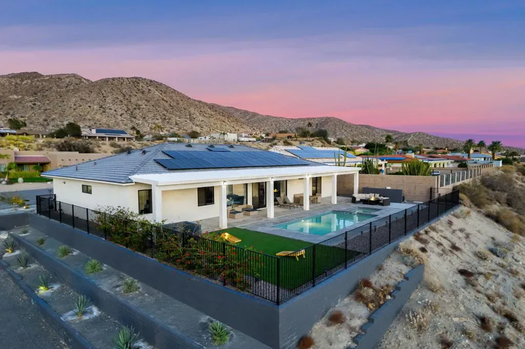Welcome to the pinnacle of custom luxury living, where comfort meets entertainment. Nestled in the heart of the Coachella Valley, this stunning 3,300 square-foot home offers panoramic views of the breathtaking San Jacinto Mountains, setting the stage for modern living at its finest.This custom built residence boasts 4 spacious bedrooms, 3.5 bathrooms, two home offices, and a game room, alongside a formal living room. The open-concept kitchen, dining, and great room create an ideal space for family gatherings and entertaining.The chef’s kitchen is a masterpiece, featuring high-end Dacor smart appliances, including a professional range, wall double oven, microwave combo, and separate 30-inch fridge and freezer columns. A large 10-foot kitchen island, quartz countertops, a walk-in pantry, and a wine fridge complete this culinary haven.The master suite is a luxurious retreat, offering a spa-like experience with a 6-foot soaking tub, separate dual vanities, an infrared sauna, and a large walk-in shower equipped with three shower heads, including a rainfall feature and a steam sauna for ultimate relaxation. The oversized master bedroom includes separate walk-in closets, with the larger closet featuring dedicated shoe storage.Step outside to your personal oasis, complete with a 78-foot covered patio, a saltwater pool, and a space perfect for outdoor entertainment. The built-in surround sound system and patio speakers set the mood for all your gatherings, while a cozy fire pit is perfect for relaxing evenings under the stars.With solar panels powering the entire house, enjoy the luxury of minimal electric bills. Plus, this home is just a short drive to Palm Springs Airport, downtown Palm Springs, and Joshua Tree National Parks offering the best of both seclusion and convenience.Minutes from nearby hiking trails, this home is perfect for those who crave luxury, outdoor adventure, and modern amenities in one incredible package. Don’t miss your chance to lease this magnificent property!