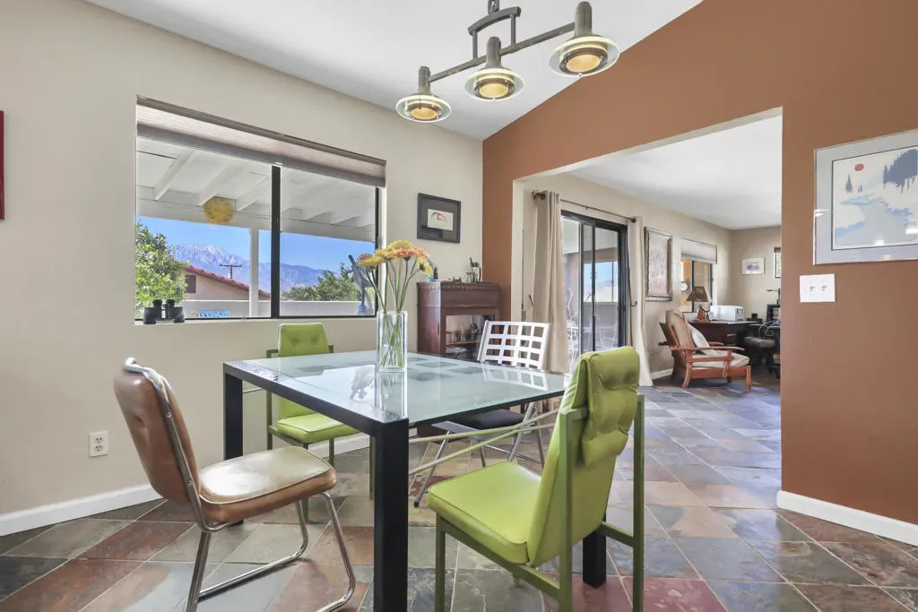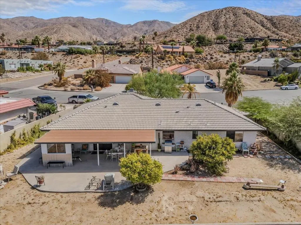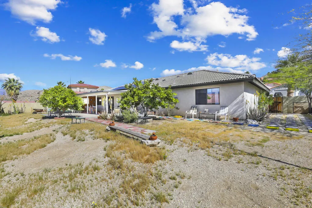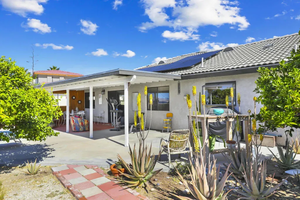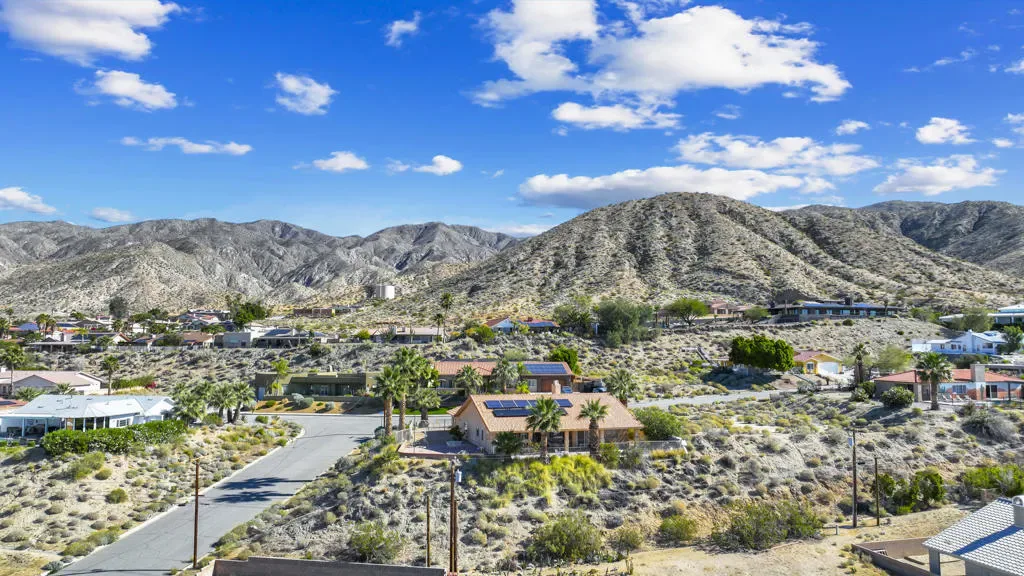 Seller offering buyer $12,000 towards their closing cost with an successful closing. Perched above the city, this private desert retreat offers an elevated blend of serenity, style, and effortless living, framed by sweeping mountain views. Designed for both relaxation and versatility, the expansive, fully enclosed backyard presents a rare opportunity to create a custom resort setting with room for a pool and spa. With NO HOA and exceptional short-term rental or investment potential, the property is ideally positioned just minutes from Palm Springs and Joshua Tree National Park. A generous covered patio extends the living experience outdoors–perfect for entertaining or enjoying tranquil desert evenings. Inside, a thoughtfully designed layout features three bedrooms plus a den, offering flexibility for guests, work, or leisure. Slate and laminate flooring provide a cohesive, low-maintenance aesthetic throughout. The living room is anchored by a striking stacked stone fireplace, creating a warm and inviting focal point. The kitchen offers abundant cabinetry and opens to picturesque backyard and mountain vistas. The primary suite serves as a peaceful retreat and walk-in closet, while two additional bedrooms ensure comfort and privacy for guests. Bonus – owned solar. Call today to schedule your appointment to view this home.