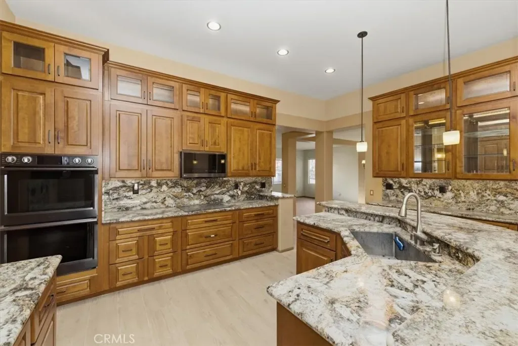 Tucked away on a quiet cul-de-sac in a highly desirable Eastvale community, this spacious single-story home offers a well-designed floor plan. The 4-bedroom, 2.5-bath home features a spacious and functional open layout ideal for both comfortable daily living and effortless entertaining. The interior includes expansive living and family rooms with high ceilings, a well-appointed kitchen with ample custom built in cabinetry, double oven, above range microwave, granite countertops, recessed lighting, and lots of counter space with an open flow that creates a bright, welcoming atmosphere throughout. Generously sized bedrooms provide flexibility for guests or a home office, while the primary suite serves as a private retreat complete with a cozy fireplace, an ensuite bath, walk in closet, jetted tub, stand in shower with custom tiled walls, double sink vanity, all providing a vast amount of space. Situated on a generous sized lot, the home offers a private backyard perfect for outdoor gatherings or relaxation, built in BBQ area, covered patio with ceiling fan, and lush green landscape. The attached multi-car garage provides ample parking and storage all with fresh paint and added epoxied floors. All paid large Solar panel system. Located within the Corona–Norco Unified School District, and conveniently close to parks, shopping, dining, and major commuter routes including the 91 and 15 freeways, this property blends space, comfort, and location in a sought-after suburban setting. This home is a must see!