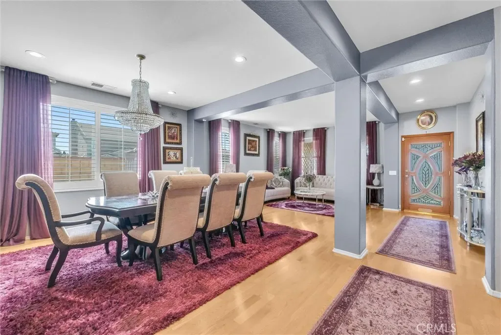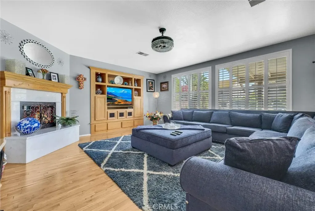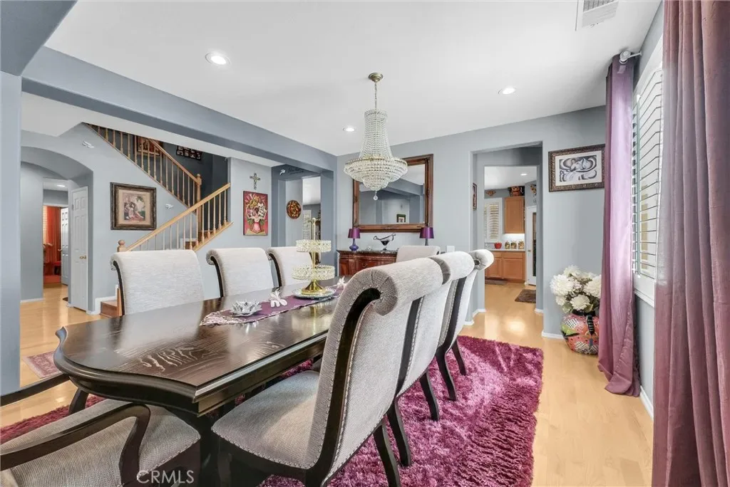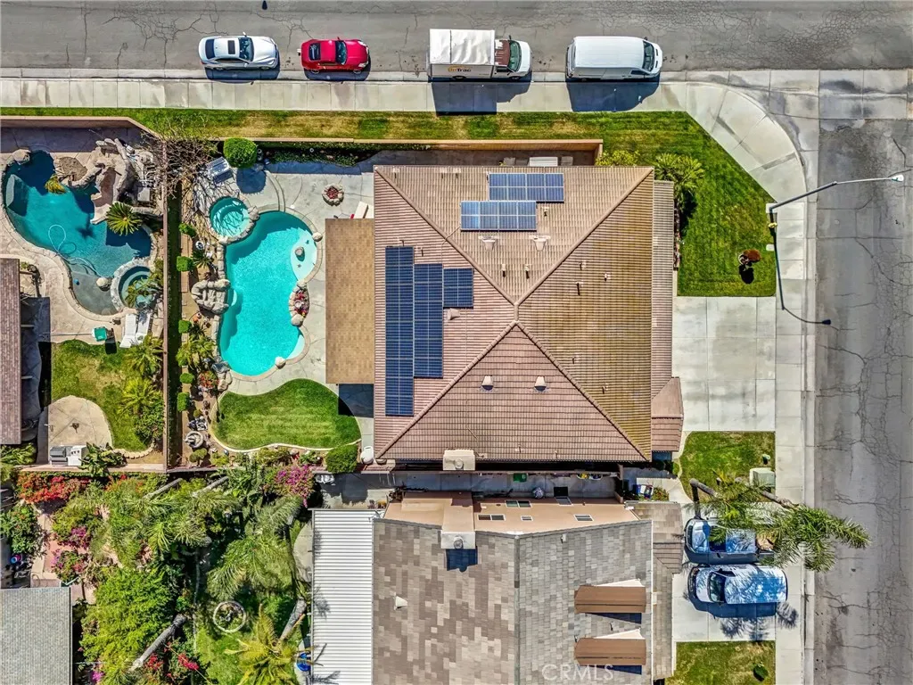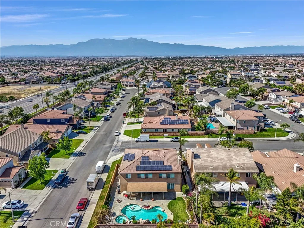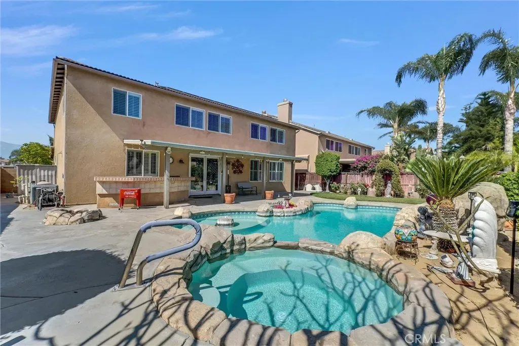 This impeccably maintained two-story home is a must-see! Located on a desirable corner lot in a great area of Eastvale, This home offers 4,220 square feet of elegant living space, featuring 5 spacious bedrooms and 3 full bathrooms. Beveled glass accents throughout add a touch of sophistication. A generous size bedroom and full bathroom are conveniently located on the main floor—perfect for guests, in-laws, or a home office. The main floor also includes an individual utility/laundry room for added convenience. The gourmet kitchen is a chef’s dream, showcasing a granite island, walk-in pantry, KitchenAid appliances, and beveled glass cabinet doors. Adjacent to the kitchen is a built-in desk and a huge great family room complete with a elegant marble fireplace and custom entertainment center. Upstairs, you’ll find a HUGE loft/bonus room that can be transformed into a home theater, game room, or anything you envision. 4 additional bedrooms upstairs and 2 share a Jack-and-Jill bathroom, while elegant crown molding and beautiful flooring enhance the space. The luxurious primary suite features a large walk-in closet, a second closet, and an en-suite bath with marble flooring, dual sinks, a soaking tub, and a separate shower. Plantation shutters and ceiling fans throughout the home provide both style and privacy. Step outside to your own backyard paradise—complete with a beautifully designed sparkling pool, rock waterfall, jacuzzi, built-in BBQ, and a cozy firepit area—perfect for entertaining or relaxing year-round. Additional features include solar panels, two HVAC units, 3 car garage and is in a prime location near the distinguished Corona-Norco School District, with easy access to freeways, shopping, dining, and the Silver Lakes Equestrian and Sports Park.