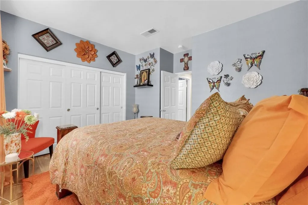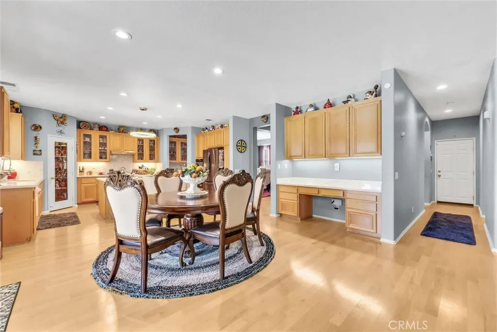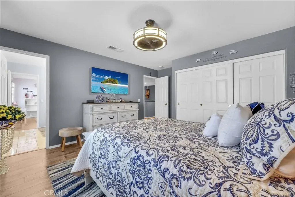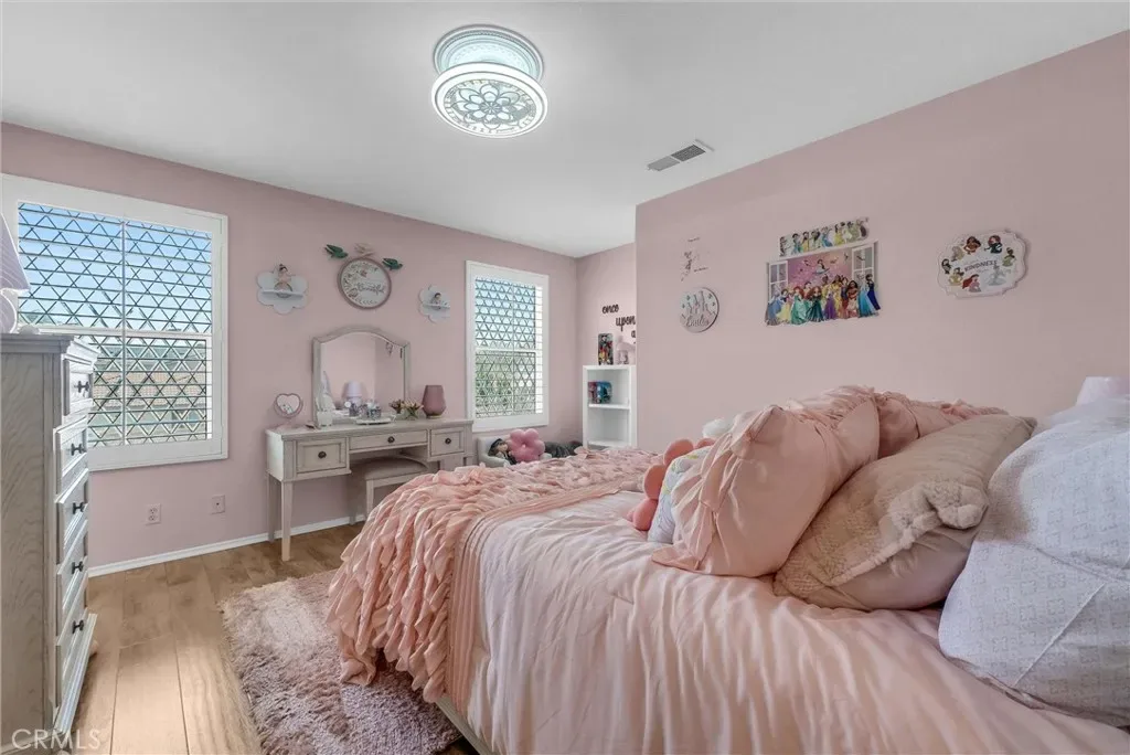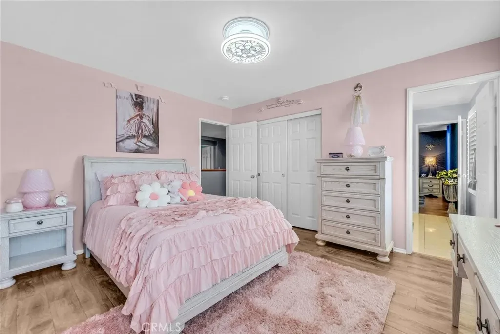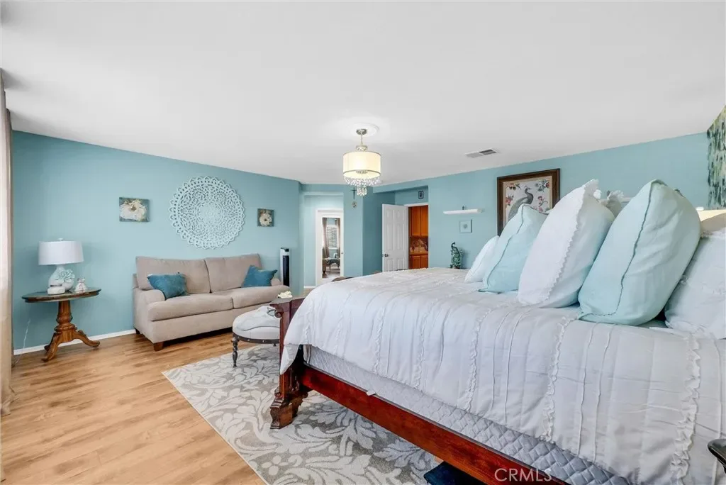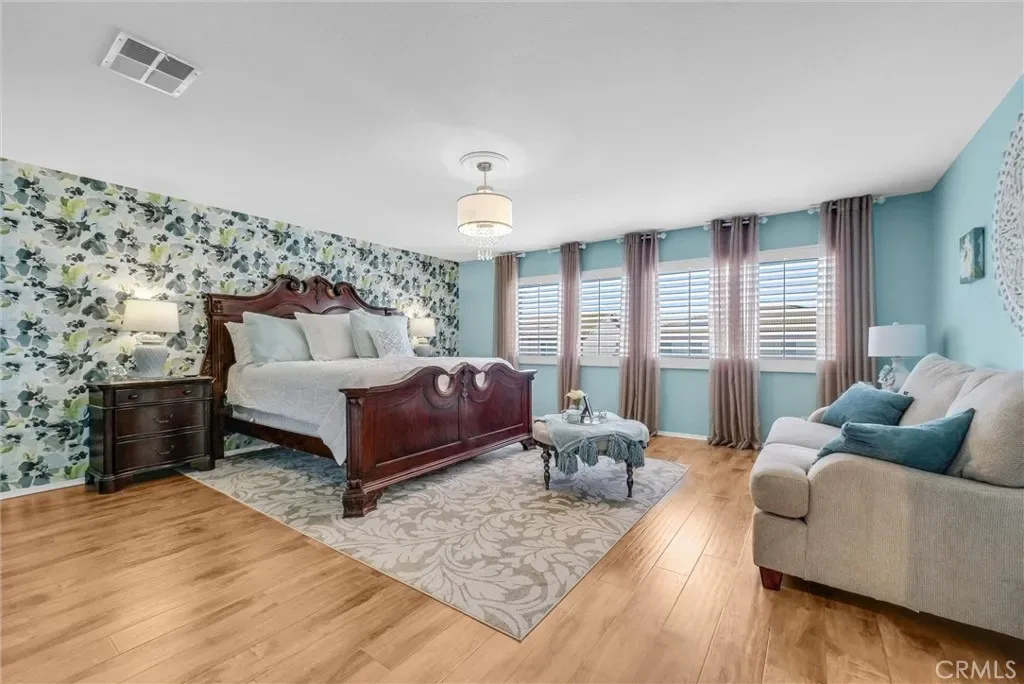 This impeccably maintained two-story home is a must-see! Located on a desirable corner lot in a great area of Eastvale, This home offers 4,220 square feet of elegant living space, featuring 5 spacious bedrooms and 3 full bathrooms. Beveled glass accents throughout add a touch of sophistication. A generous size bedroom and full bathroom are conveniently located on the main floor—perfect for guests, in-laws, or a home office. The main floor also includes an individual utility/laundry room for added convenience. The gourmet kitchen is a chef’s dream, showcasing a granite island, walk-in pantry, KitchenAid appliances, and beveled glass cabinet doors. Adjacent to the kitchen is a built-in desk and a huge great family room complete with a elegant marble fireplace and custom entertainment center. Upstairs, you’ll find a HUGE loft/bonus room that can be transformed into a home theater, game room, or anything you envision. 4 additional bedrooms upstairs and 2 share a Jack-and-Jill bathroom, while elegant crown molding and beautiful flooring enhance the space. The luxurious primary suite features a large walk-in closet, a second closet, and an en-suite bath with marble flooring, dual sinks, a soaking tub, and a separate shower. Plantation shutters and ceiling fans throughout the home provide both style and privacy. Step outside to your own backyard paradise—complete with a beautifully designed sparkling pool, rock waterfall, jacuzzi, built-in BBQ, and a cozy firepit area—perfect for entertaining or relaxing year-round. Additional features include solar panels, two HVAC units, 3 car garage and is in a prime location near the distinguished Corona-Norco School District, with easy access to freeways, shopping, dining, and the Silver Lakes Equestrian and Sports Park.