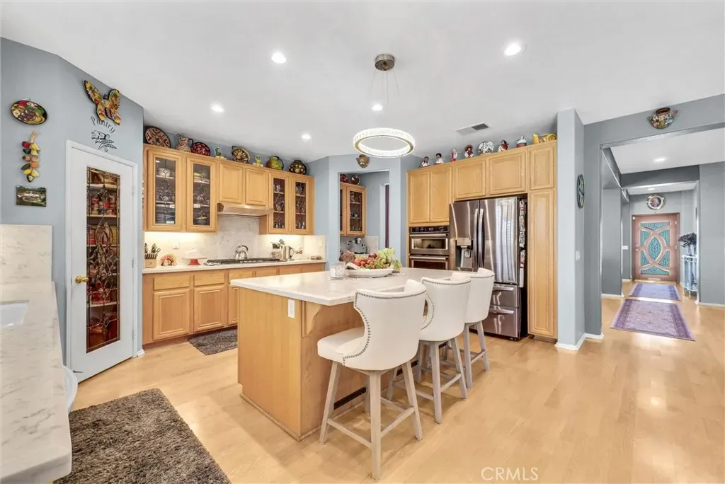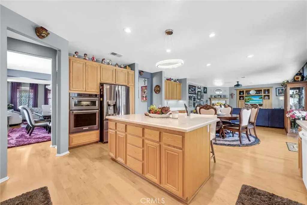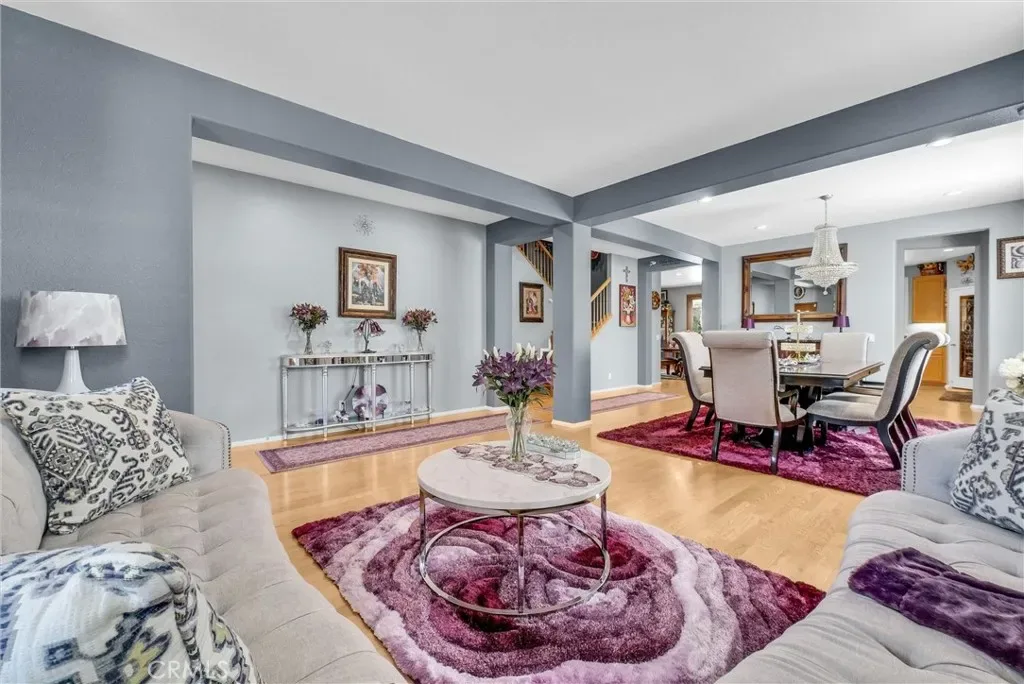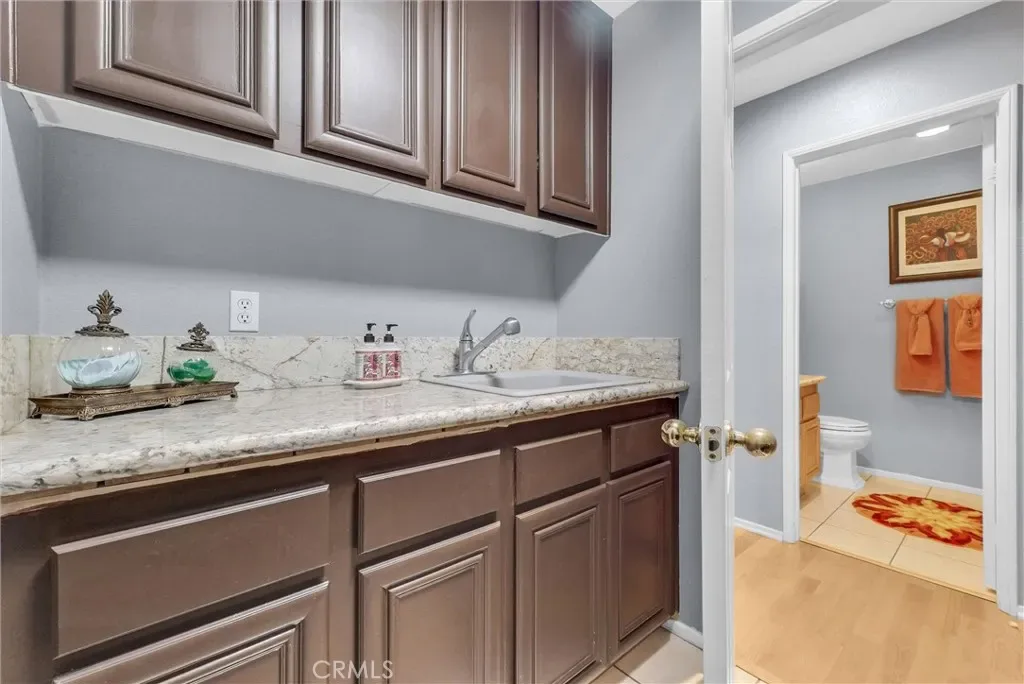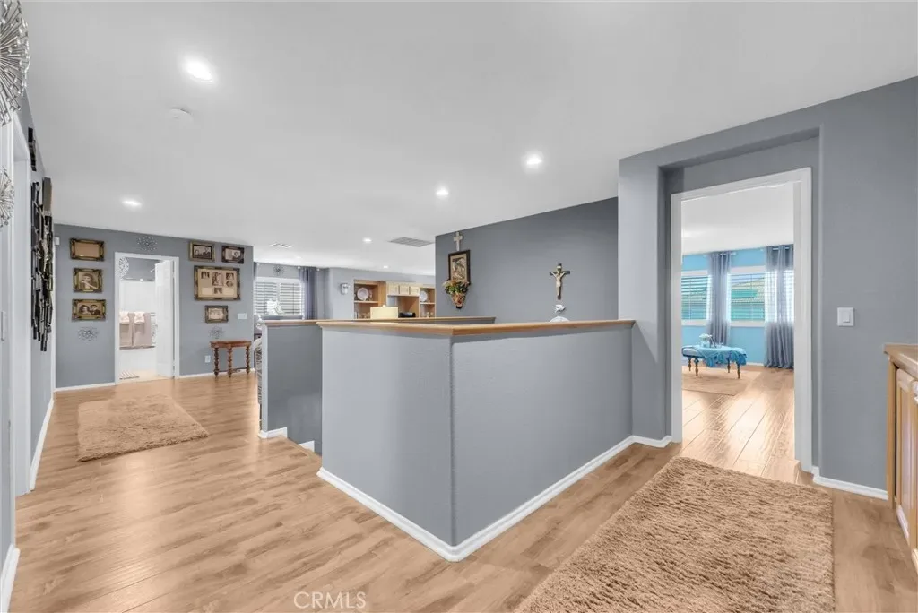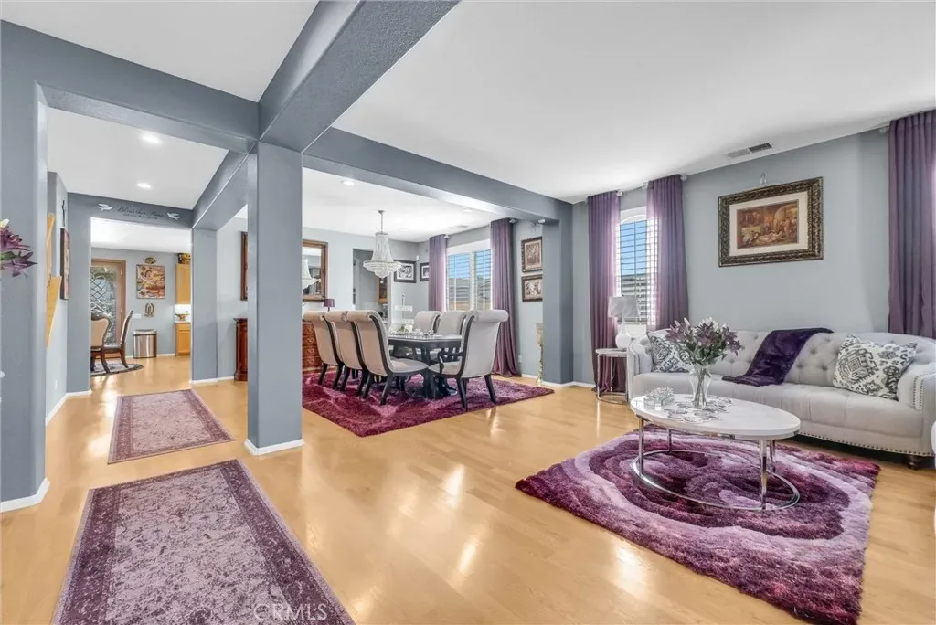 This impeccably maintained two-story home is a must-see! Located on a desirable corner lot in a great area of Eastvale, This home offers 4,220 square feet of elegant living space, featuring 5 spacious bedrooms and 3 full bathrooms. Beveled glass accents throughout add a touch of sophistication. A generous size bedroom and full bathroom are conveniently located on the main floor—perfect for guests, in-laws, or a home office. The main floor also includes an individual utility/laundry room for added convenience. The gourmet kitchen is a chef’s dream, showcasing a granite island, walk-in pantry, KitchenAid appliances, and beveled glass cabinet doors. Adjacent to the kitchen is a built-in desk and a huge great family room complete with a elegant marble fireplace and custom entertainment center. Upstairs, you’ll find a HUGE loft/bonus room that can be transformed into a home theater, game room, or anything you envision. 4 additional bedrooms upstairs and 2 share a Jack-and-Jill bathroom, while elegant crown molding and beautiful flooring enhance the space. The luxurious primary suite features a large walk-in closet, a second closet, and an en-suite bath with marble flooring, dual sinks, a soaking tub, and a separate shower. Plantation shutters and ceiling fans throughout the home provide both style and privacy. Step outside to your own backyard paradise—complete with a beautifully designed sparkling pool, rock waterfall, jacuzzi, built-in BBQ, and a cozy firepit area—perfect for entertaining or relaxing year-round. Additional features include solar panels, two HVAC units, 3 car garage and is in a prime location near the distinguished Corona-Norco School District, with easy access to freeways, shopping, dining, and the Silver Lakes Equestrian and Sports Park.