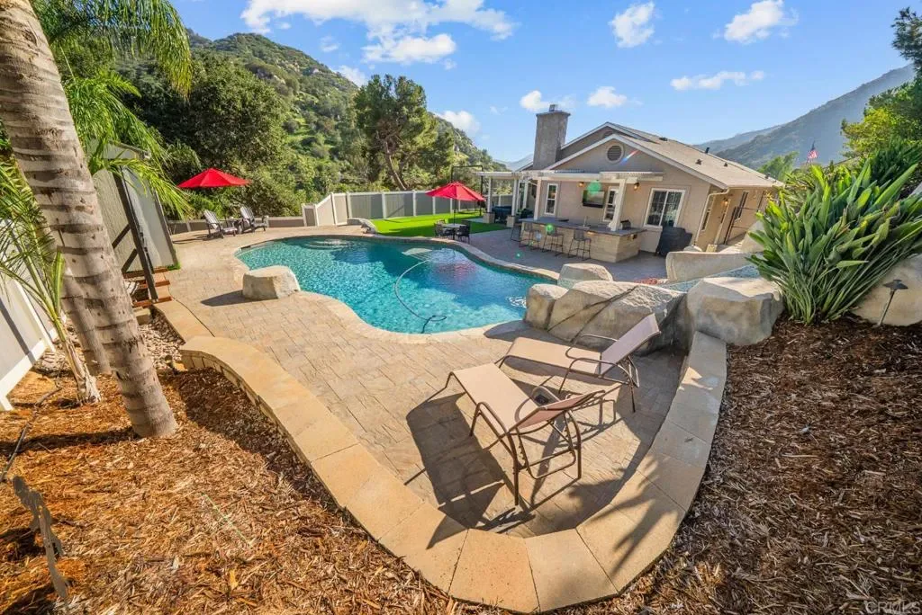 Absolutely stunning!! You will love this 3 bedroom (with optional 4th bedroom), 2 bath, single story home. Custom-built in 2004. Ideally situated on an end lot with scenic views, this exceptional El Cajon home offers the perfect blend of quality construction, thoughtful upgrades, and resort-style outdoor living. The beautifully landscaped grounds are designed for both function and fun, featuring a curbed concrete driveway, RV clean-out, auto drip irrigation, and low-maintenance synthetic turf throughout the front, side, and backyard. Enjoy added lifestyle features like a putting green, Iron Horse batting cage system, and a welcoming covered front porch with rock columns, Belgard pavers, and enclosed rail fencing. The backyard is truly a showstopper—built for entertaining and everyday enjoyment. A stunning saltwater pool (2017) by Heritage Pools showcases a continuous Baja shelf, pebble finish, and an impressive rock slide with boulders, steps, and a jump rock. The outdoor space is complete with Belgard paver decking, retaining walls with lighting, a covered patio, and a fully equipped outdoor kitchen with stainless BBQ, refrigerator, sink, and storage. Recent upgrades add incredible value and peace of mind, including a new composite roof, updated windows, French and sliding doors, fresh stucco, and extensive exterior improvements completed in 2023. Additional enhancements include two patio covers, a private courtyard with pavers, custom Tuff Shed, low-voltage lighting, and full vinyl fencing. Inside, the home offers a spacious and well-appointed layout with vaulted ceilings, archways, and durable wood-look porcelain tile throughout the main living areas. The updated kitchen features granite countertops, stainless appliances, ample cabinetry with pull-out storage, and a functional layout for everyday living. Interior upgrades include fresh paint, new recessed lighting, and new carpet (2026). Additional highlights include an indoor laundry room, fireplace, wood-trimmed windows, and French doors that open to a private courtyard retreat. Storage is abundant with attic access in both the garage and primary closet. The 2-car garage includes windows, a sink, storage space, and a side access door. Solar included! This is a rare opportunity to own a turnkey property with premium upgrades, incredible outdoor amenities, and space to truly enjoy the San Diego lifestyle. Come see it today!