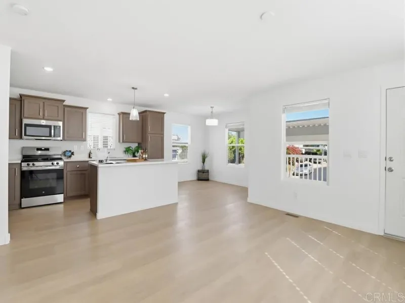 Never-lived-in 2025 manufactured home offering 2 bedrooms, 2 bathrooms, plus an optional 3rd bedroom or office/den. This thoughtfully designed home features a bright open-concept floor plan with abundant natural light from dual-pane windows throughout. The kitchen is both stylish and functional, showcasing quartz countertops, a center island with seating and pendant lighting, taupe shaker cabinets with brushed nickel hardware, and GE stainless steel appliances including a refrigerator, dishwasher, built-in microwave, and gas range/oven. Recessed lighting enhances the kitchen, hallway, and laundry areas, while the dining space is highlighted by a chandelier. Luxury vinyl plank flooring flows throughout the home, complemented by drywalled walls and window blinds for all windows. Both bedrooms and the optional den feature light fixtures. The primary bedroom includes a spacious walk-in closet, offering excellent storage. The primary bathroom features a walk-in shower with two corner seats, a single-sink vanity with ample countertop space, and generous cabinetry and drawers for storage. A linen closet and additional cabinet storage add convenience. The hall bathroom includes a tub and shower combination. Additional features include washer and dryer hookups and central heating and air conditioning for year-round comfort. Enjoy outdoor living on the front porch with Trex decking, offering space for a patio set and a relaxing place to take in the hillside views. The low-maintenance backyard and side yard provide space for gardening, pets, or outdoor enjoyment. Parking includes two side-by-side covered carport spaces. Pepperwood Mobile Home Park is a serene 55+ community at 1120 Pepper Dr, El Cajon, CA. Amenities include heated pool, spa, clubhouse with kitchen, billiards, library, card room, and more. Mature trees and a park-like setting create a peaceful, welcoming environment.
