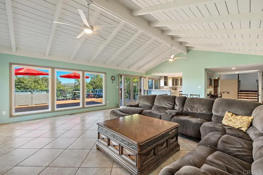 Tucked away in the exclusive and highly sought-after Horizon Hills community near Mt. Helix, this secluded 4-bedroom, 3-bathroom view home is a rare gem offering the perfect blend of privacy, space, and lifestyle. Set on nearly 0.8 acres of lush, gated grounds, this 2,820 sq ft traditional home with mid-century modern touches invites you into a world of serenity and sophistication. The interior boasts soaring vaulted ceilings with exposed beams, a bright open-concept living and dining area, and expansive windows that frame breathtaking panoramic views. The sunlit living room opens seamlessly onto a wraparound deck—ideal for indoor/outdoor entertaining with room to host gatherings under vibrant red umbrellas, or simply take in the tranquil mountain backdrop. The updated kitchen combines vintage charm with modern functionality, featuring custom stained glass cabinetry, sleek countertops, and stainless steel appliances. A spacious primary suite offers direct deck access and relaxing views—your personal retreat at the end of the day. Downstairs, discover even more flexibility with a secondary living area, perfect for multigenerational living or future ADU potential. The outdoor oasis includes a resort-style pool, mature fruit trees in the orchard, and lush tropical landscaping—providing both function and beauty. Solar panels offer energy efficiency, and the long, circular driveway adds convenience and curb appeal. Located within a top-rated school district and minutes from downtown El Cajon, Mt. Helix trails, and vibrant local amenities—this secluded estate combines location, lifestyle, and luxury in one unforgettable package.
