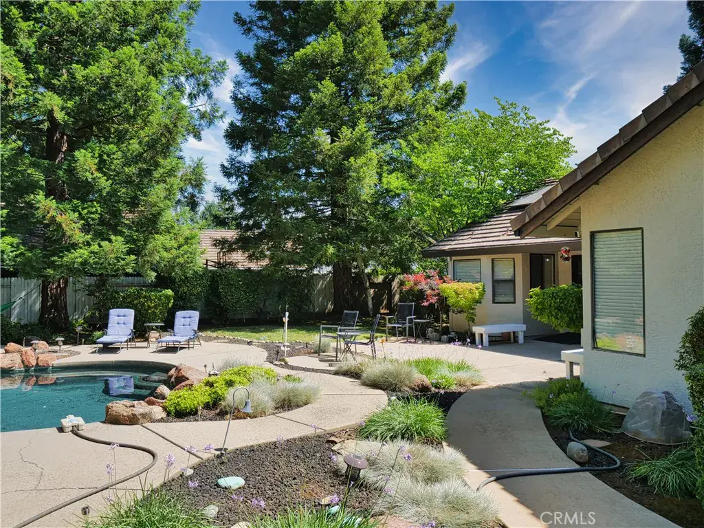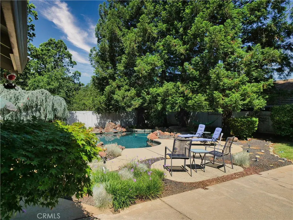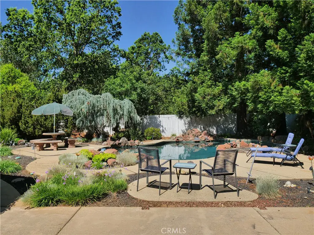 Large One Story Pool Home with Large Back Yard. Don’t miss this turnkey home in Stonegate Village. Kit & baths are tastefully updated. Warm colors, tile floors, both bathrooms have heated floors, Granite counters, & New Windows are among the many upgrades. Newer HVAC & Water Heater. Built in pool w/newer equipment for summer fun. Garden boxes, fruit trees and blueberry bushes complete this welcoming back yard. The side has room for RV/Boat storage. Walk to the nearby CSD Park & Community center or enjoy a hike along the New York creek trail. Large master bedroom with bathroom. Laundry room, solar panels paid off and included also alarm system included. Large back and front yard, new landscaping front and back yard. Backyard has a gate access to a beautiful nature walk site. 3 car garage and large back yard to build adu’s. Home is handicap accessible. Seller is open to including the furniture. Front and back yards have redwood trees. Lots of custom storage cabinets located in the garages. Master bedroom has custom walk in closet.
