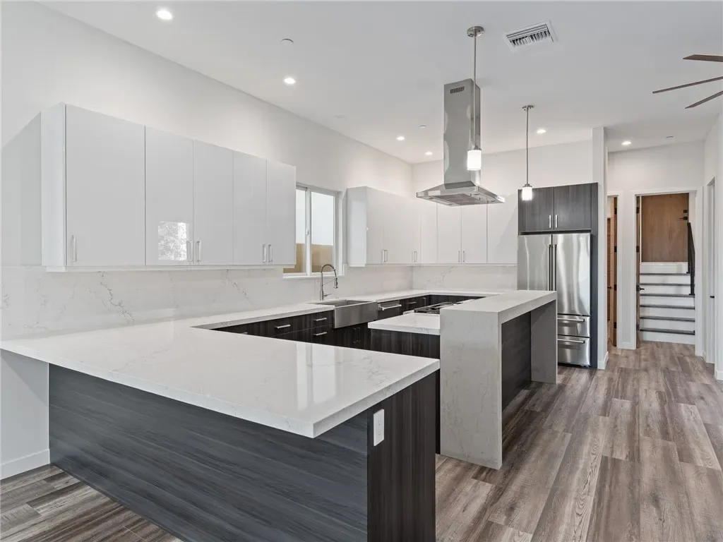 Stunning new-build house in a fantastic El Segundo location! This spacious two level home offers 4 bedrooms, 6 bathrooms, and almost 3,000 sq ft! The main level features an open concept living room with a half bathroom and extra storage space under the stairs. The living room flows directly into the large gourmet kitchen which boasts an oversized peninsula with quartz countertops and backsplash, a huge island with raised counters to seat four, and Thor kitchen appliances. Off of the kitchen, there’s a walk-in pantry along with a wine bar and dining area. At the rear of the main level, there is a bedroom with an en-suite bathroom, perfect for guests! The main level also features direct access to the oversized two-car garage and an additional laundry area/mud room. The second level boasts another living area with a gas fireplace and wine bar. The laundry room and another half bathroom conveniently sit adjacent to this living area. The expansive primary bedroom showcases a private balcony, fireplace, huge walk-in closet with a built-in mirror, and a large en-suite bath with separate tub and shower. There are also two additional bedrooms on this floor, each with their own en-suite bathrooms and built-in closet features. The deck off of the second level living area also provides direct access to the rooftop deck which supports water, gas, and electric uses and displays fantastic views of town, especially El Segundo Recreation Park.