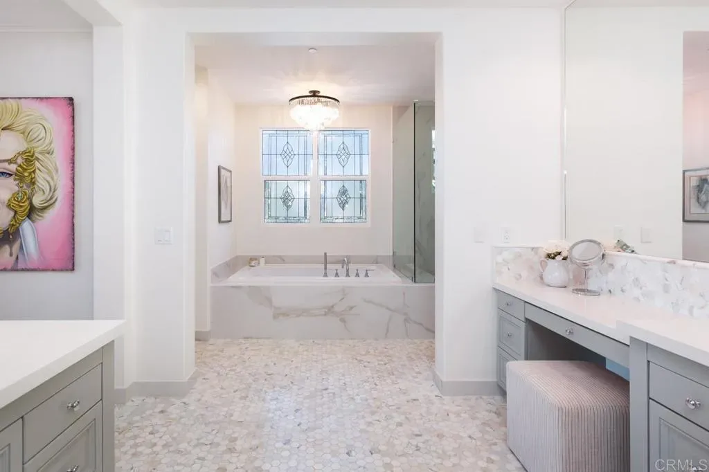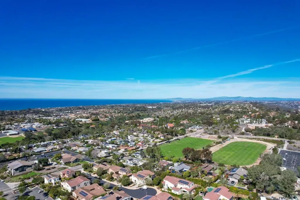 Situated on a premier cul-de-sac lot in coastal Encinitas, this exceptional former Warmington Homes showcase model offers luxury, space, and privacy on an oversized 12,233-sq-ft lot. This turnkey 5-bedroom, 5-bath residence blends elegant design with modern comfort — ideal for both everyday living and entertaining. A custom 8-foot front door opens to a dramatic two-story foyer, where wide-plank oak flooring flows throughout the main living areas. The light-filled great room features soaring ceilings, a striking west-facing wall of windows, and French doors that open to sun-drenched outdoor spaces. Formal living and dining areas, along with a built-in bar with dual beverage refrigerators, create the perfect setting for gatherings large or small. The chef’s kitchen is a true centerpiece, equipped with premium stainless-steel appliances, a 6-burner range with griddle, double convection ovens, a double-wide refrigerator, large farmhouse sink with purified water, walk-in pantry, and stunning Taj Mahal leathered quartzite countertops — all centered around an expansive island and open to the inviting family room with fireplace. A main-level bedroom with ensuite bath provides ideal accommodations for guests, extended family, or live-in support. Upstairs, the luxurious primary suite opens through French doors to a private ocean-view balcony — perfect for morning coffee and year-round sunsets. The spa-inspired bath features a soaking tub, oversized shower with bench, dual vanities with Hansgrohe fixtures, marble flooring, polished quartz counters, and an expansive walk-in closet. An additional ensuite bedroom with private balcony, two secondary bedrooms connected by an upgraded Jack-and-Jill bath, and a spacious light-filled bonus loft offer flexible space for a home office, media room, playroom, or retreat. The upstairs laundry room adds everyday convenience. The backyard is a rare coastal find — large, private, and beautifully landscaped. Enjoy an expansive lawn, raised garden beds, multiple patio areas, and a custom covered outdoor built-in BBQ and fireplace, creating distinct spaces for relaxation and entertaining. Additional highlights include, finished 3-car garage with epoxy floors, extensive built-in storage cabinets, overhead storage racks, owned whole-house Culligan water softener/conditioner, owned solar system. Ideally located near top-rated schools, parks, shopping, dining, beaches, historic Highway 101 and the El Camino Real corridor, with convenient freeway access.