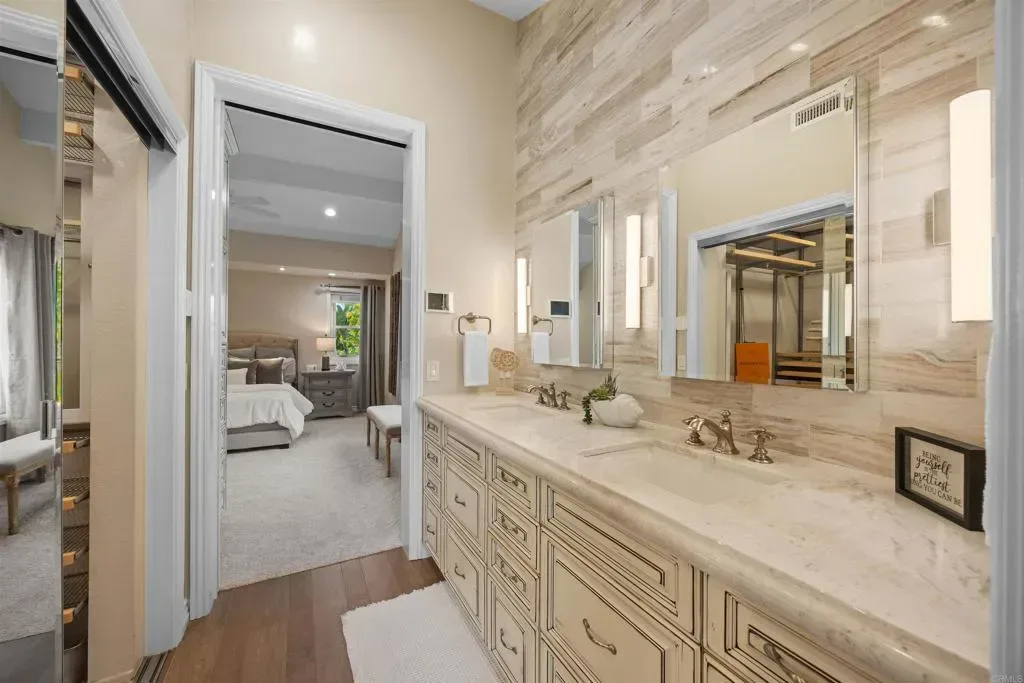 Nestled on a quiet cul-de-sac, this home offers the perfect blend of privacy, comfort, and effortless entertaining. From the moment you enter the private courtyard you’ll feel a sense of calm and escape—a space where traditional finishes meet tropical touches for an inviting, elevated atmosphere. At the heart of this home you will find a remodeled kitchen with quartz countertops and stainless steel appliances—flowing seamlessly into the family room, complete with theater-style lighting and integrated high-end surround sound, perfect for lively gatherings or quiet evenings. Acacia flooring flows throughout the lower level, complemented by plush new carpet upstairs. This fully integrated smart home system allows you to control audio, video, lighting, climate, security, and more from a single app/wall-mounted touch screens. The spacious primary suite offers a serene retreat with a fireplace, recently remodeled luxurious bath, and dual closets, including a custom walk-in closet with built-ins that maximize space and convenience. Outside, a resort-style backyard framed by mature tropical landscaping, custom lighting, a gas fire pit, in-ground spa, outdoor shower, fully equipped covered outdoor kitchen with stone countertops, and custom outdoor sound system invites unforgettable entertaining. As an added bonus, the expansive side and rear yard offers RV parking with full hookups, and also provides space suitable for a guest house or ADU. Ideally located just minutes from Encinitas beaches, shopping, dining, parks, and top-rated schools, this home captures the essence of coastal living with elegance, warmth, and ease.