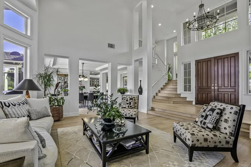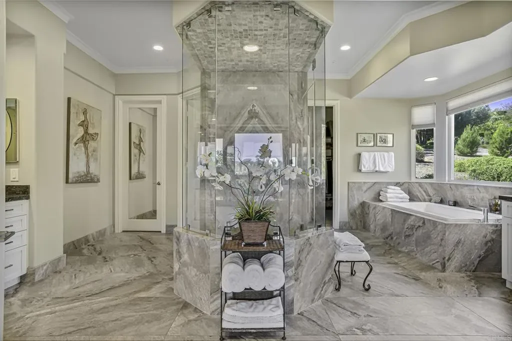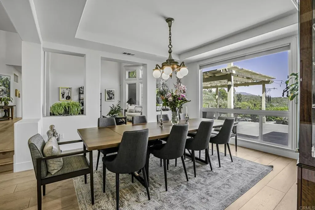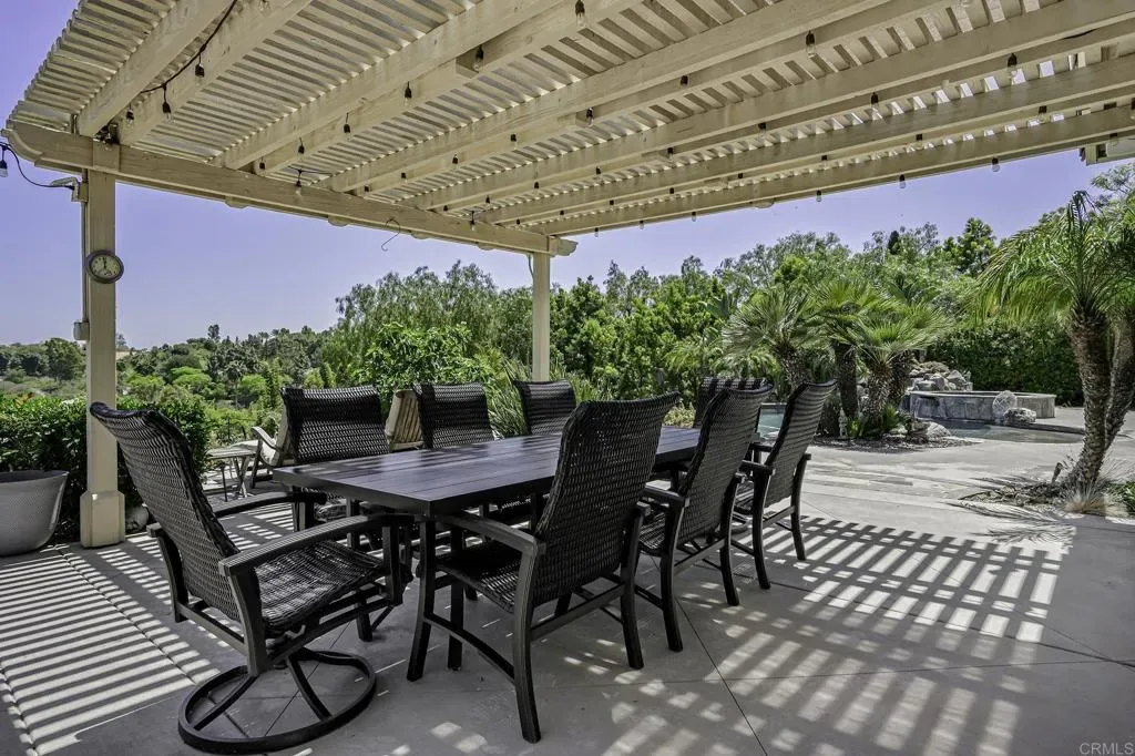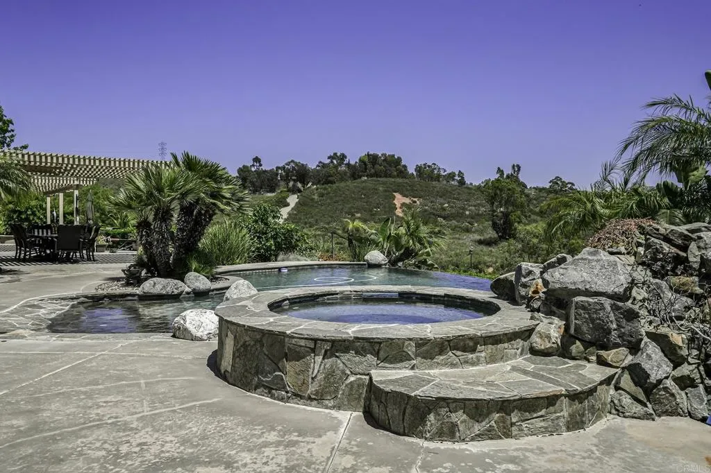 The Basics: 5 Bedrooms | 4 Full Baths | 2 Half Baths | 4,743 Sq Ft Resort-style Pebble Tec Pool & Spa with Waterfall | Pool House | Pickleball Sports Court | Panoramic Views | HOA $146 month. The Vibe: Light, bright, and soaring ceilings welcome you into a home that feels as good as it looks. This home is warm, welcoming, relaxed, and designed for connection — whether you’re entertaining or just unwinding. The chef-style kitchen is recently updated and ready for anything, whether you’re throwing dinner parties or heating up takeout. Peaceful nature views pour in from almost every room, setting the tone for everyday tranquility. Upstairs, a generous bonus living room makes the perfect teen hangout, media space, or private quarters for guests or a live-in companion. The existing Pool Table can be yours. Three on-suit bedrooms complete the upstairs. The Comforts: Lives like it’s a single level — the primary suite and a secondary bedroom are both downstairs. Primary suite is large, comfortable and comes with its own fireplace to enjoy on those cold winter nights. Owned solar keeps your energy bills low, with dual-zone A/C and heating to stay comfy year-round. Waterboy whole-house filtration system, central vacuum system. Additional comfort features include a wine fridge and warming drawer. The Grounds: You’ve got 2 private acres to roam — and it’s all yours. Serve it up on the Pickleball(ish) Sports Court (complete with basketball hoop), then cool off in the vanishing-edge pool or soak in the spa. Rinse off in your very own pool house, then head to the garden house or plan out that future ADU — there’s room for it. Want multiple fruit trees and herbs? Well you’ll have to plant those, but there are roses and a pomegranate tree. Plenty of room to get inspired with your gardening. Horse-friendly and full of possibility. Your Surroundings: Set within a peaceful gated community of manicured homes, you’re surrounded by open space, trails for hiking, biking and/or riding. A strong and welcoming Olivenhain vibe. Award-winning Encinitas school district and just a few miles to a plethora of shops, restaurants and other things to buy.