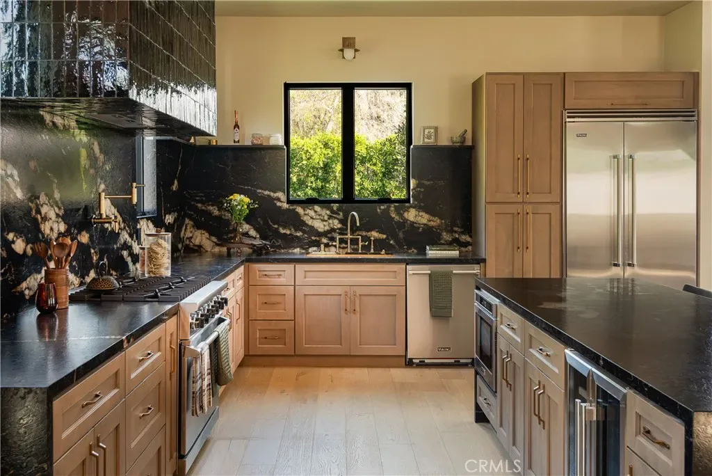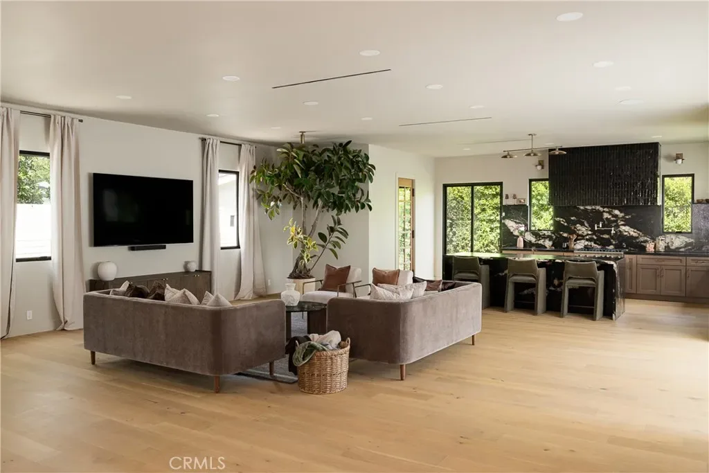 The tranquil backyard creates a true outdoor sanctuary, highlighted by a heated pool, cascading limestone waterfall, integrated spa, and Sonos outdoor sound system, all designed for seamless entertaining and relaxation. A refined exterior of smooth stucco, limestone accents, and mature olive trees sets a striking first impression, while the interior showcases warm natural materials, clean architectural lines, and curated finishes throughout. The chef’s kitchen serves as the centerpiece of the home, featuring custom walnut cabinetry with brass hardware, hand-selected natural stone countertops, a dramatic stone-wrapped island, handmade zellige tile hood, Viking appliances, and a spacious walk-in pantry.