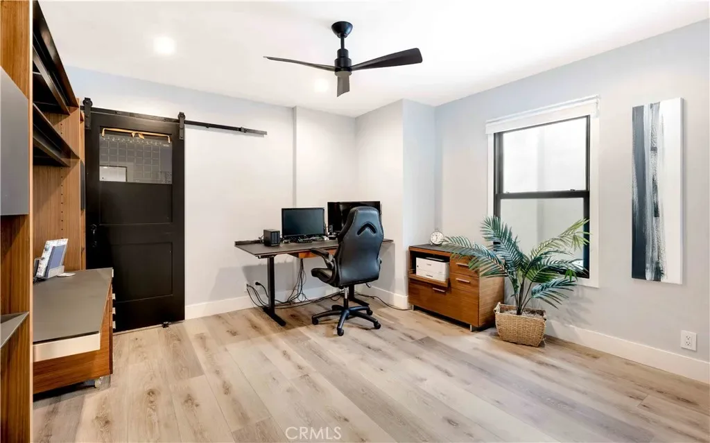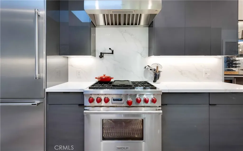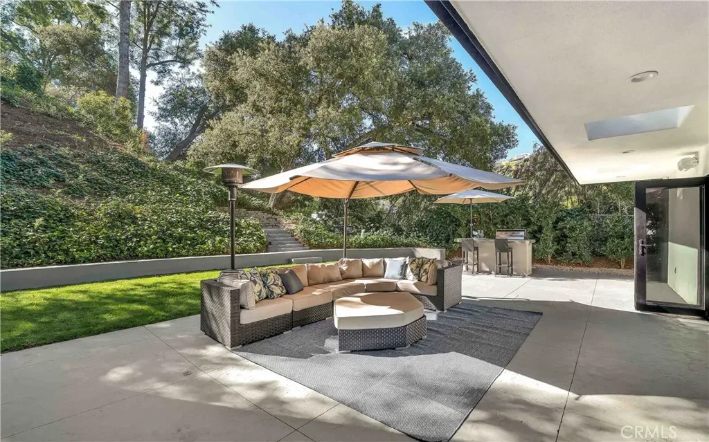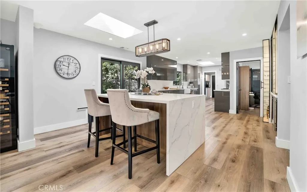 Located South of Ventura in Encino and zoned for award-winning Lanai Elementary School, this stunning single-story residence offers nearly 3,000 square feet of thoughtfully reimagined living space. Set back from the street for privacy, the five-bedroom, 3.5-bath home seamlessly blends sleek modern design with warm, inviting finishes and effortless indoor-outdoor living. At the heart of the home is a beautifully designed chef’s kitchen featuring striking Calcutta River quartz countertops, a dramatic waterfall island, seamless backsplash, custom cabinetry, premium Thermador appliances, and a 36″ Wolf Dual Fuel Range. A custom glass-enclosed wine and spirits display is a striking focal point, perfect for entertaining, flanked with a built-in wine fridge and a matching beverage fridge. Wide-plank contemporary flooring, recessed LED lighting, a stylish corner fireplace, and six custom skylights fill the home with natural light while highlighting the carefully curated designer details throughout. The spacious primary suite offers a private retreat with abundant natural light and a spa-inspired bath complete with a dual walk-in shower, soaking tub, custom vanity, and generous walk-in closet. Two additional bedrooms share a Jack-and-Jill bath, while another bedroom is currently configured as an office. A fifth bedroom, privately positioned with its own entrance and bathroom, provides flexibility for guests, an in-law suite, or a dedicated workspace. Additional features include a separate laundry room, dual Nest thermostats, updated HVAC ducting, newer windows, custom exterior finishes, ethernet throughout the home and outside, and lush landscaping. The expansive backyard is designed for entertaining with a covered patio for al fresco dining, plus a built-in BBQ and outdoor refrigerator. A rare opportunity to enjoy stylish, turnkey living in one of Encino’s most desirable neighborhoods with convenient Westside access.
