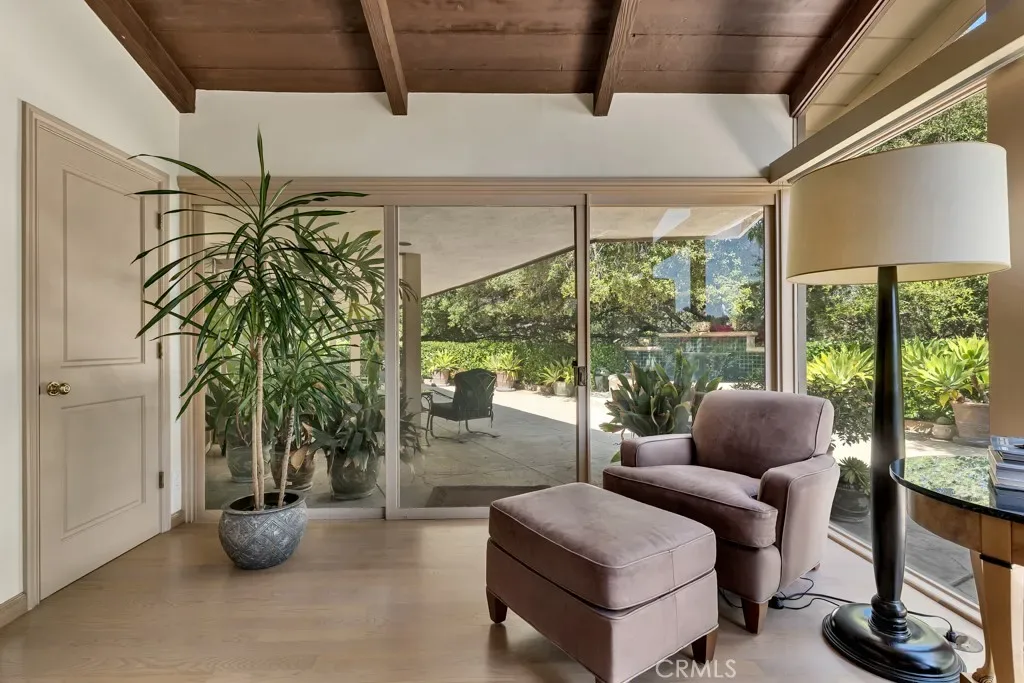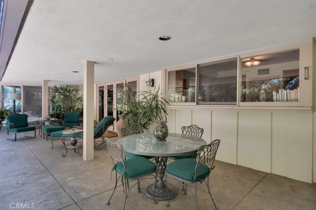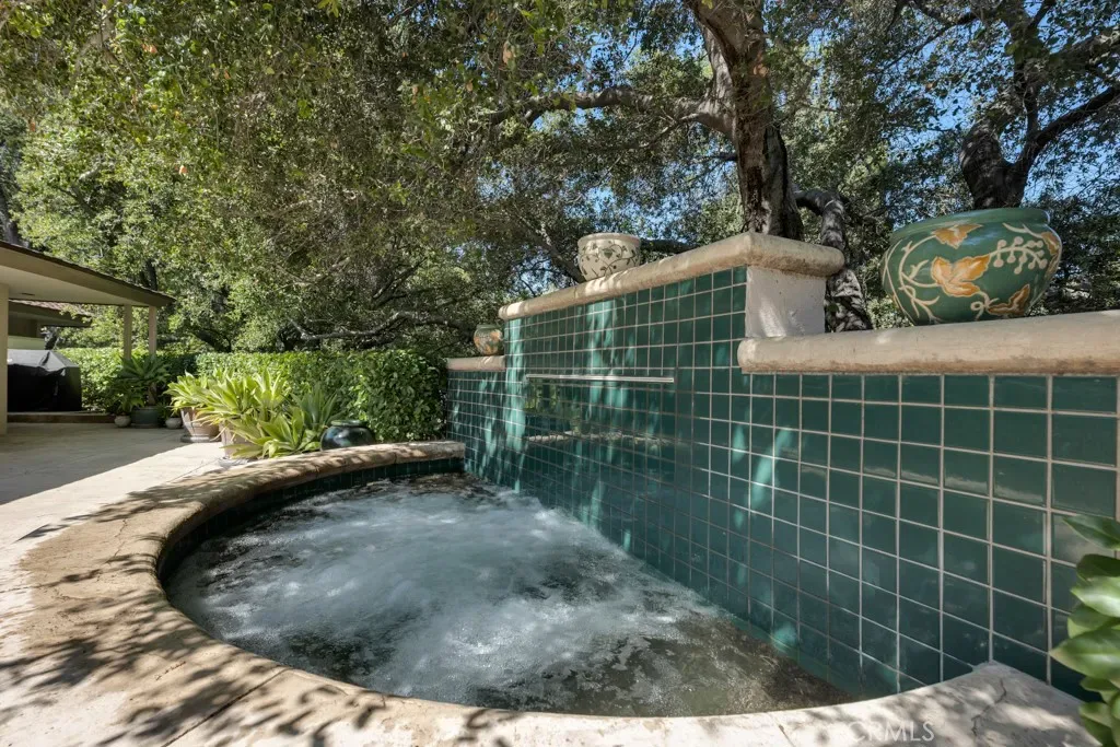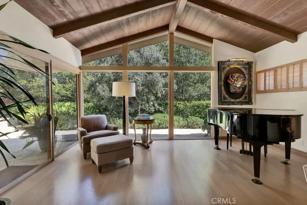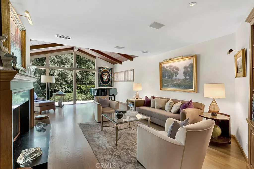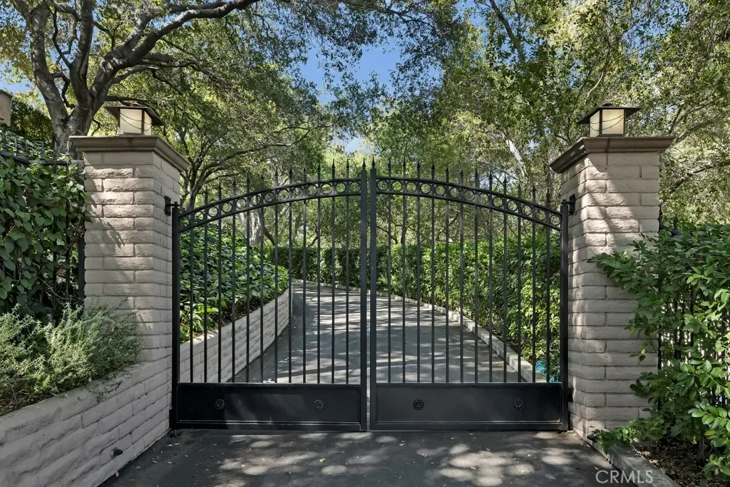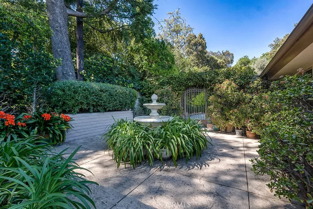 First time on the market in 50 years, this gated property offers the ultimate in privacy and is located in the highly desirable Lanai Road School District. The driveway winds through a forested lot of nearly 20,000 square feet, surrounded by graceful oak trees, olive trees, and other mature landscaping, and leads to a charming gated courtyard with a fountain. The single-story Mid-Century home features 3 bedrooms and 2.5 bathrooms. The living room showcases a French limestone fireplace, a wall of windows topped with clerestory windows, a beamed ceiling, and built-in bookcases, creating a bright and inviting space. The kitchen is appointed with granite counters and a Sub-Zero refrigerator/freezer. Hardwood floors run throughout most of the home, with carpeting in two bedrooms. The dining room features expansive wine-refrigerated closets and French doors that open to a covered patio with a spa/fountain finished in Pebble Tec plaster—perfect for indoor-outdoor entertaining. The primary suite offers an updated marble bathroom with dual vanities, a separate shower, and a soaking tub. A secondary bedroom is en suite with an updated three-quarter bathroom, while the third bedroom has been converted to an office with built-in desk and bookcases. Additional amenities include speakers throughout, a security system with cameras, a powder room off the foyer, and a laundry room with sink. A detached accessory room with speakers and air conditioning—currently used as a gym—adds flexible space to this special property.