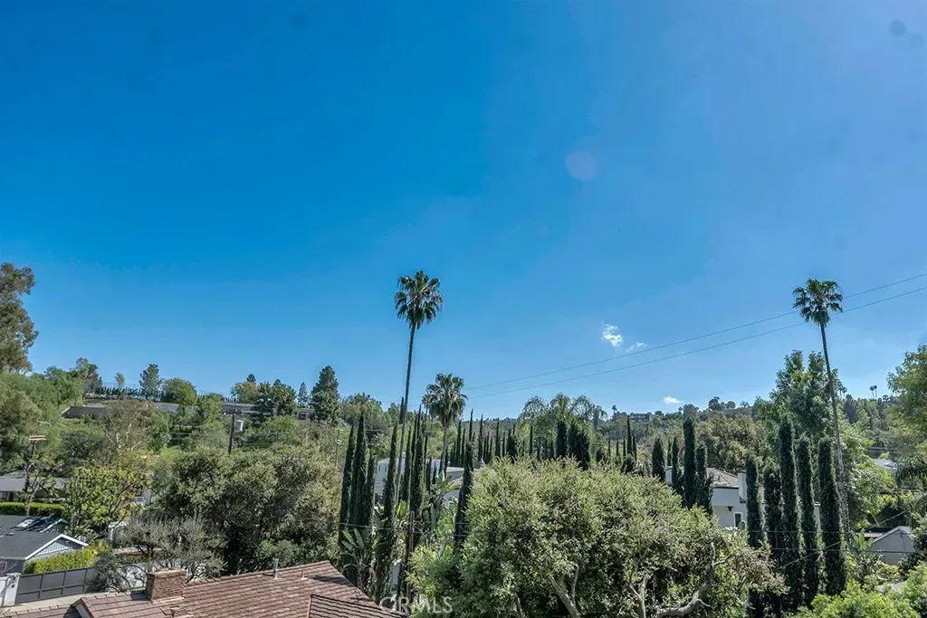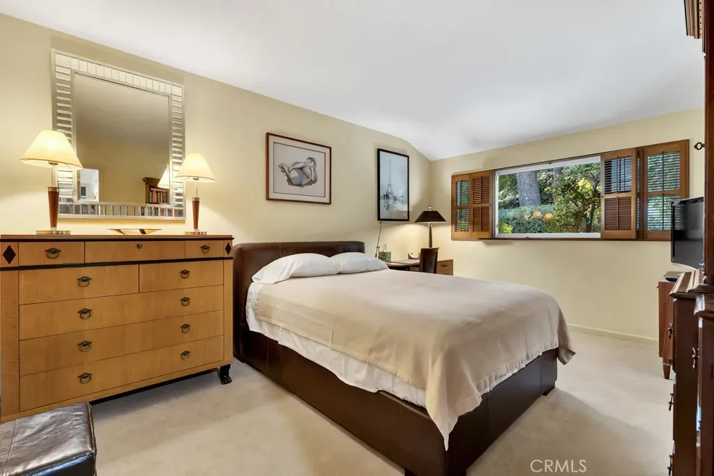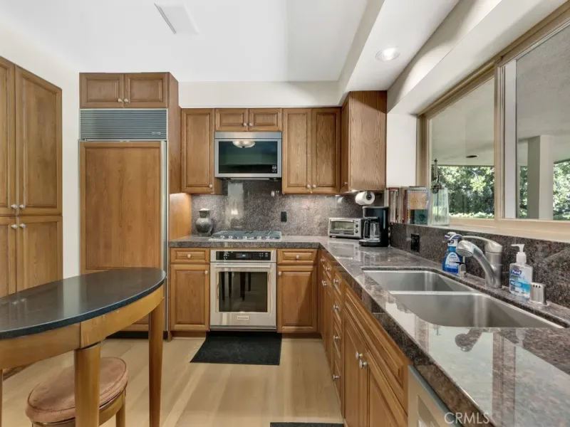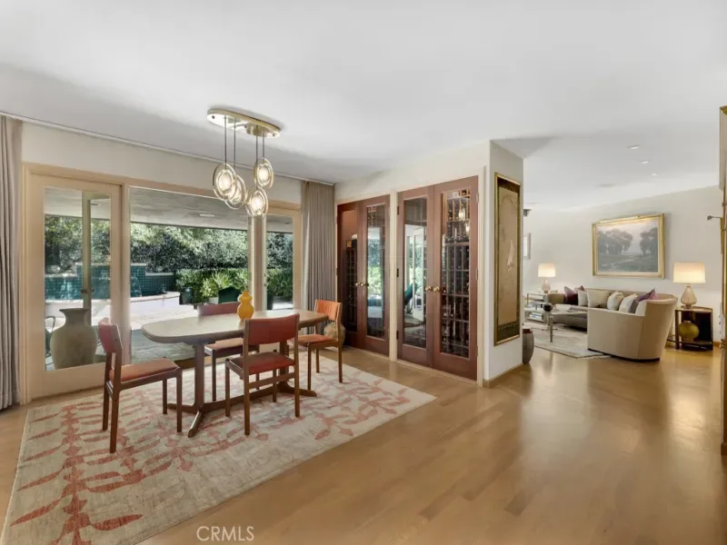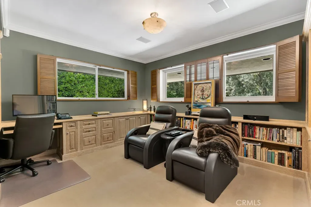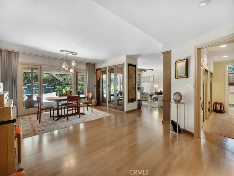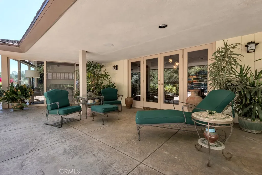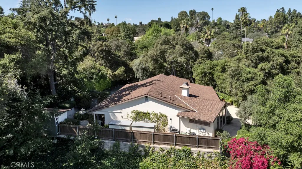 First time on the market in 50 years, this gated property offers the ultimate in privacy and is located in the highly desirable Lanai Road School District. The driveway winds through a forested lot of nearly 20,000 square feet, surrounded by graceful oak trees, olive trees, and other mature landscaping, and leads to a charming gated courtyard with a fountain. The single-story Mid-Century home features 3 bedrooms and 2.5 bathrooms. The living room showcases a French limestone fireplace, a wall of windows topped with clerestory windows, a beamed ceiling, and built-in bookcases, creating a bright and inviting space. The kitchen is appointed with granite counters and a Sub-Zero refrigerator/freezer. Hardwood floors run throughout most of the home, with carpeting in two bedrooms. The dining room features expansive wine-refrigerated closets and French doors that open to a covered patio with a spa/fountain finished in Pebble Tec plaster—perfect for indoor-outdoor entertaining. The primary suite offers an updated marble bathroom with dual vanities, a separate shower, and a soaking tub. A secondary bedroom is en suite with an updated three-quarter bathroom, while the third bedroom has been converted to an office with built-in desk and bookcases. Additional amenities include speakers throughout, a security system with cameras, a powder room off the foyer, and a laundry room with sink. A detached accessory room with speakers and air conditioning—currently used as a gym—adds flexible space to this special property.