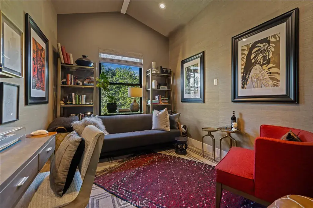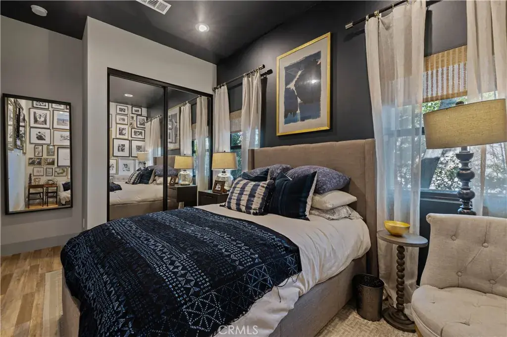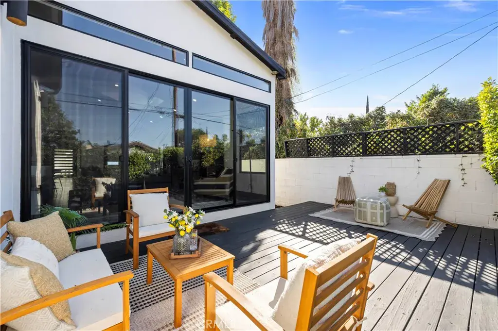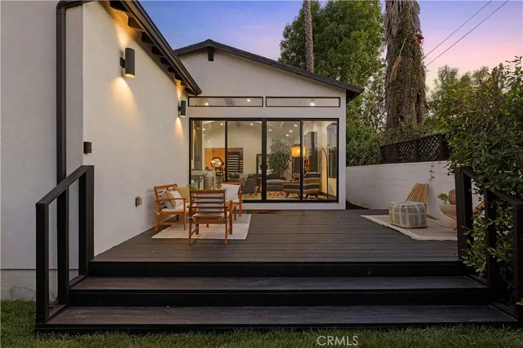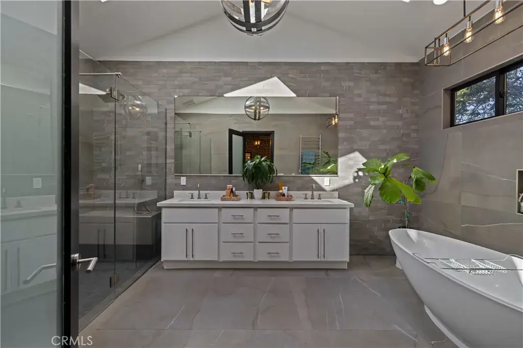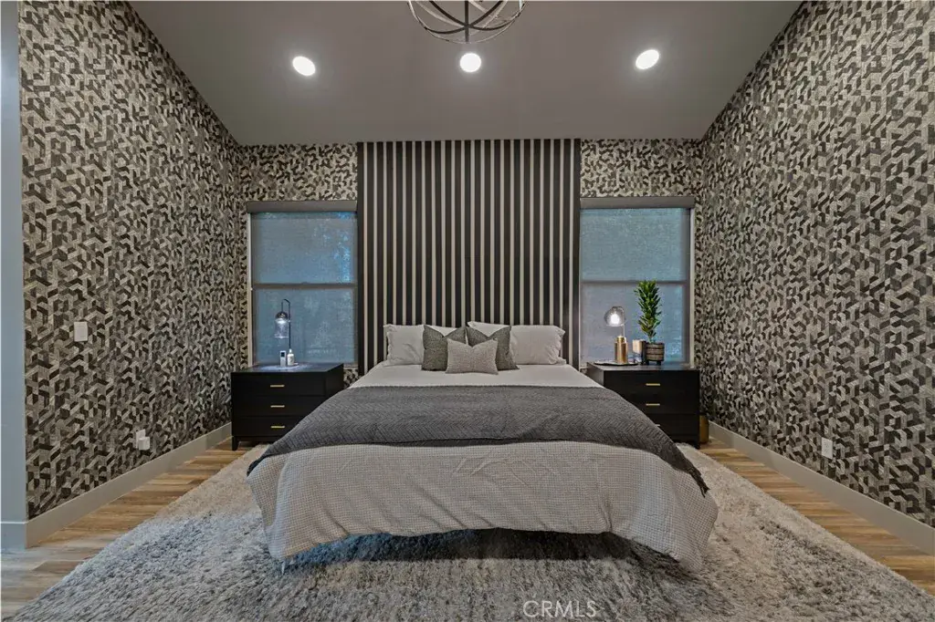 The primary suite is a private sanctuary, showcasing vaulted ceilings, exquisite wallpaper, and an elegant accent wall behind the bed. Dual walk-in closets with custom built-ins offer exceptional storage, while the lavish primary bathroom exudes spa-like tranquility. Featuring a dual vanity, an oversized shower with double rain shower heads and two hand sprayers, a large soaking tub, a wall-mounted towel warmer, and four skylights complemented by recessed lighting and accent chandeliers, this space is designed for ultimate relaxation. Additional accommodations include beautifully finished secondary bedrooms with large closets, a stylish half bathroom with an accent tile wall, and a secondary full bathroom featuring rain shower heads and a hand sprayer. A secluded guest suite provides flexibility for use as an office, playroom, or additional bedroom, complete with its own designer bathroom and walk-in shower. Step outside to a private backyard retreat featuring a wood deck and freshly landscaped grounds—an ideal space for outdoor entertaining or peaceful relaxation. This home perfectly blends sophisticated design with thoughtful technology, featuring a full suite of smart features including app-controlled security, video doorbells, smart thermostat, lighting, irrigation, and appliances. With voice assistant integration, enterprise-grade Wi-Fi, and universal smartphone control, this home is fully connected and future-ready.