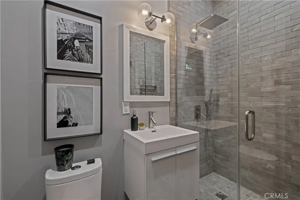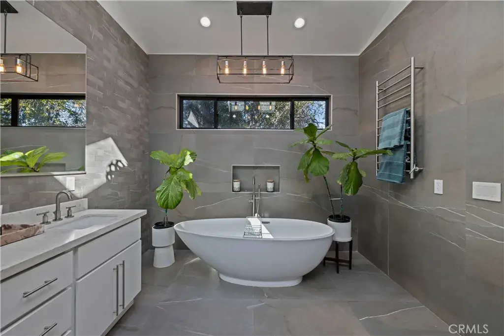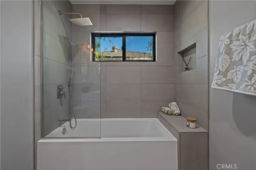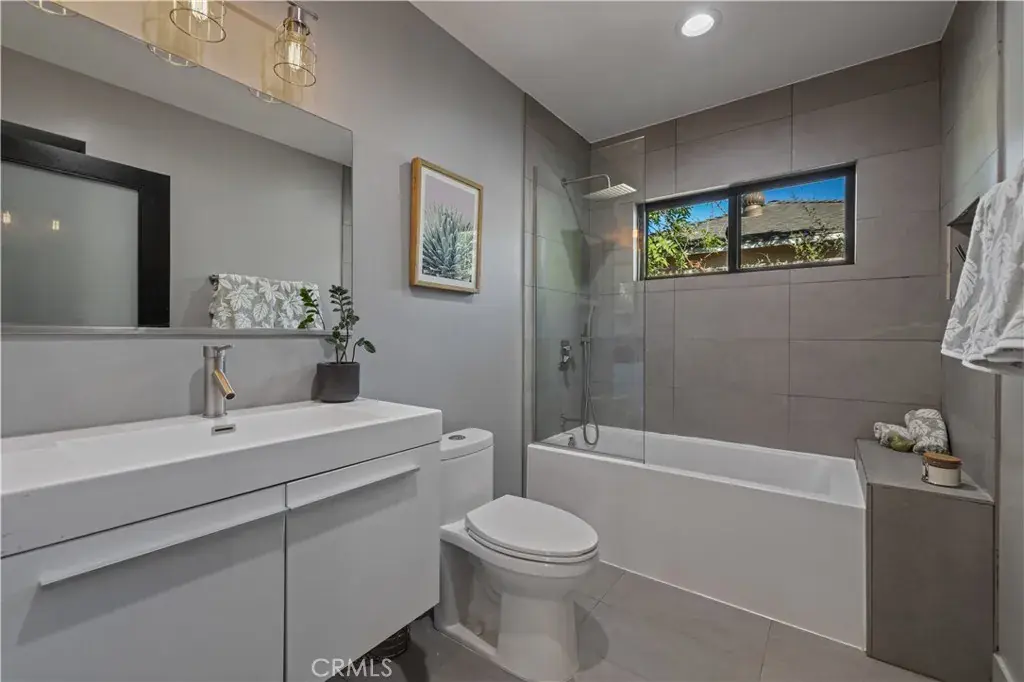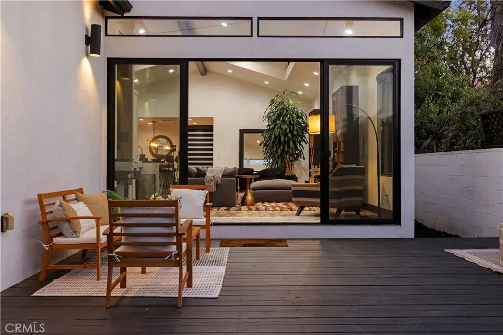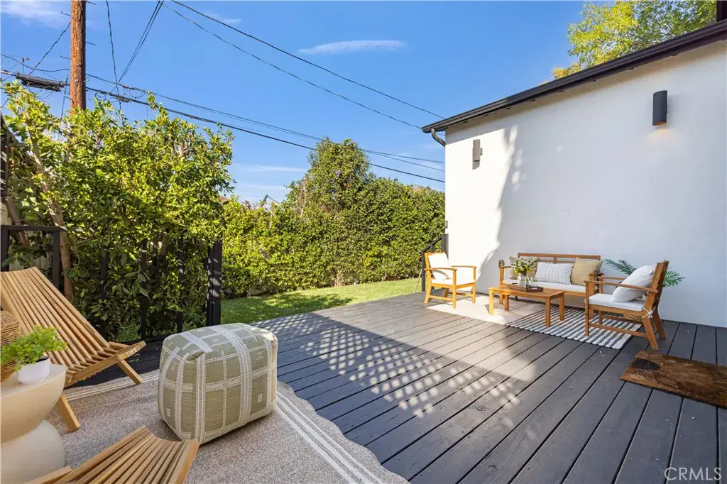 The primary suite is a private sanctuary, showcasing vaulted ceilings, exquisite wallpaper, and an elegant accent wall behind the bed. Dual walk-in closets with custom built-ins offer exceptional storage, while the lavish primary bathroom exudes spa-like tranquility. Featuring a dual vanity, an oversized shower with double rain shower heads and two hand sprayers, a large soaking tub, a wall-mounted towel warmer, and four skylights complemented by recessed lighting and accent chandeliers, this space is designed for ultimate relaxation. Additional accommodations include beautifully finished secondary bedrooms with large closets, a stylish half bathroom with an accent tile wall, and a secondary full bathroom featuring rain shower heads and a hand sprayer. A secluded guest suite provides flexibility for use as an office, playroom, or additional bedroom, complete with its own designer bathroom and walk-in shower. Step outside to a private backyard retreat featuring a wood deck and freshly landscaped grounds—an ideal space for outdoor entertaining or peaceful relaxation. This home perfectly blends sophisticated design with thoughtful technology, featuring a full suite of smart features including app-controlled security, video doorbells, smart thermostat, lighting, irrigation, and appliances. With voice assistant integration, enterprise-grade Wi-Fi, and universal smartphone control, this home is fully connected and future-ready.