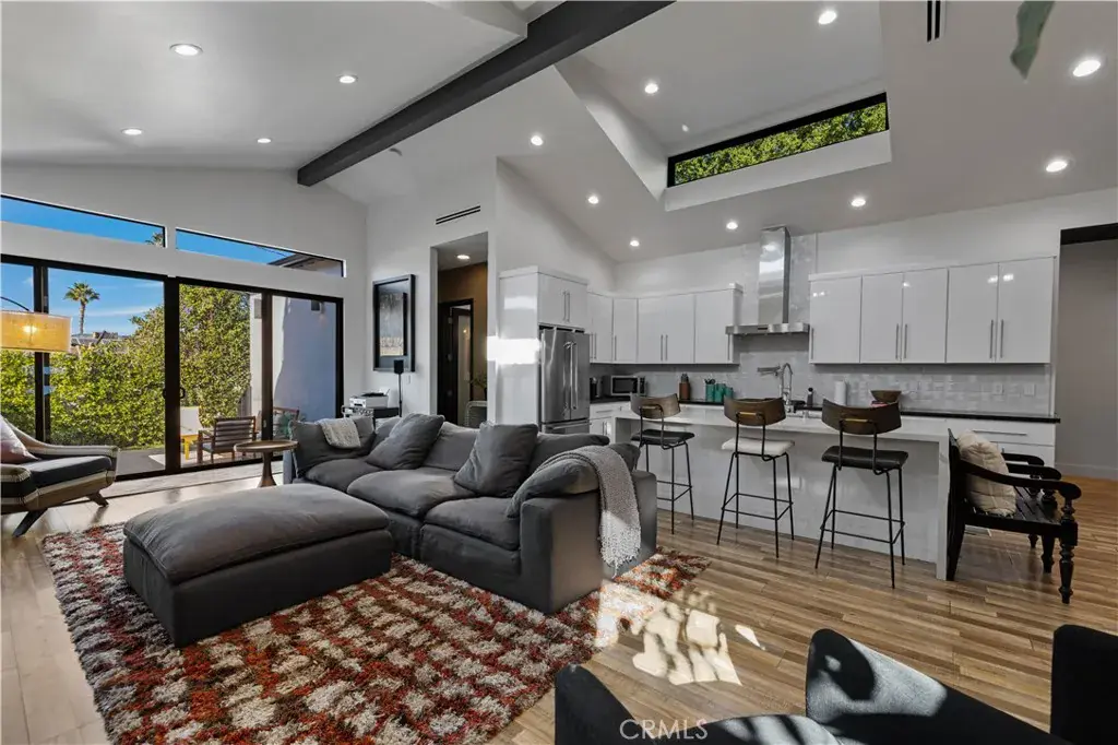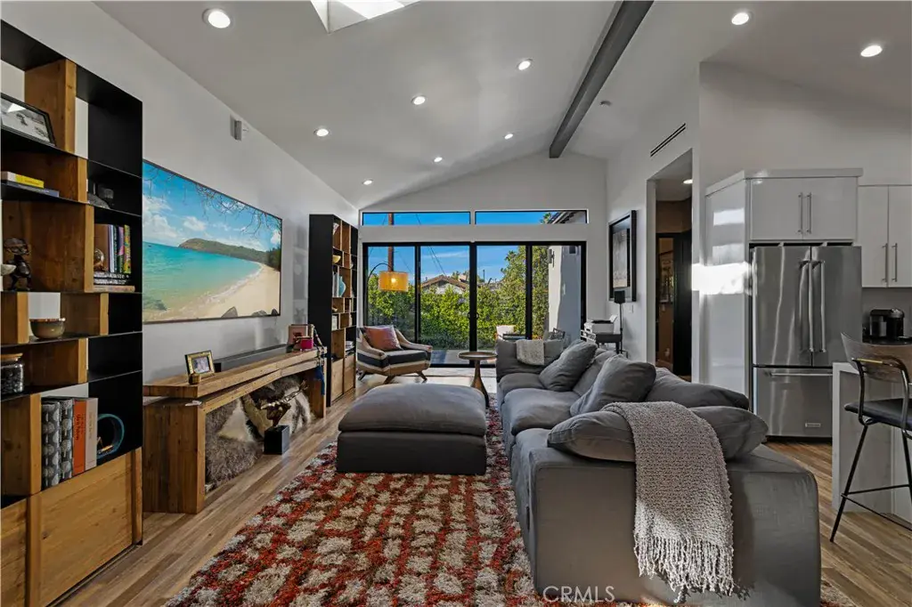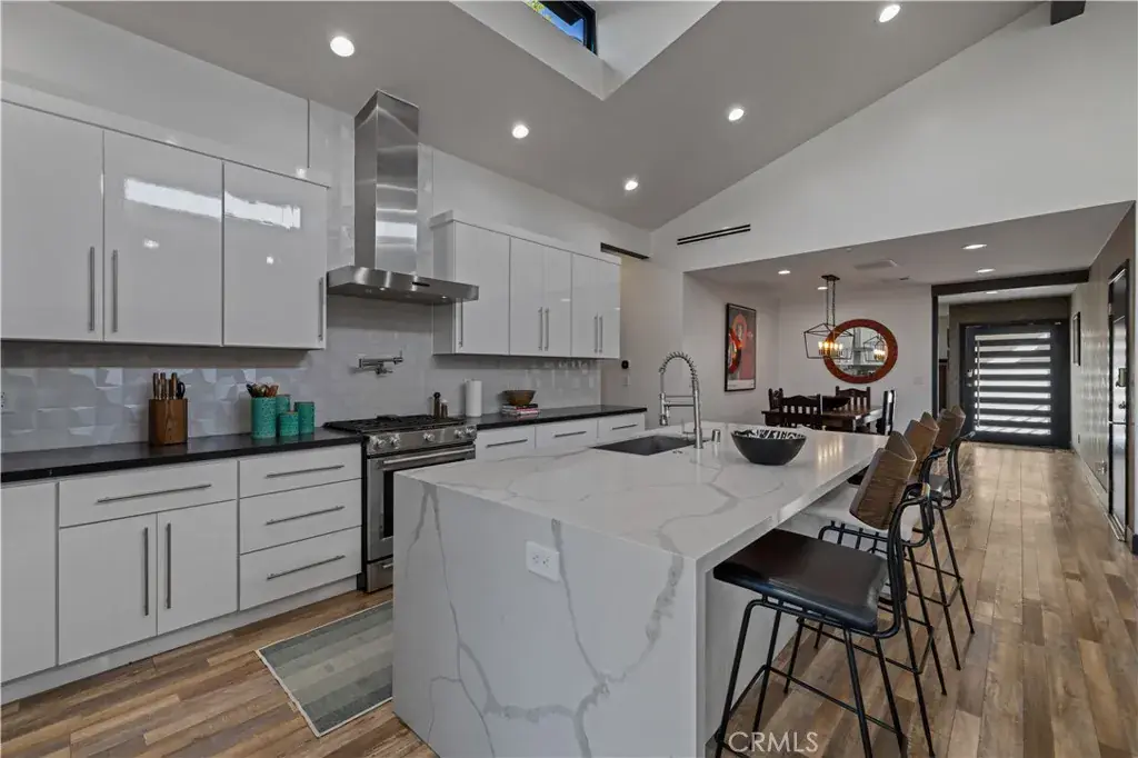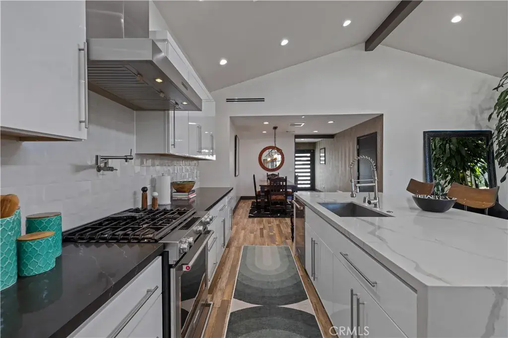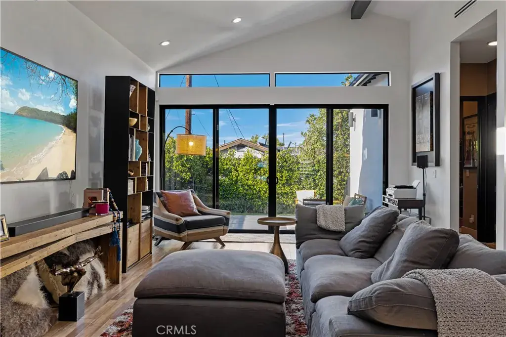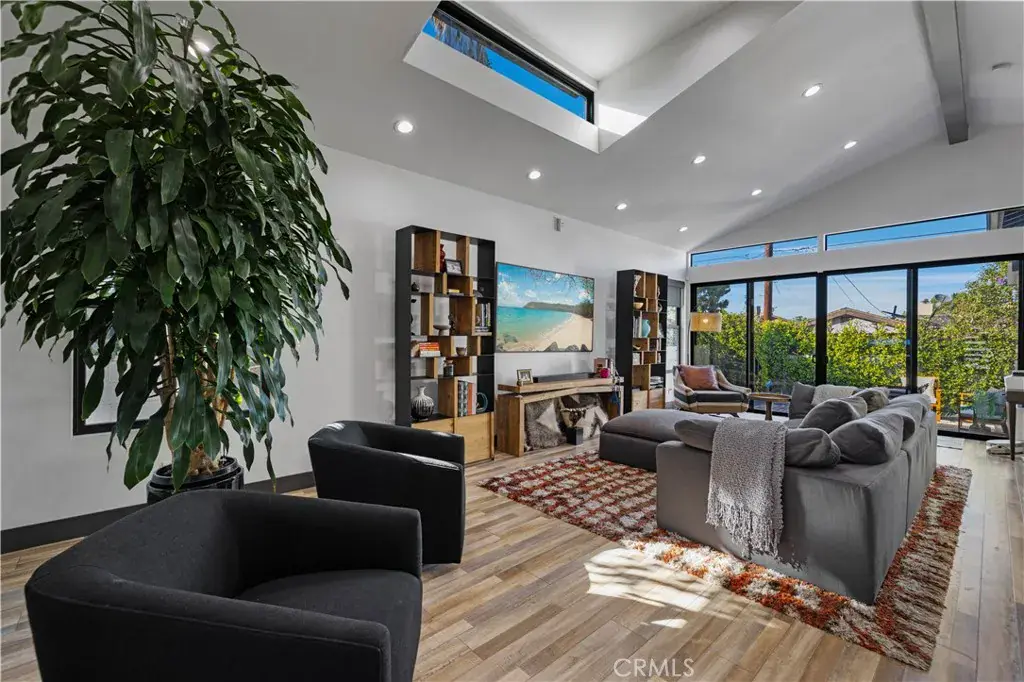 Welcome to 17929 Martha Street, an exquisite smart home where comfort, sophistication, and style are paramount. From the moment you arrive, thoughtfully curated finishes and designer touches elevate every space. The formal living room, overlooking the lush front yard, offers a calm and inviting setting for guests, while a large barn door provides a seamless transition between this cozy retreat and the expansive great room. The great room serves as the heart of the home, creating an elegant setting for dinner parties and luxury entertaining. The large kitchen is a true centerpiece, featuring abundant cabinetry, striking black quartz countertops, and an oversized waterfall island with seating for up to six. A pot filler above the stove adds both convenience and a touch of modern luxury. The expansive family room is flooded with natural light, highlighted by vaulted ceilings, large picture windows, dormer windows, and stationary glass panels that frame wall-to-wall sliders—perfectly blending indoor and outdoor living.