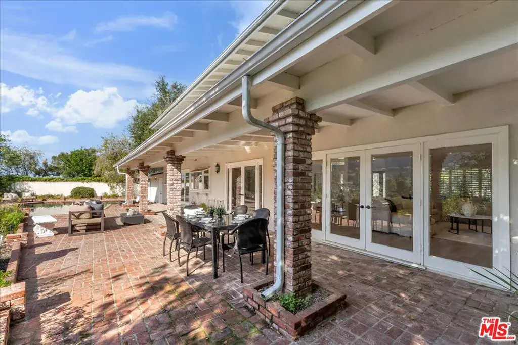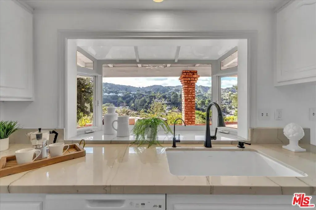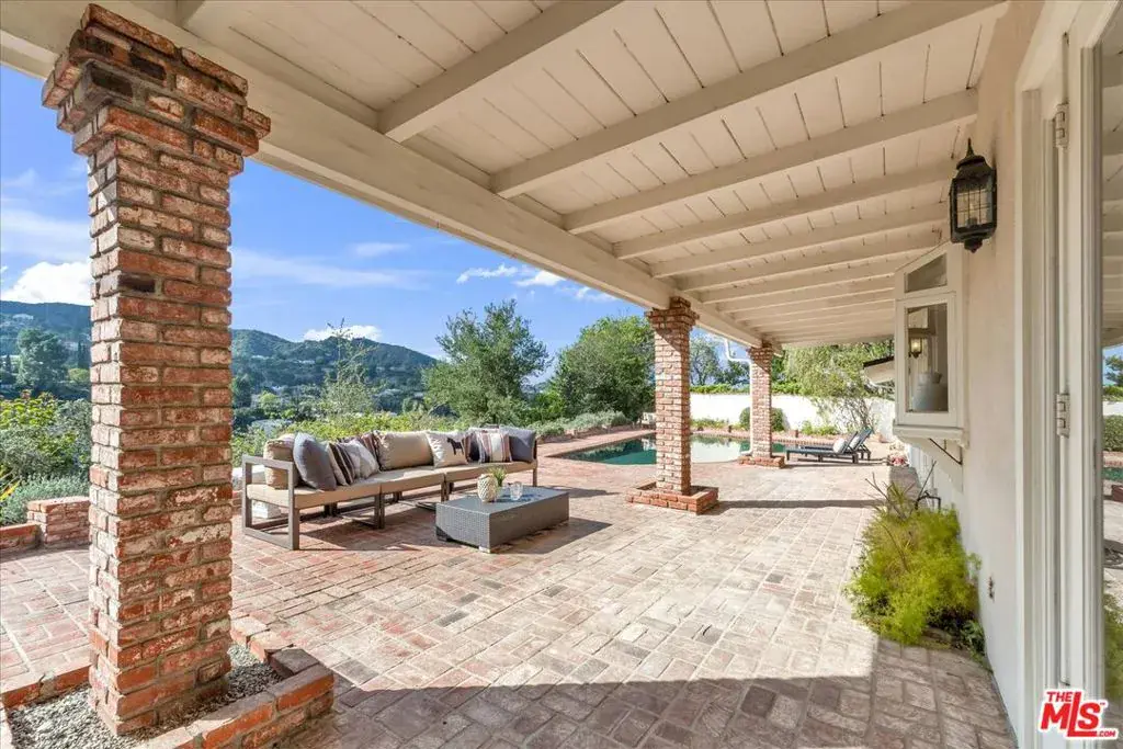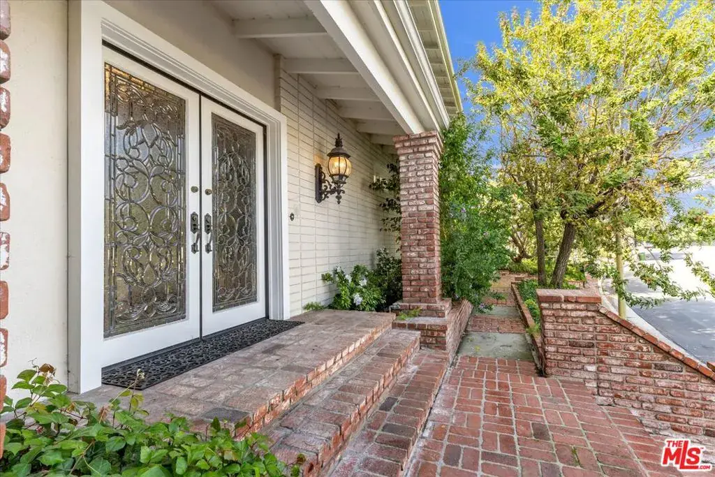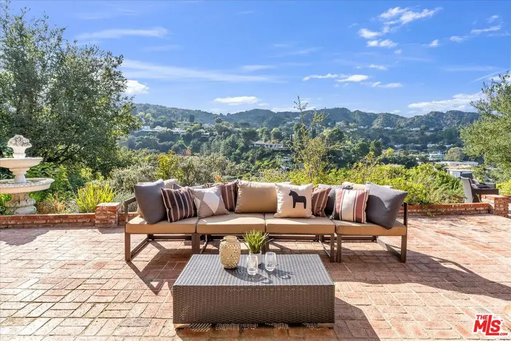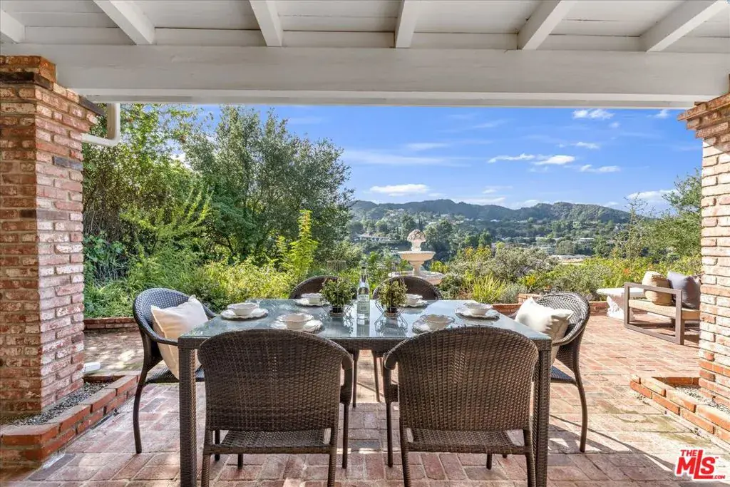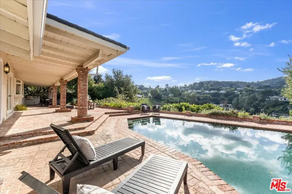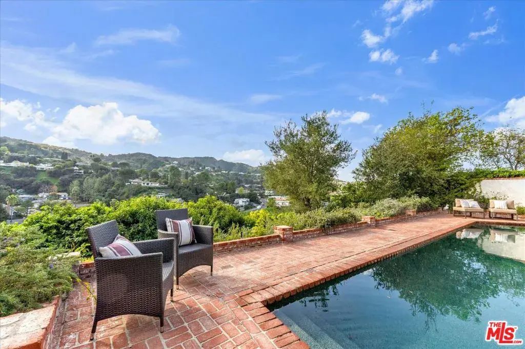 Located at the pinnacle of prestigious Encino Hills, just moments from iconic Mulholland Drive, this beautifully reimagined approximately 3,000 sq ft transitional residence sits within the highly desirable Lanai Road Charter School District and is surrounded by multi million dollar estates. Striking curb appeal welcomes you with a charming used-brick driveway and walkway, mature landscaping, and an inviting presence. A dramatic two-story entry opens to light-filled living spaces including a formal living room with fireplace, formal dining area, and an updated kitchen featuring quartzite countertops, breakfast area, and expansive glass doors that create seamless indoor/outdoor flow. The private backyard is ideal for entertaining, offering a full size dark bottom pool, outdoor dining patio, lush grounds, and mountain, treetop, and Valley light views. A spacious family room with a second fireplace sits adjacent to the kitchen. The main level also includes two powder rooms, one with direct pool access, plus an oversized two car attached garage with storage room. Upstairs features four well-appointed bedrooms, all showcasing scenic views. The primary suite includes a sitting area, dual walk-in closets, and a spa inspired bath with dual vanities, soaking tub, and dedicated vanity area. Additional highlights include custom doors and windows, designer lighting, and newer luxury vinyl wood style flooring throughout. With easy Westside access, nearby hiking trails, and exceptional value, this Encino Hills home offers the perfect blend of privacy, comfort, and location.